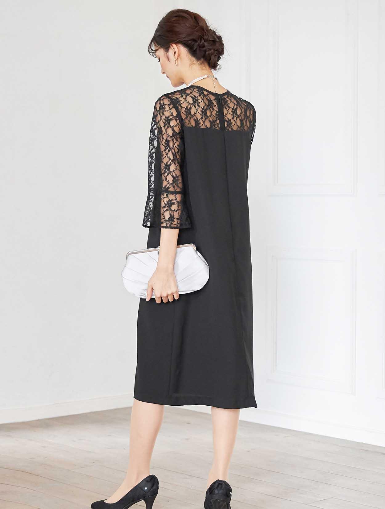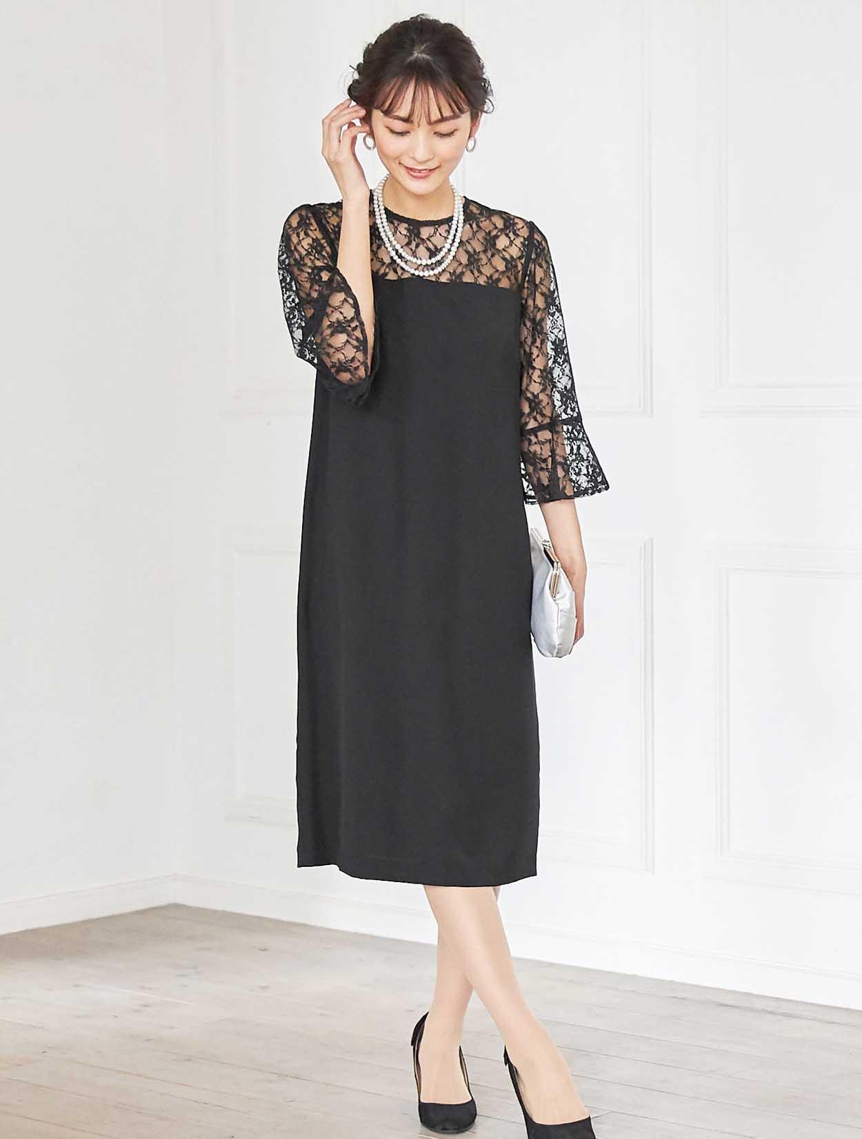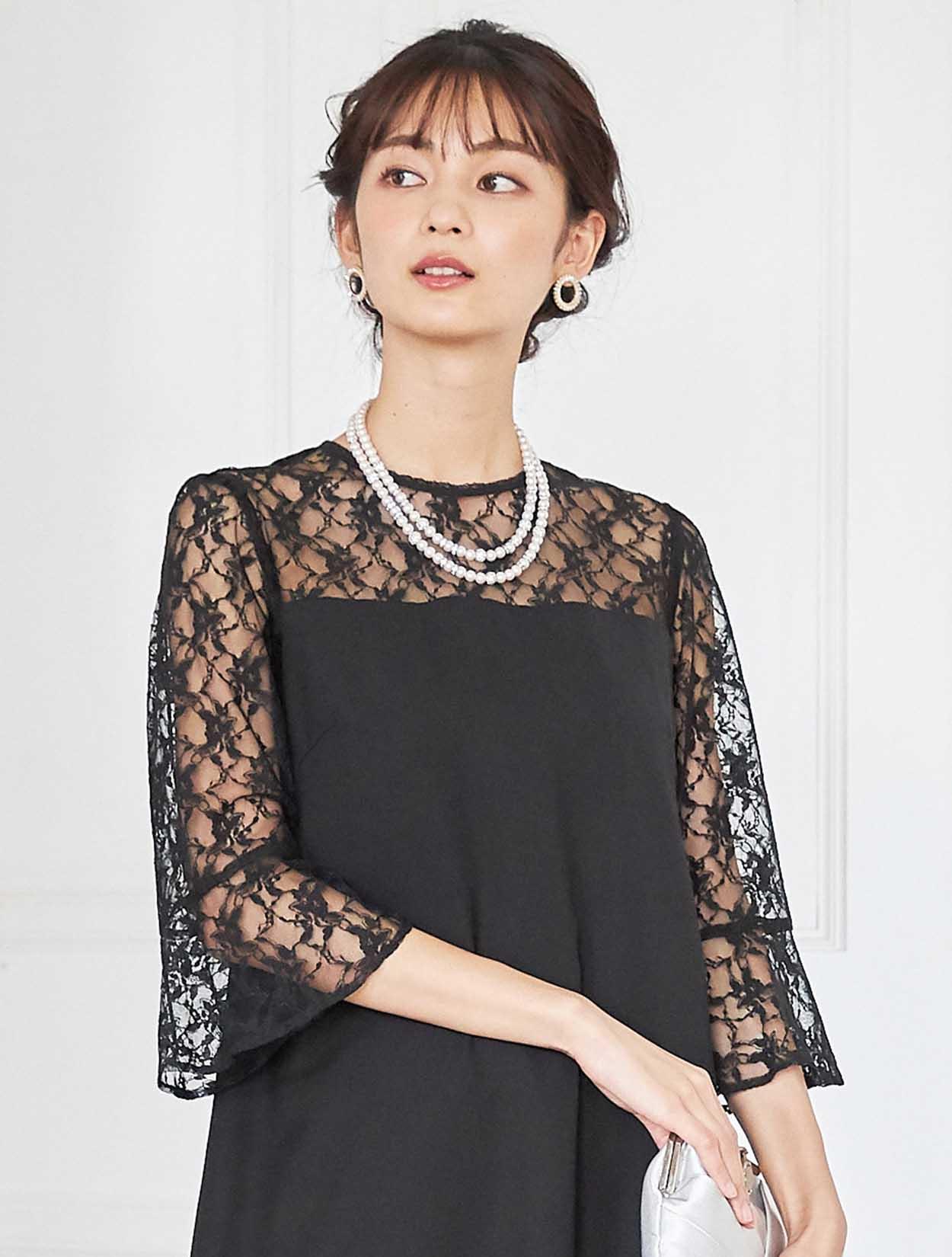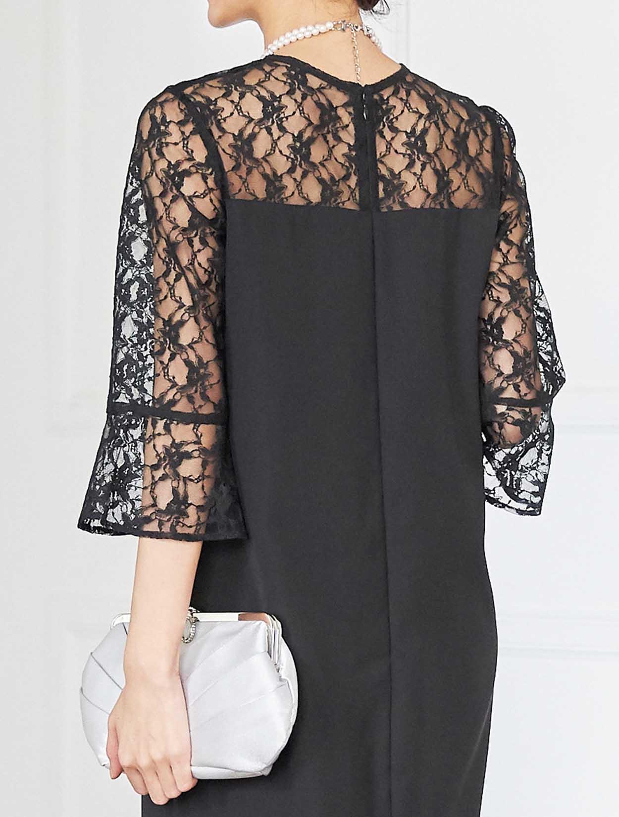 デコルテからお袖にかけての上品なレースが目を引くドレス。しっかりしたレースは高級感もあります。お袖は控えめなベルスリーブで、手首に向かって程よく広がるので腕を華奢に見せてくれます。ウエストに切り替えがないデザインで、緩やかな台形のトラペーズシルエットは、ナチュラルで大人っぽい印象に。丈は長めにとったミディ丈なので、しっかり膝を隠したい方はもちろん、意外にも小柄な方でも着こなしやすいドレスです。