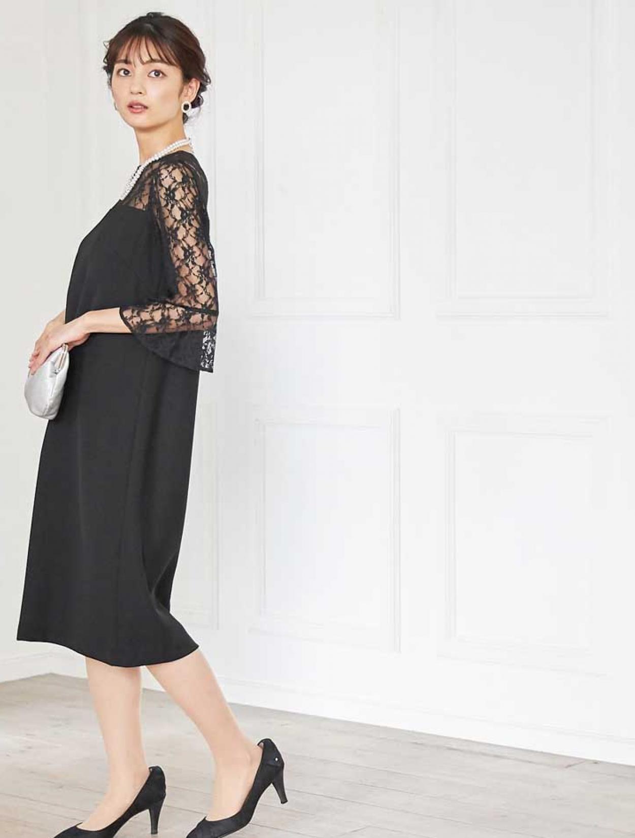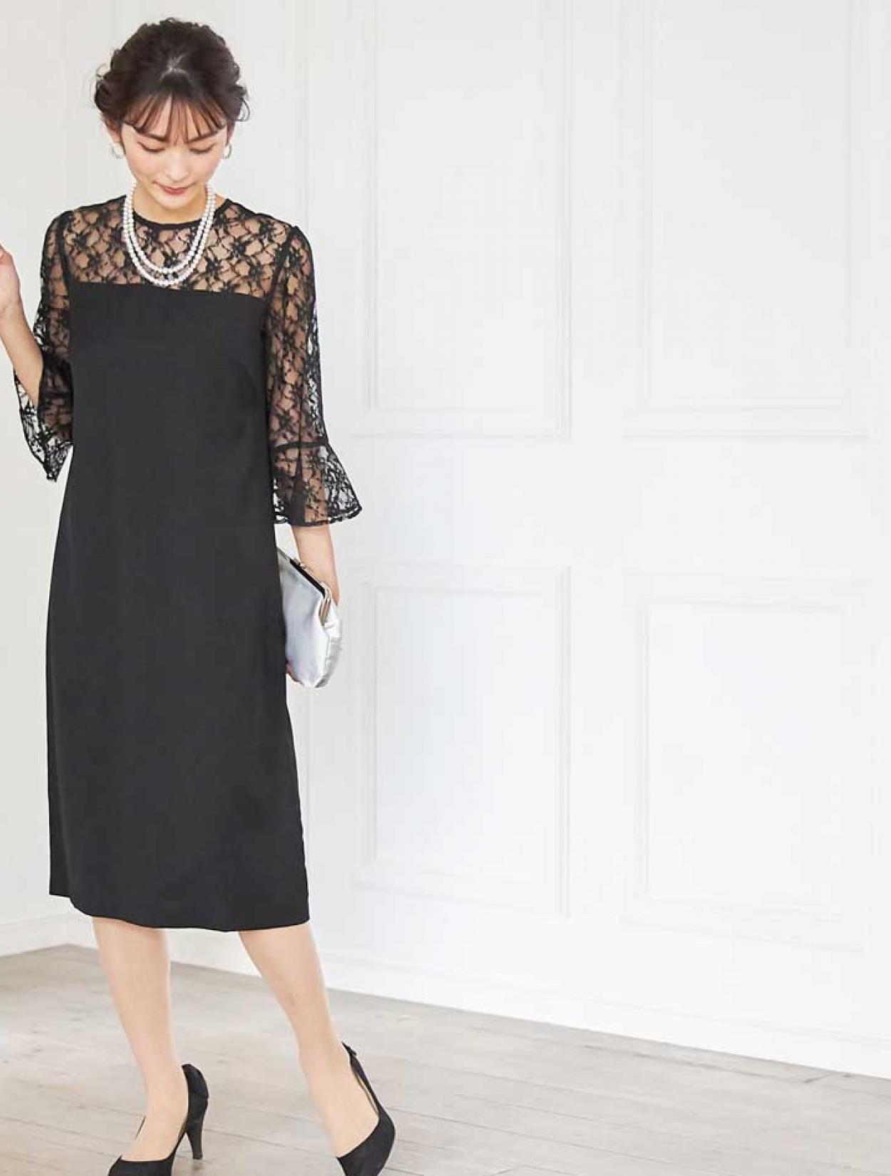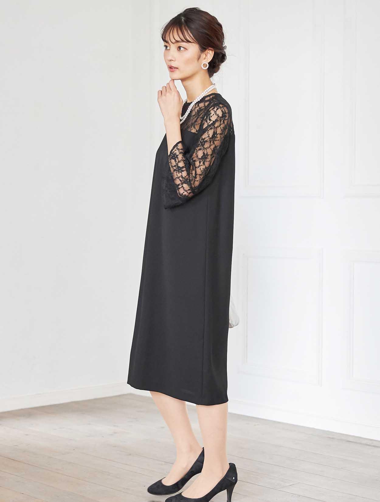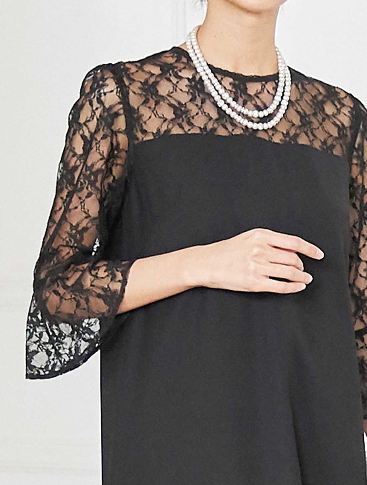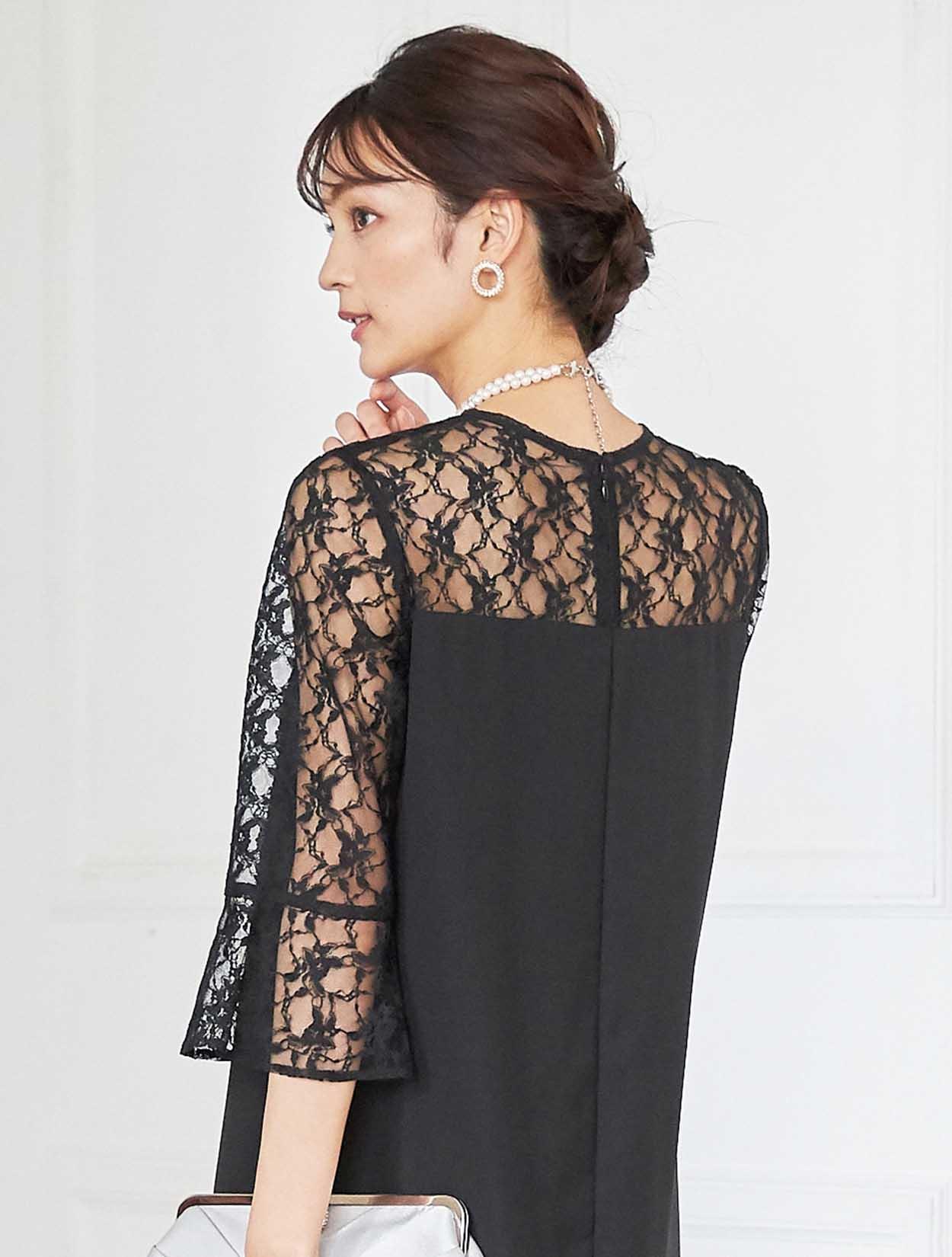 デコルテからお袖にかけての上品なレースが目を引くドレス。しっかりしたレースは高級感もあります。お袖は控えめなベルスリーブで、手首に向かって程よく広がるので腕を華奢に見せてくれます。ウエストに切り替えがないデザインで、緩やかな台形のトラペーズシルエットは、ナチュラルで大人っぽい印象に。丈は長めにとったミディ丈なので、しっかり膝を隠したい方はもちろん、意外にも小柄な方でも着こなしやすいドレスです。