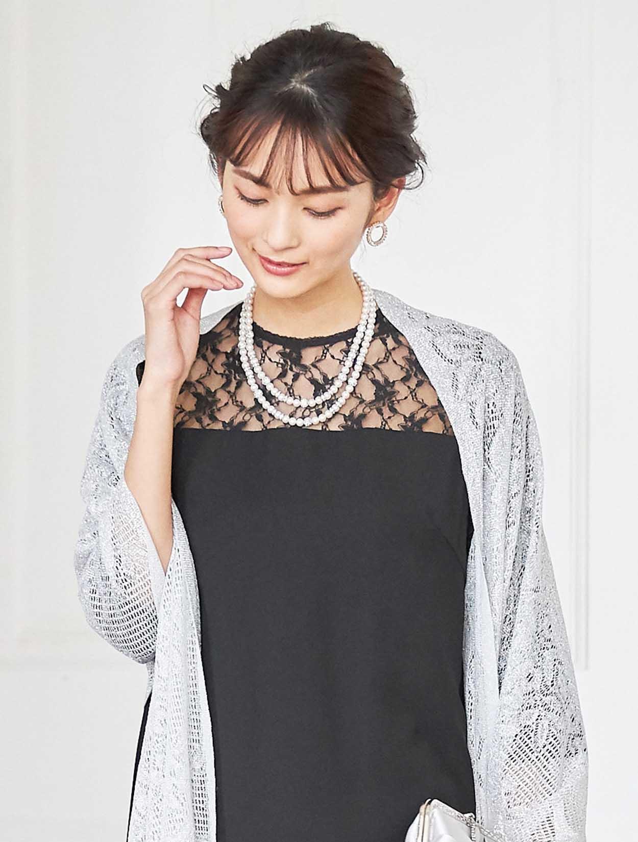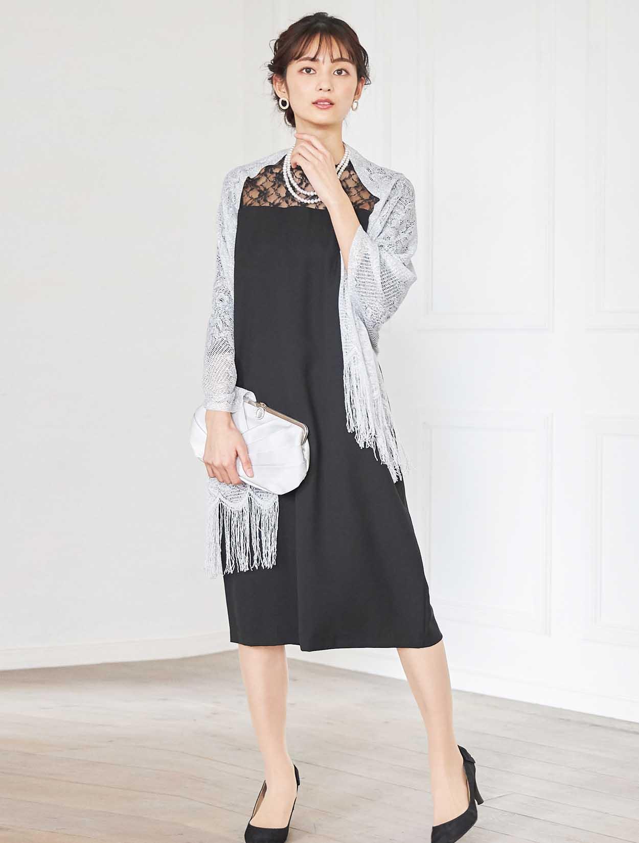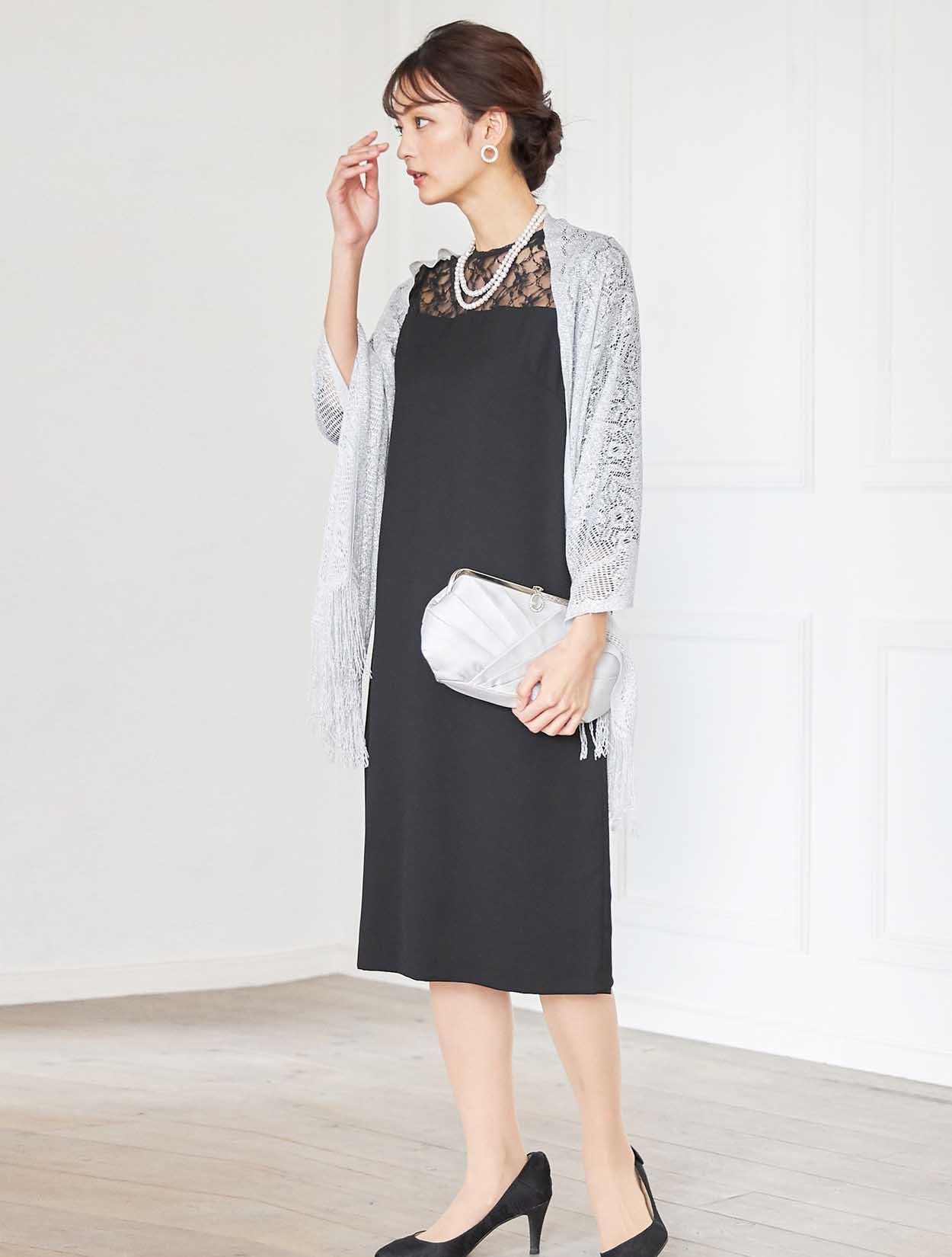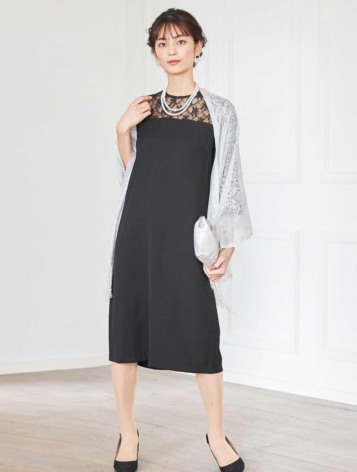 デコルテが綺麗に見えるブラックドレスでエレガントなコーディネート。重たい印象にならないように、輝きのあるシルバー系の小物を合わせ華やかな席にもぴったりです。