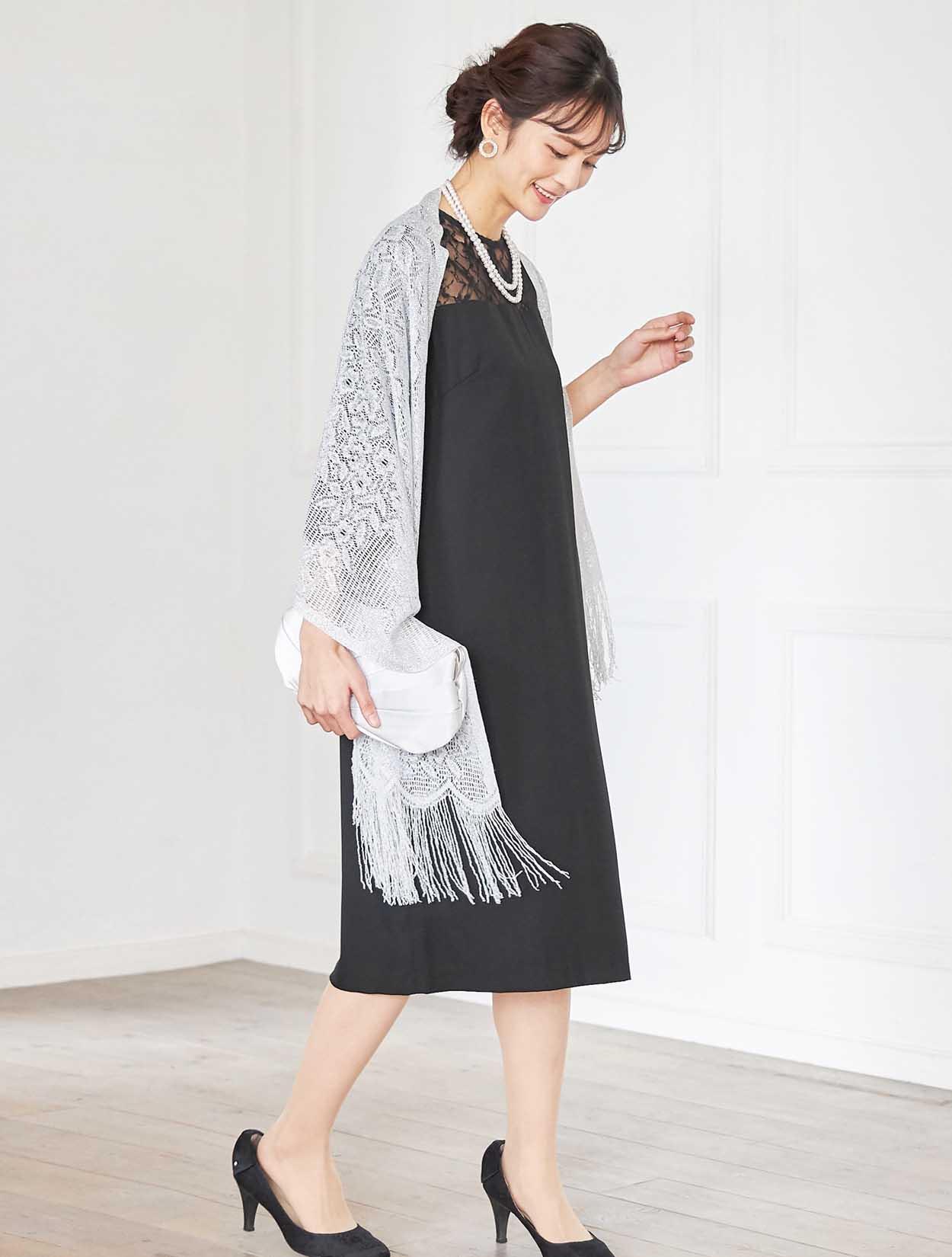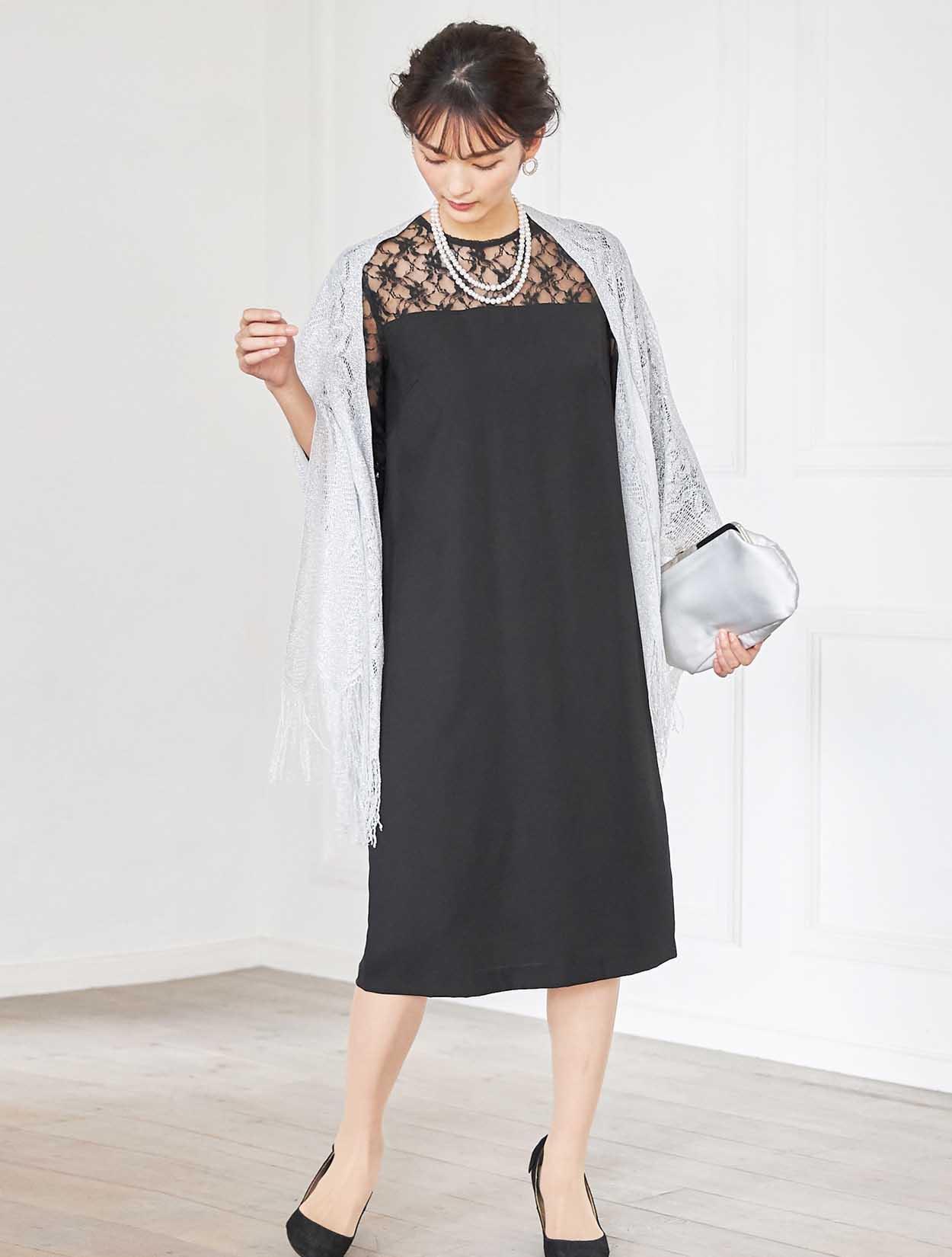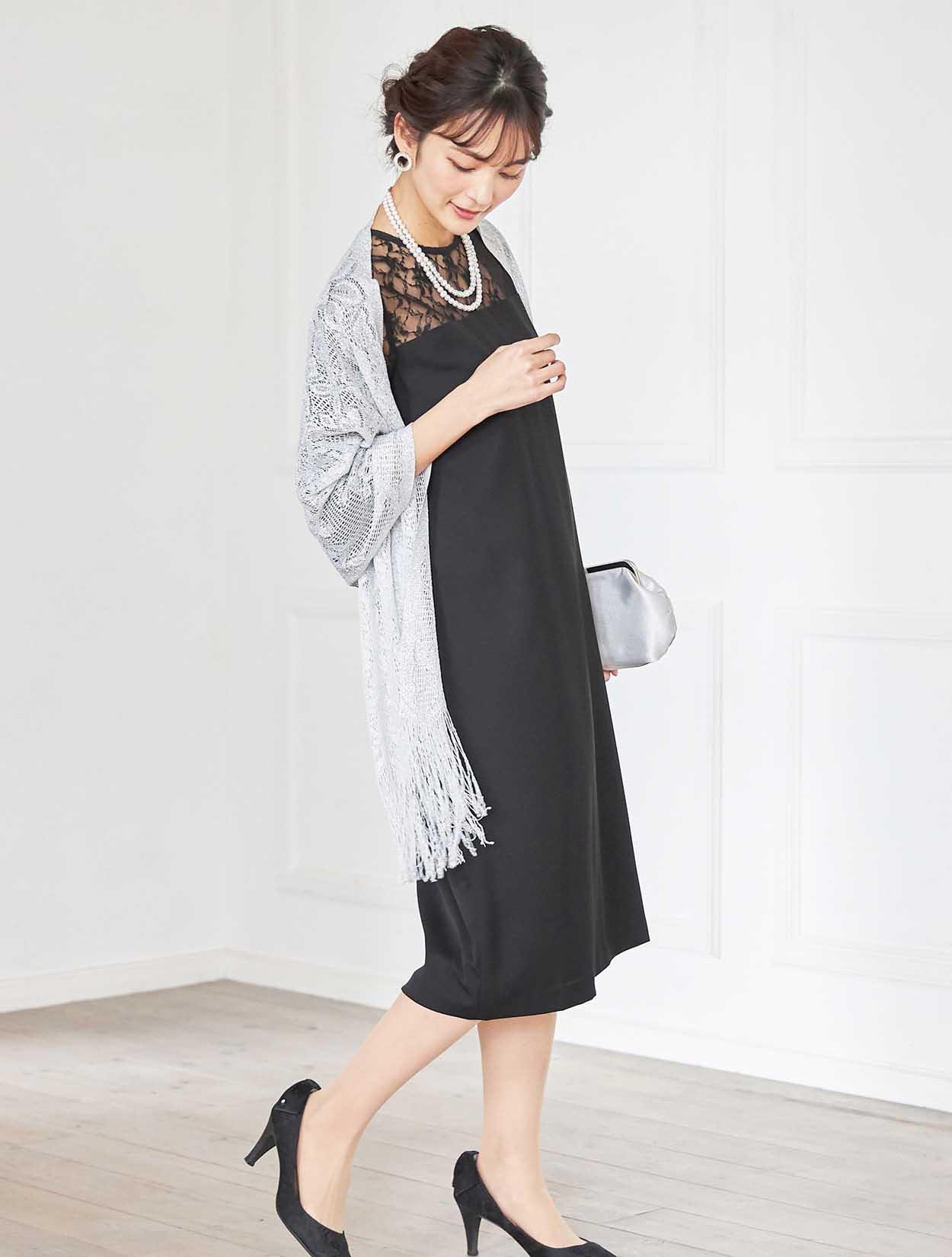 デコルテが綺麗に見えるブラックドレスでエレガントなコーディネート。重たい印象にならないように、輝きのあるシルバー系の小物を合わせ華やかな席にもぴったりです。