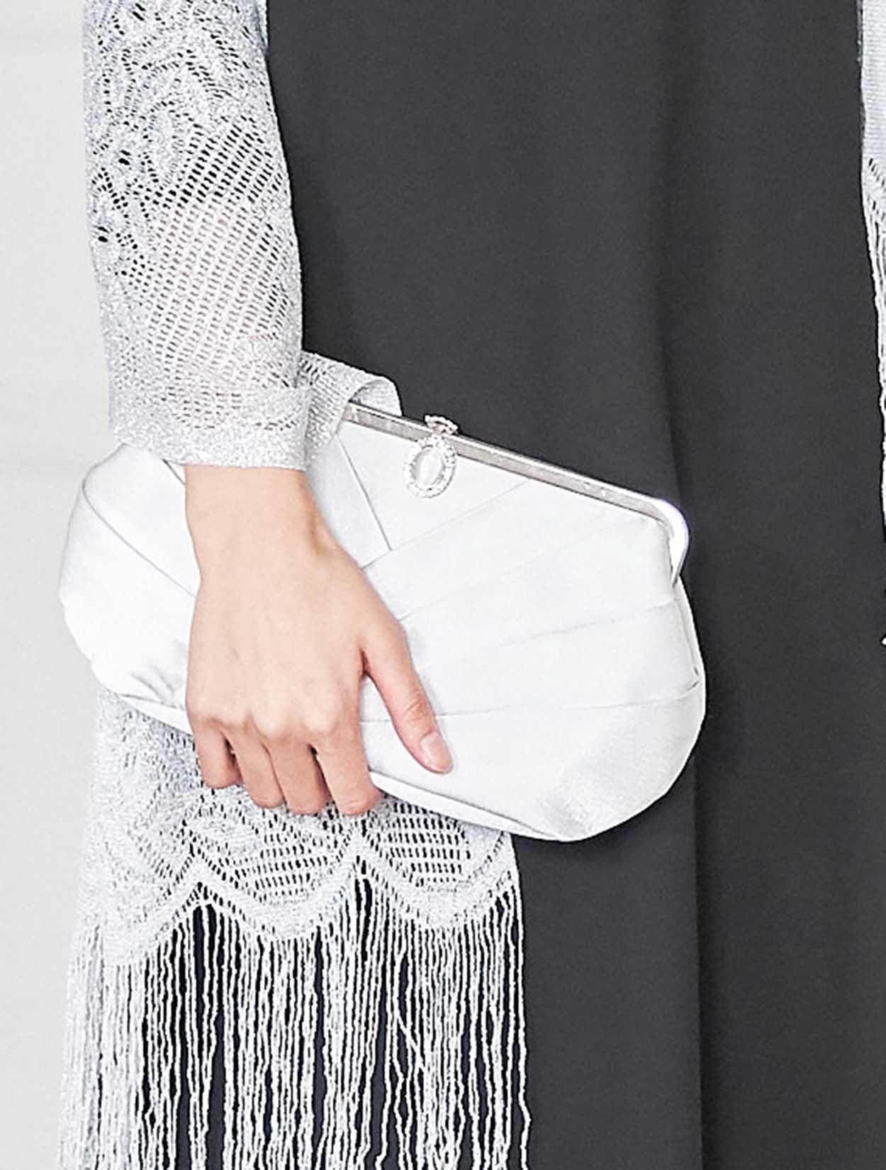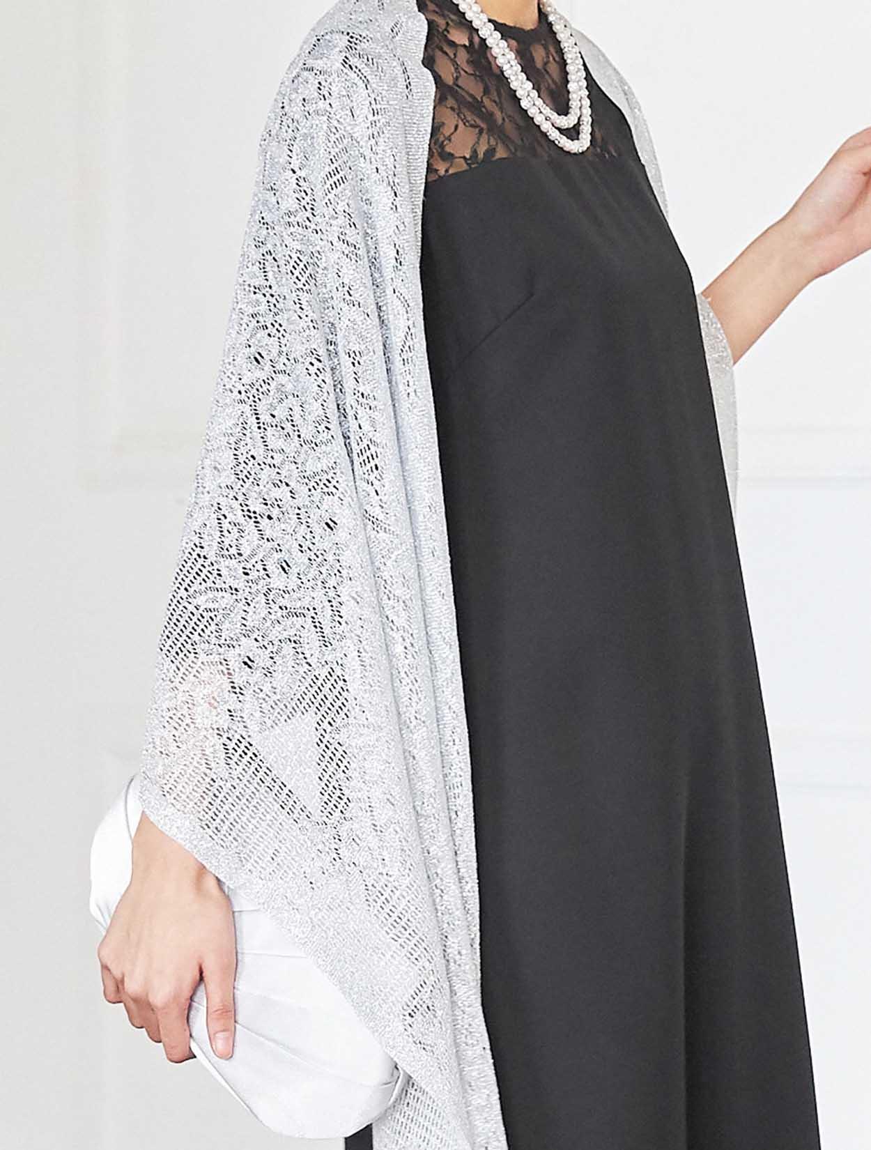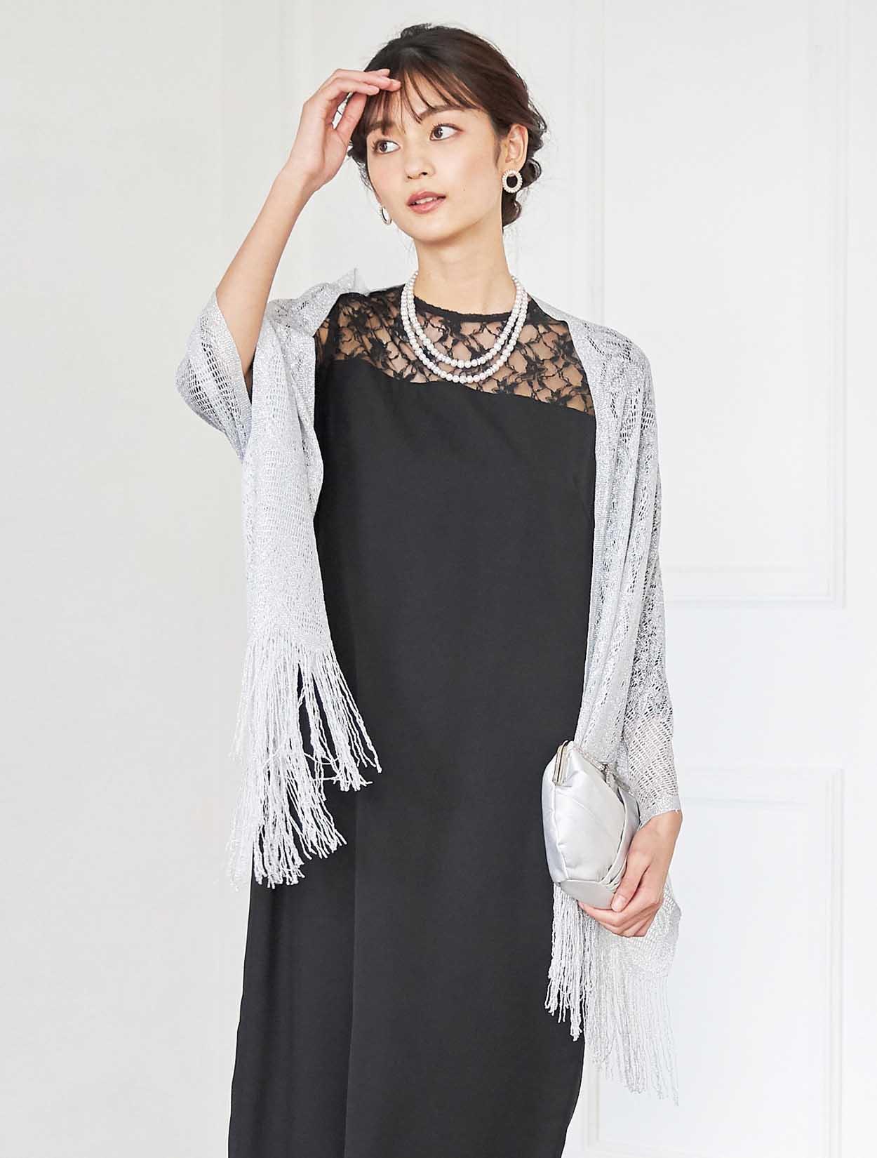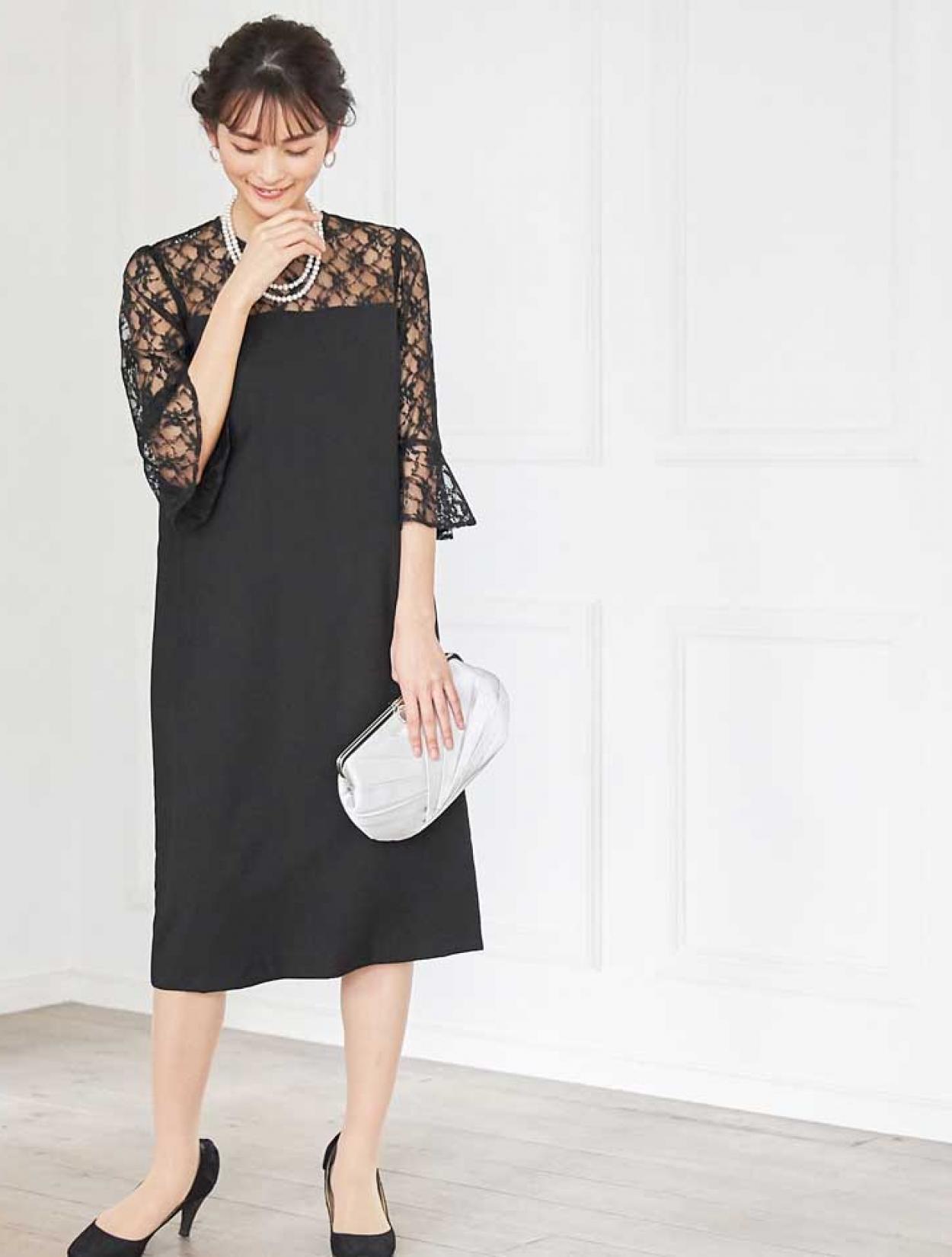 デコルテが綺麗に見えるブラックドレスでエレガントなコーディネート。重たい印象にならないように、輝きのあるシルバー系の小物を合わせ華やかな席にもぴったりです。