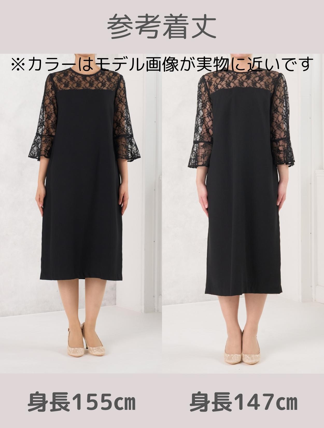 デコルテからお袖にかけての上品なレースが目を引くドレス。しっかりしたレースは高級感もあります。お袖は控えめなベルスリーブで、手首に向かって程よく広がるので腕を華奢に見せてくれます。ウエストに切り替えがないデザインで、緩やかな台形のトラペーズシルエットは、ナチュラルで大人っぽい印象に。丈は長めにとったミディ丈なので、しっかり膝を隠したい方はもちろん、意外にも小柄な方でも着こなしやすいドレスです。