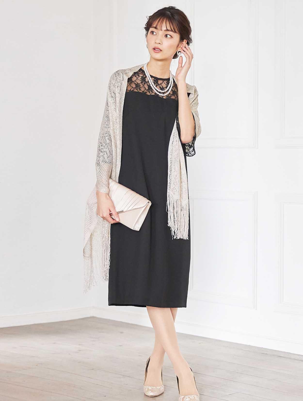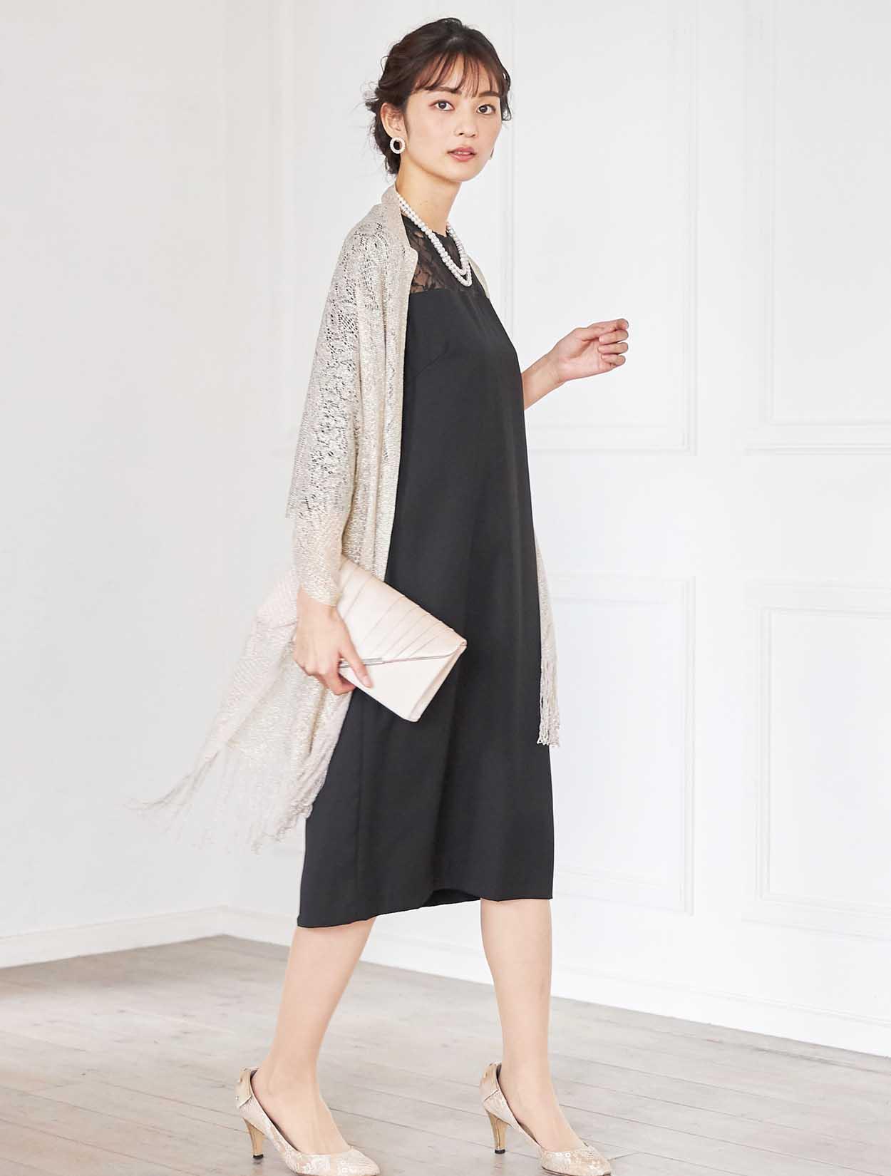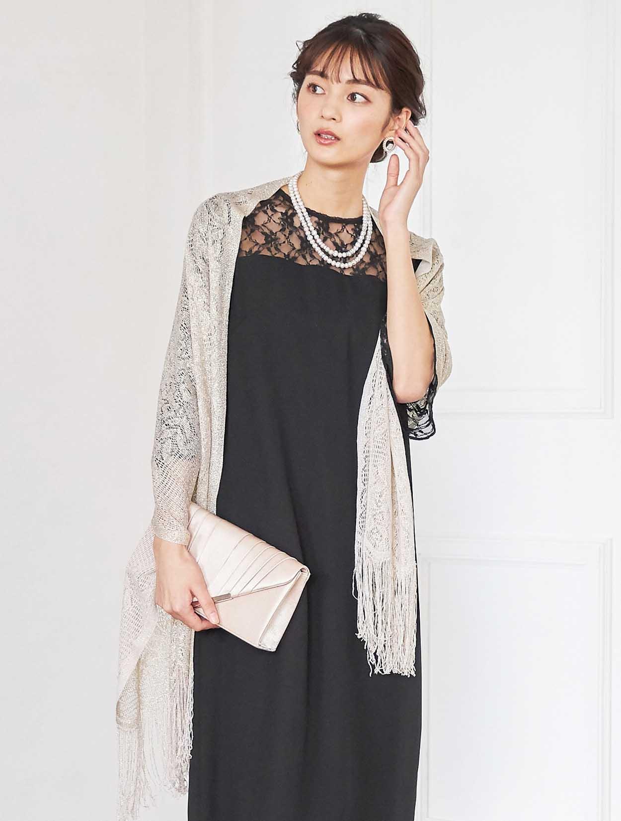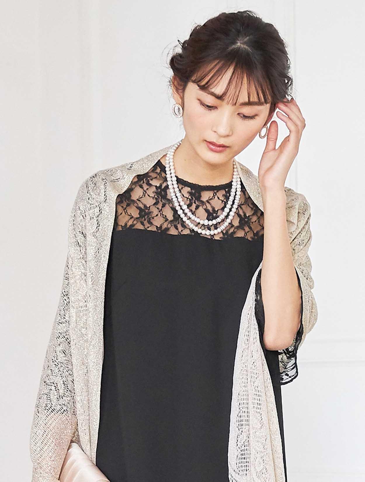 シックな印象を演出してくれるコーディネート。どんな小物や羽織物とも相性の良いブラックカラードレスは、上品なラ感のストールと合わせ華やかなお呼ばれ仕様に変身。ネックレスはシンプルな2連ネックレスなので、大ぶりのピアスを付けて頂いても派手過ぎず決まります。