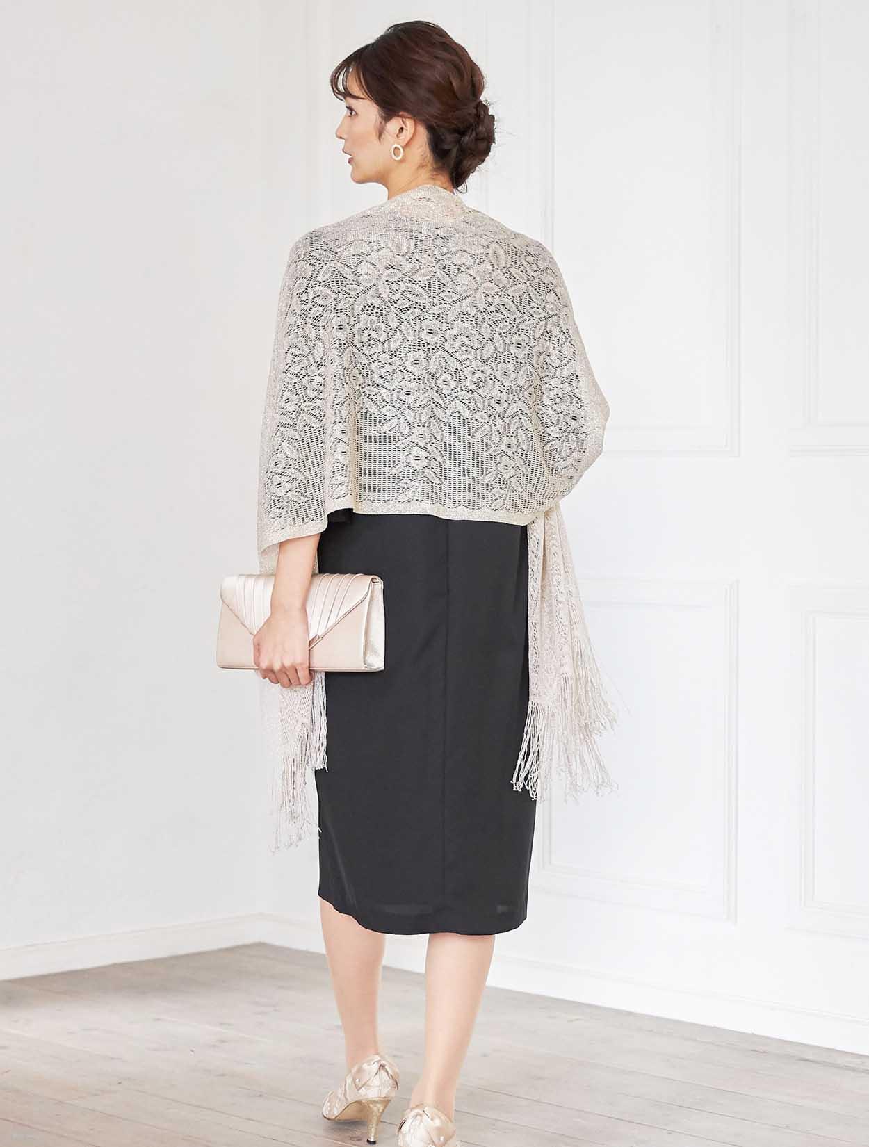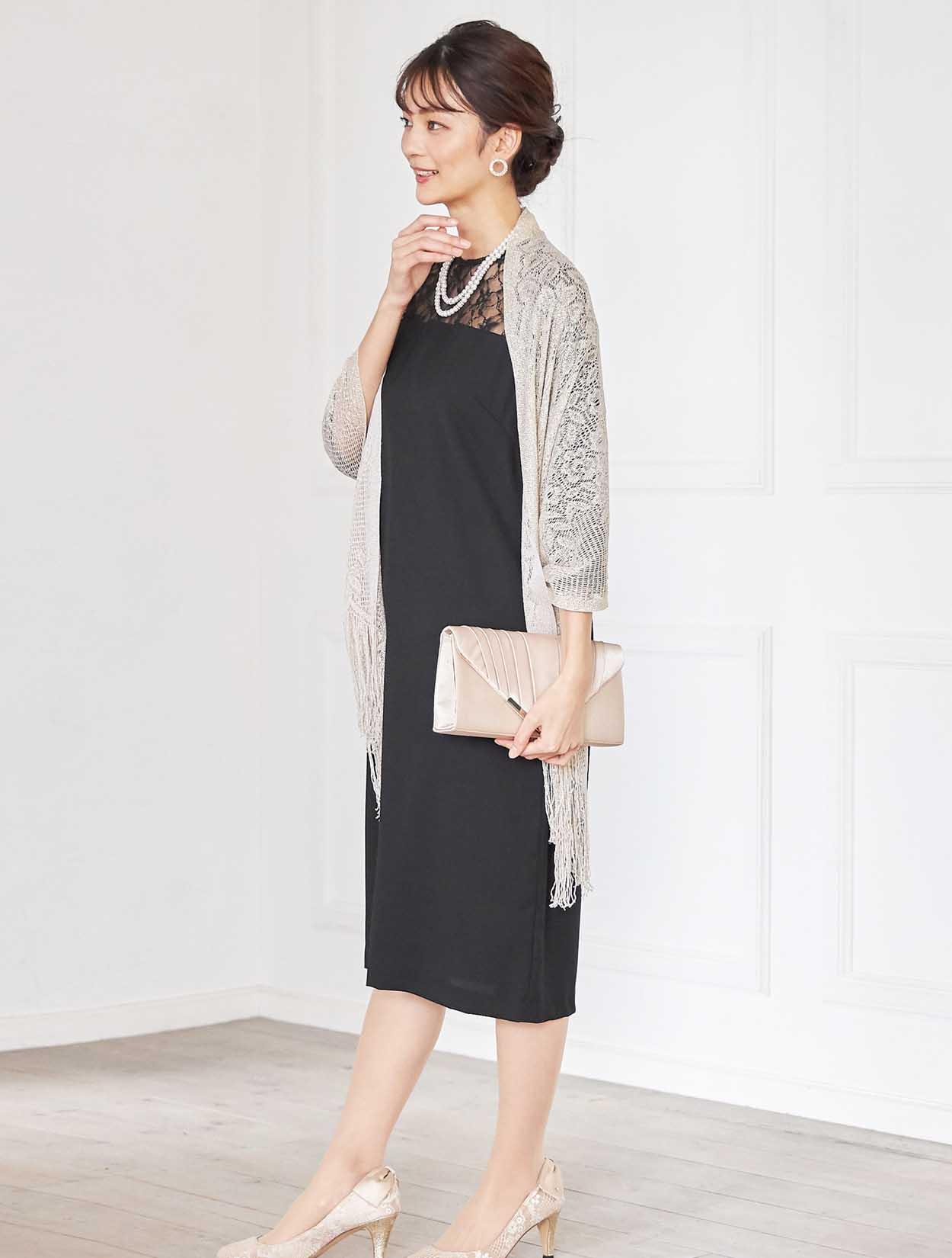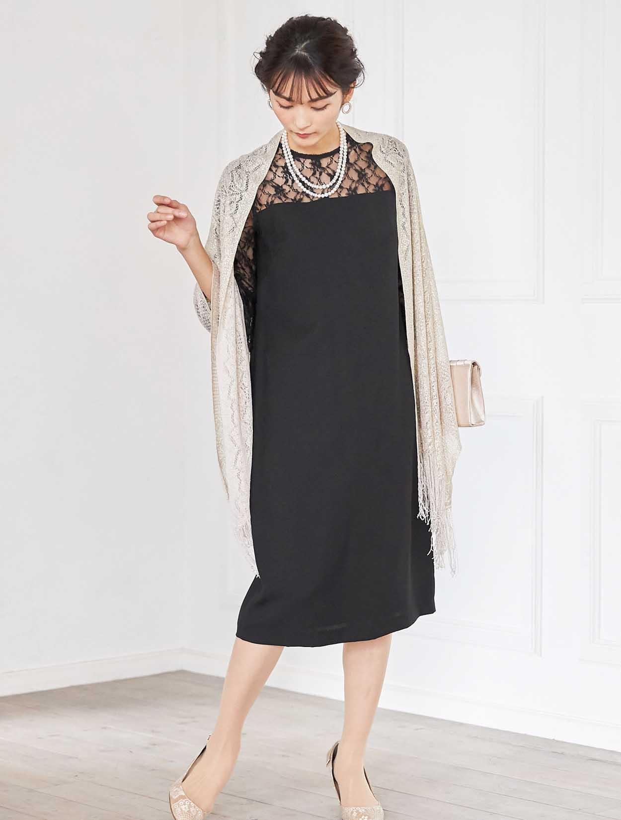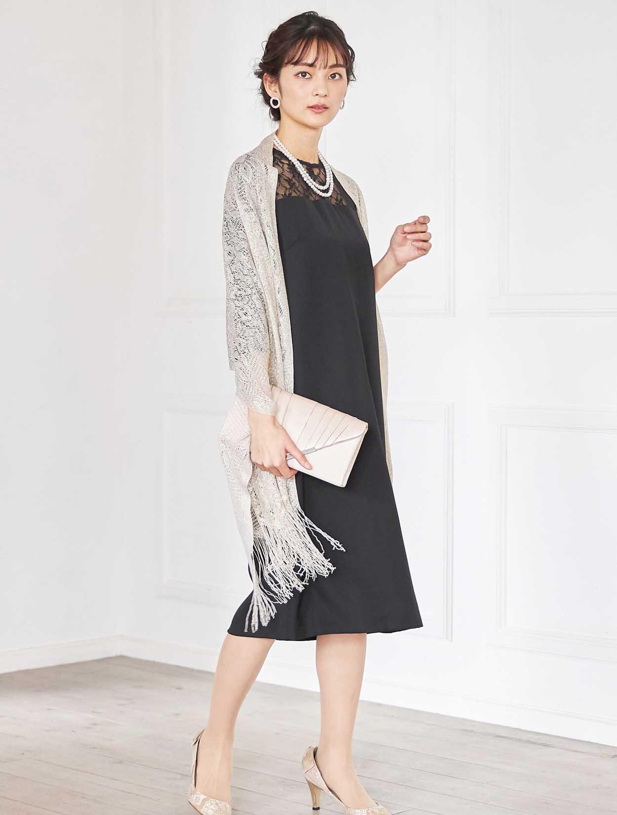 シックな印象を演出してくれるコーディネート。どんな小物や羽織物とも相性の良いブラックカラードレスは、上品なラ感のストールと合わせ華やかなお呼ばれ仕様に変身。ネックレスはシンプルな2連ネックレスなので、大ぶりのピアスを付けて頂いても派手過ぎず決まります。
