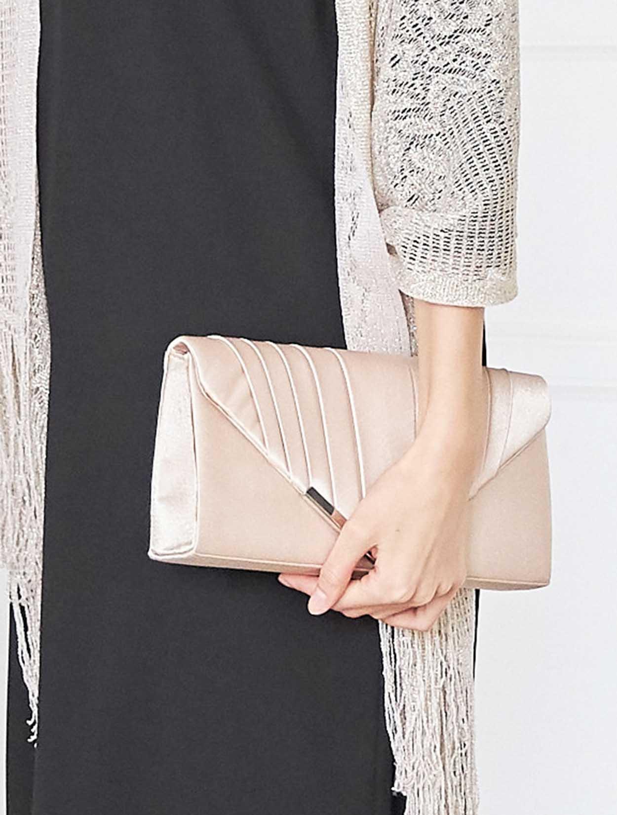 大人っぽい直線的なラインのドレスなので、ヘアはゆるふわのシニヨンスタイルで女性らしさを出すと◎。足元はすっきりしているので、ハーフアップにして首まわりに少しボリュームを出すのもおすすめです。