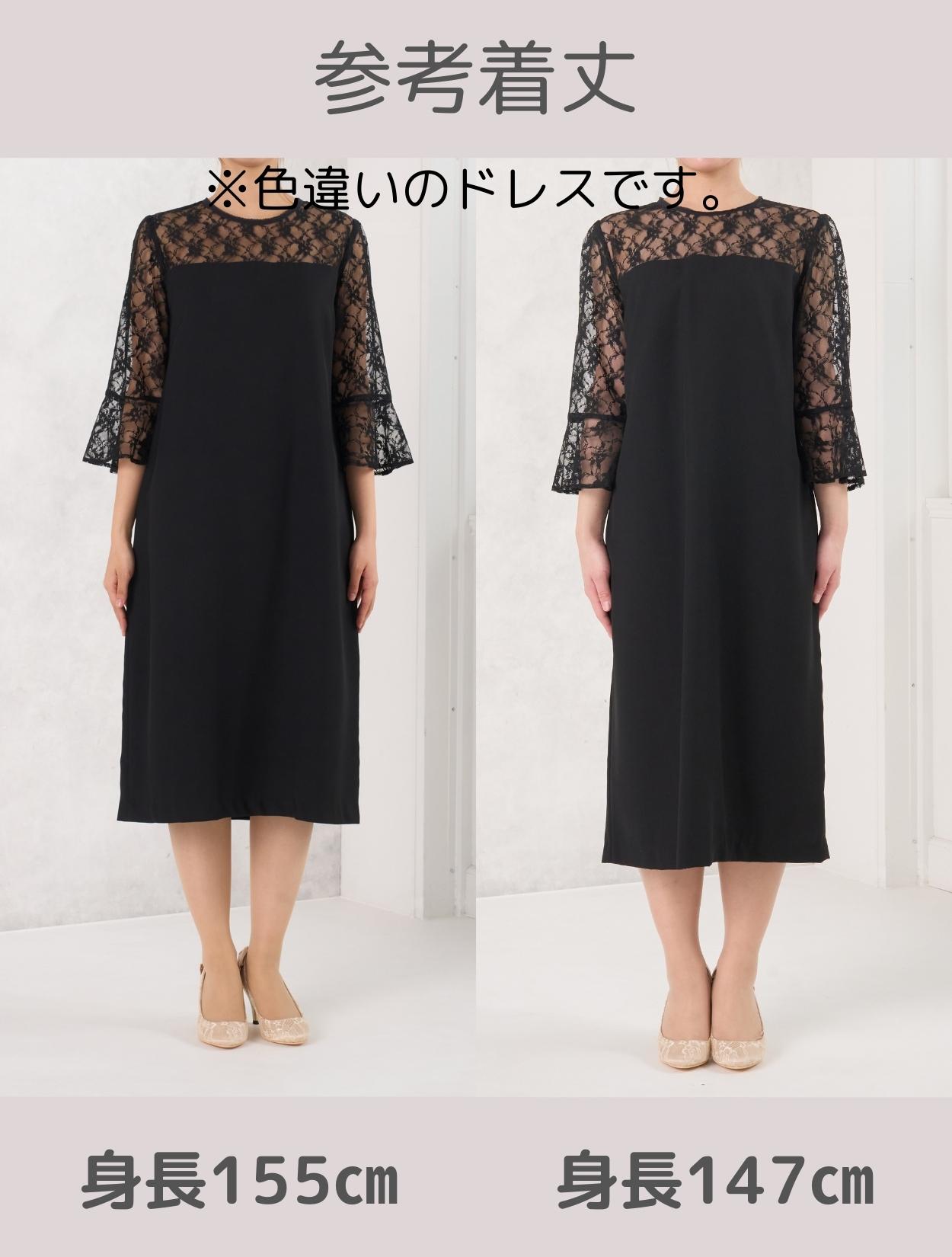 デコルテからお袖にかけての上品なレースが目を引くドレス。しっかりしたレースは高級感もあります。お袖は控えめなベルスリーブで、手首に向かって程よく広がるので腕を華奢に見せてくれます。ウエストに切り替えがないデザインで、緩やかな台形のトラペーズシルエットは、ナチュラルで大人っぽい印象に。丈は長めにとったミディ丈なので、しっかり膝を隠したい方はもちろん、意外にも小柄な方でも着こなしやすいドレスです。