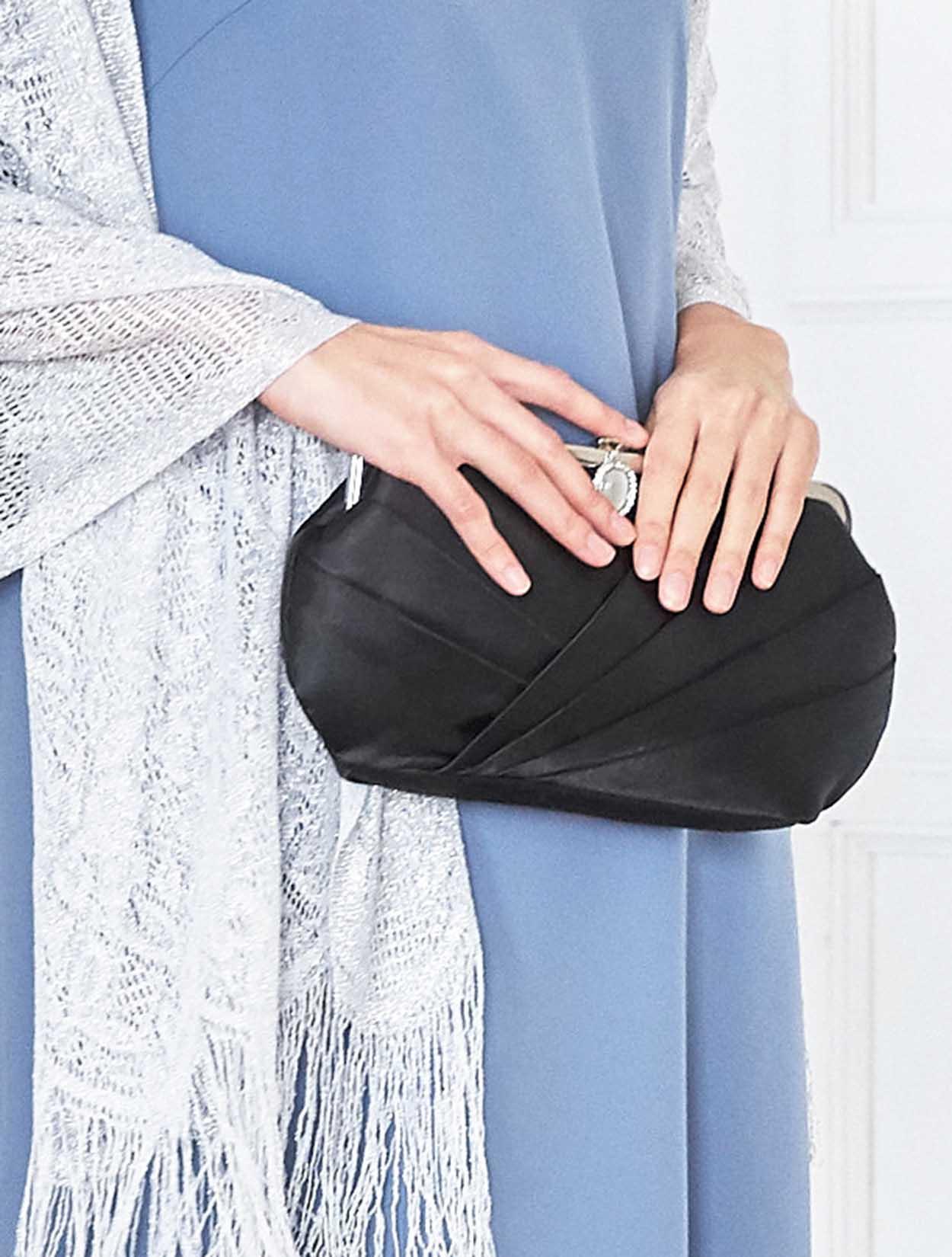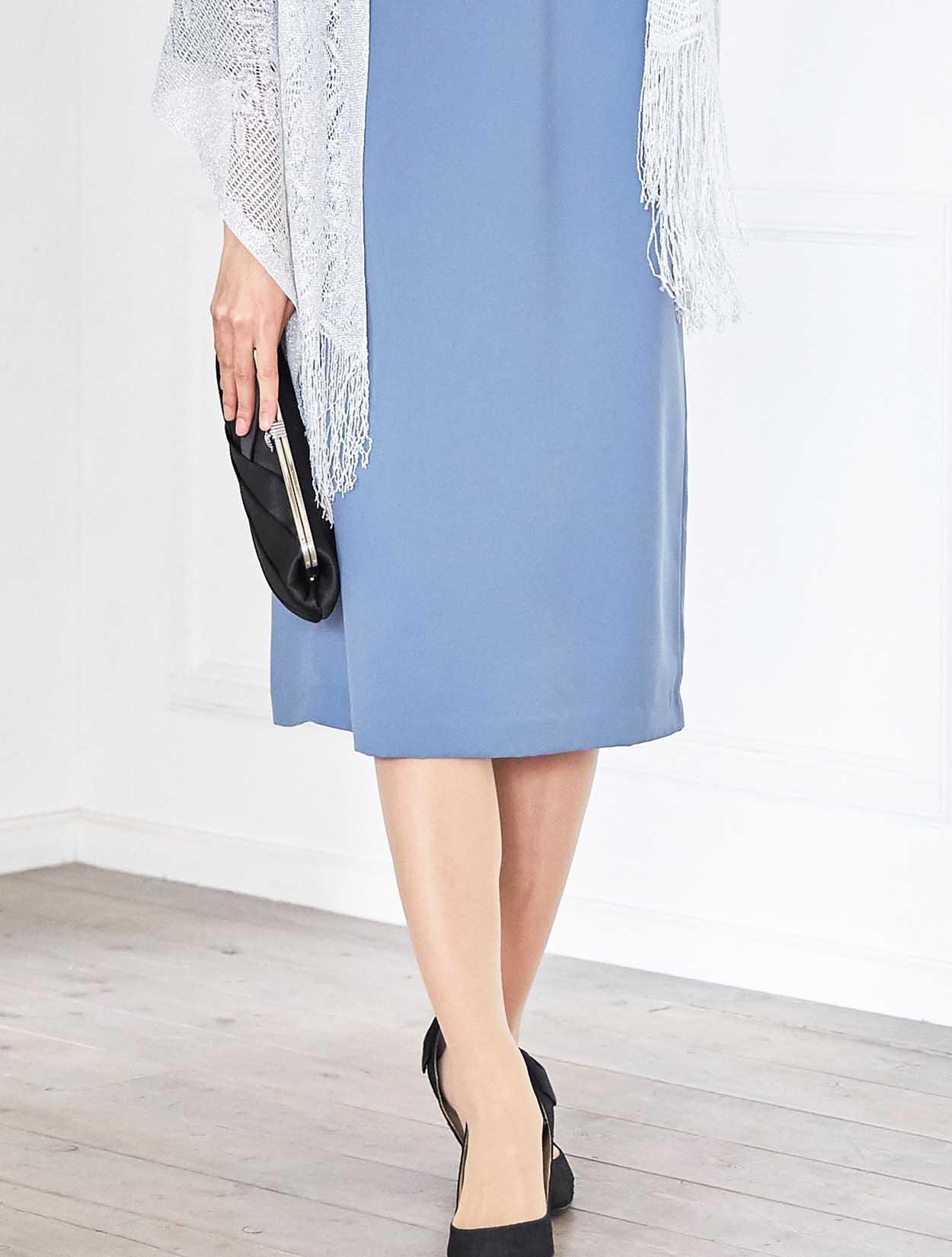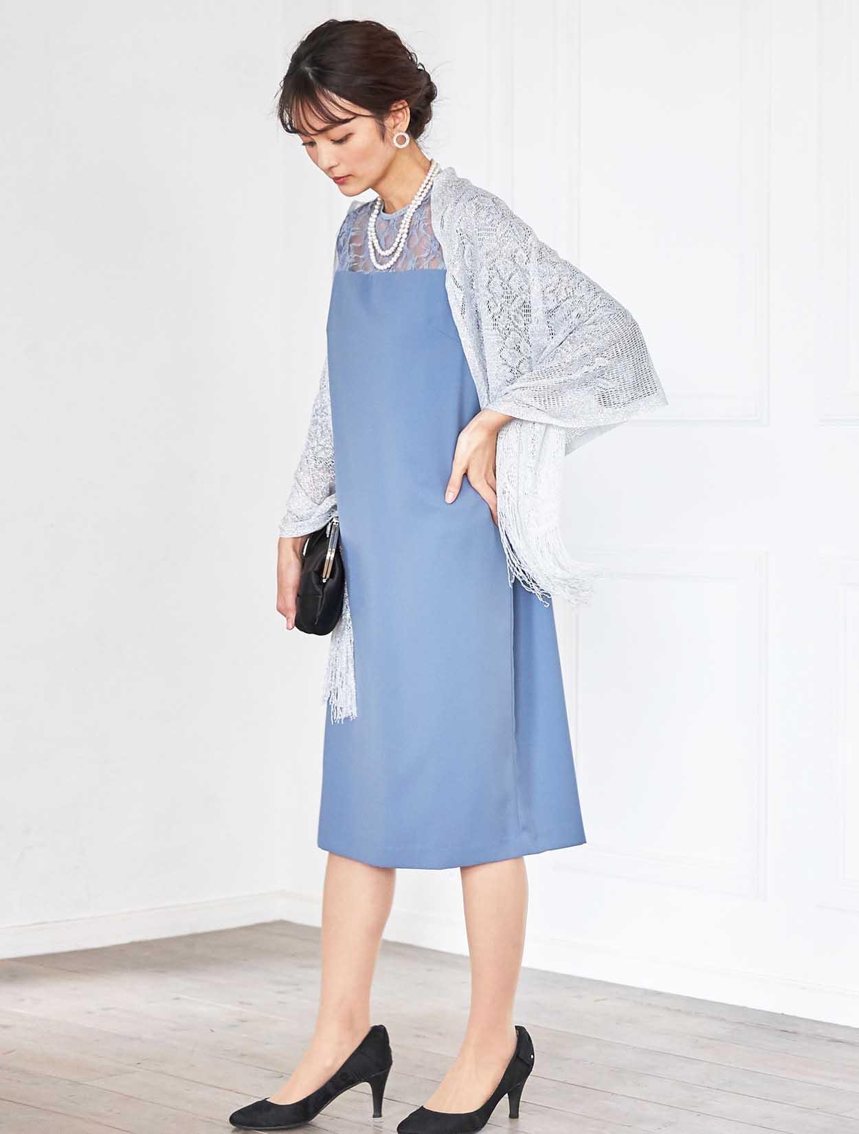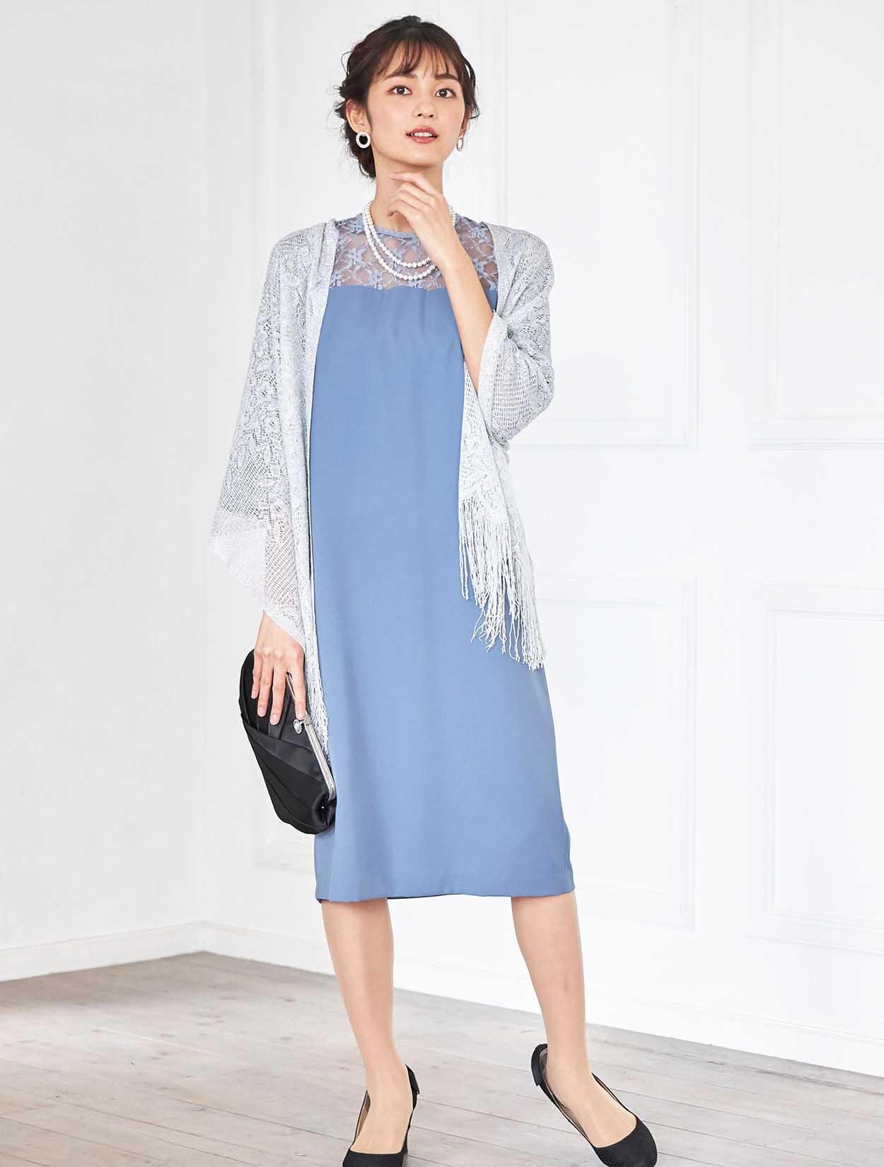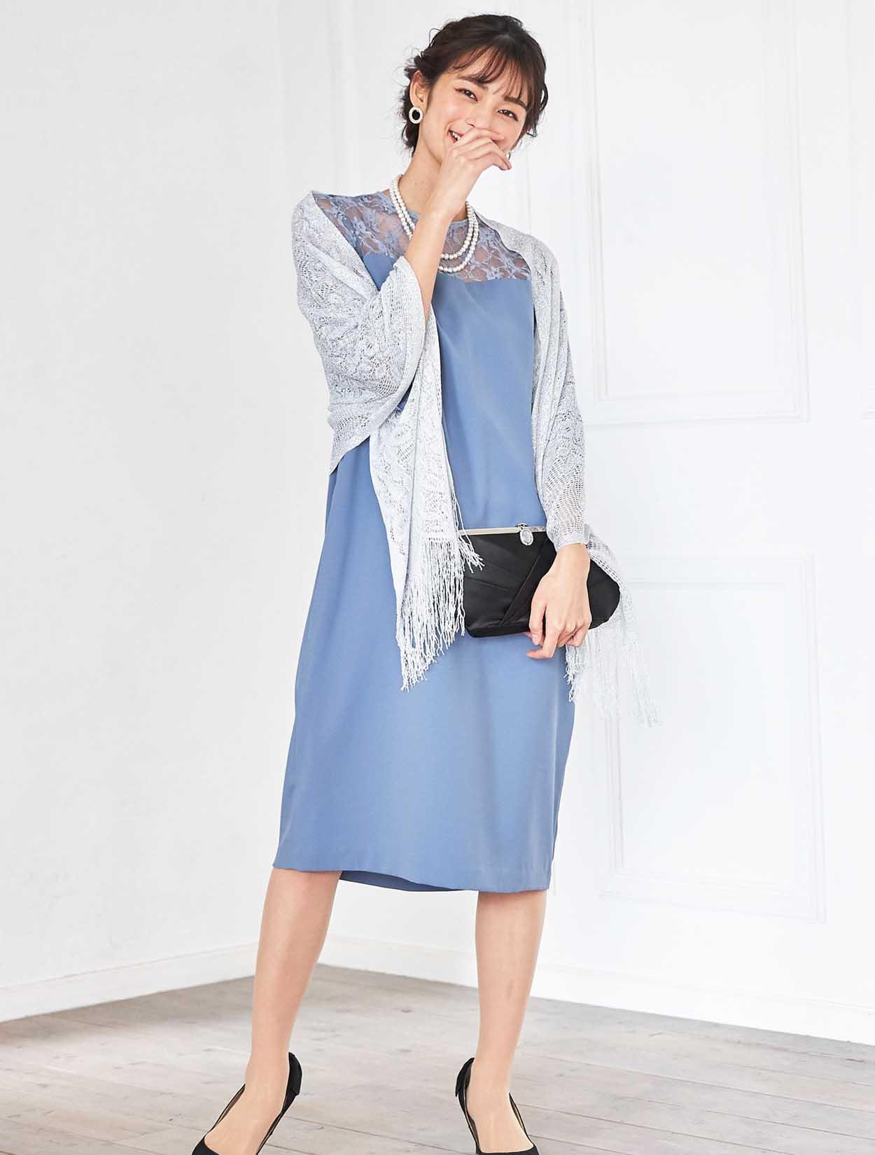 サックスカラードレスとシルバーストールで清楚で知的な印象のコーディネート。全体を淡いカラーでスッキリ上品にまとめ、黒のバッグでメリハリある大人の落ち着きをプラス。