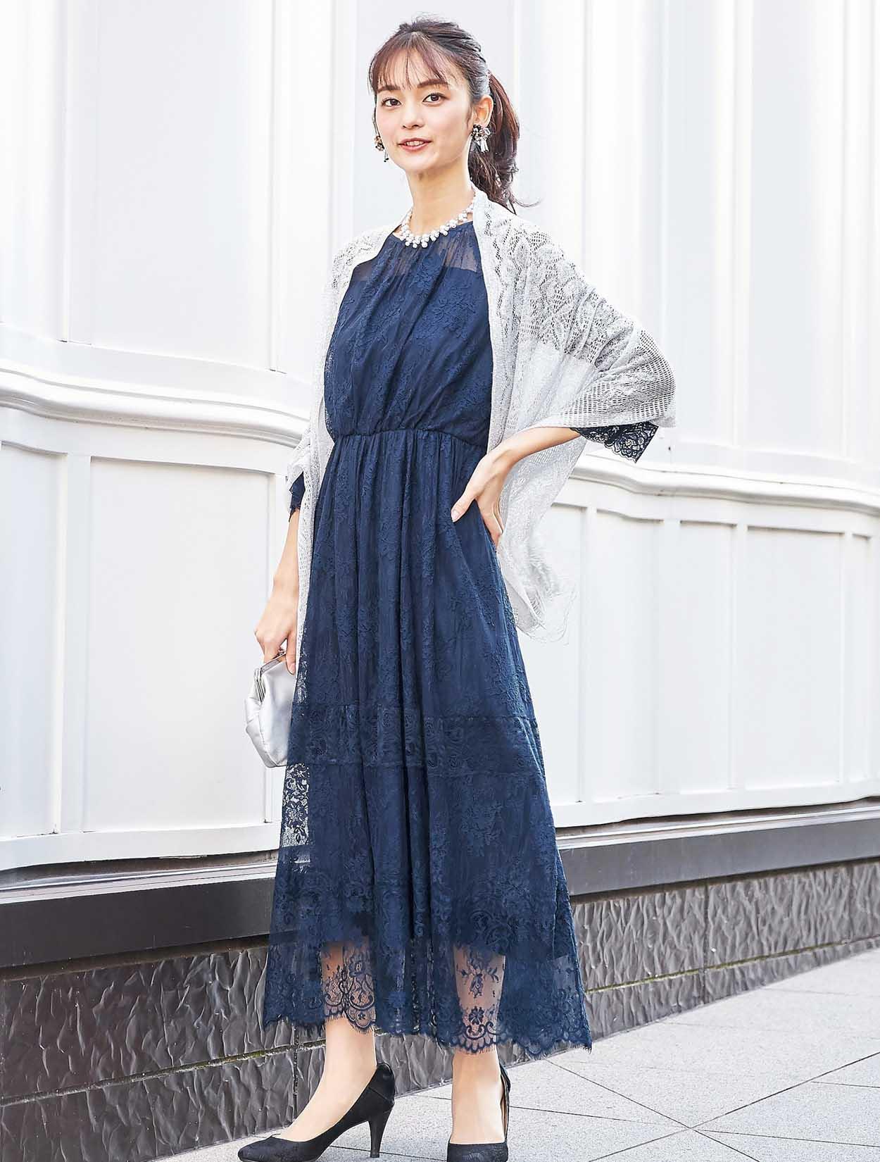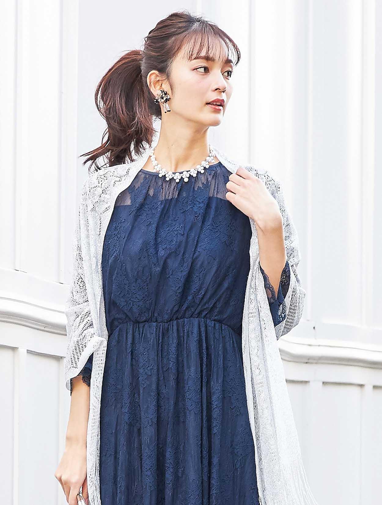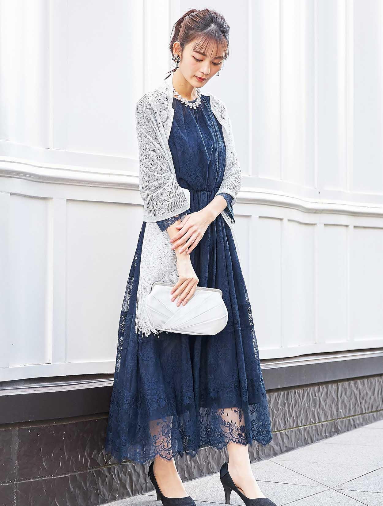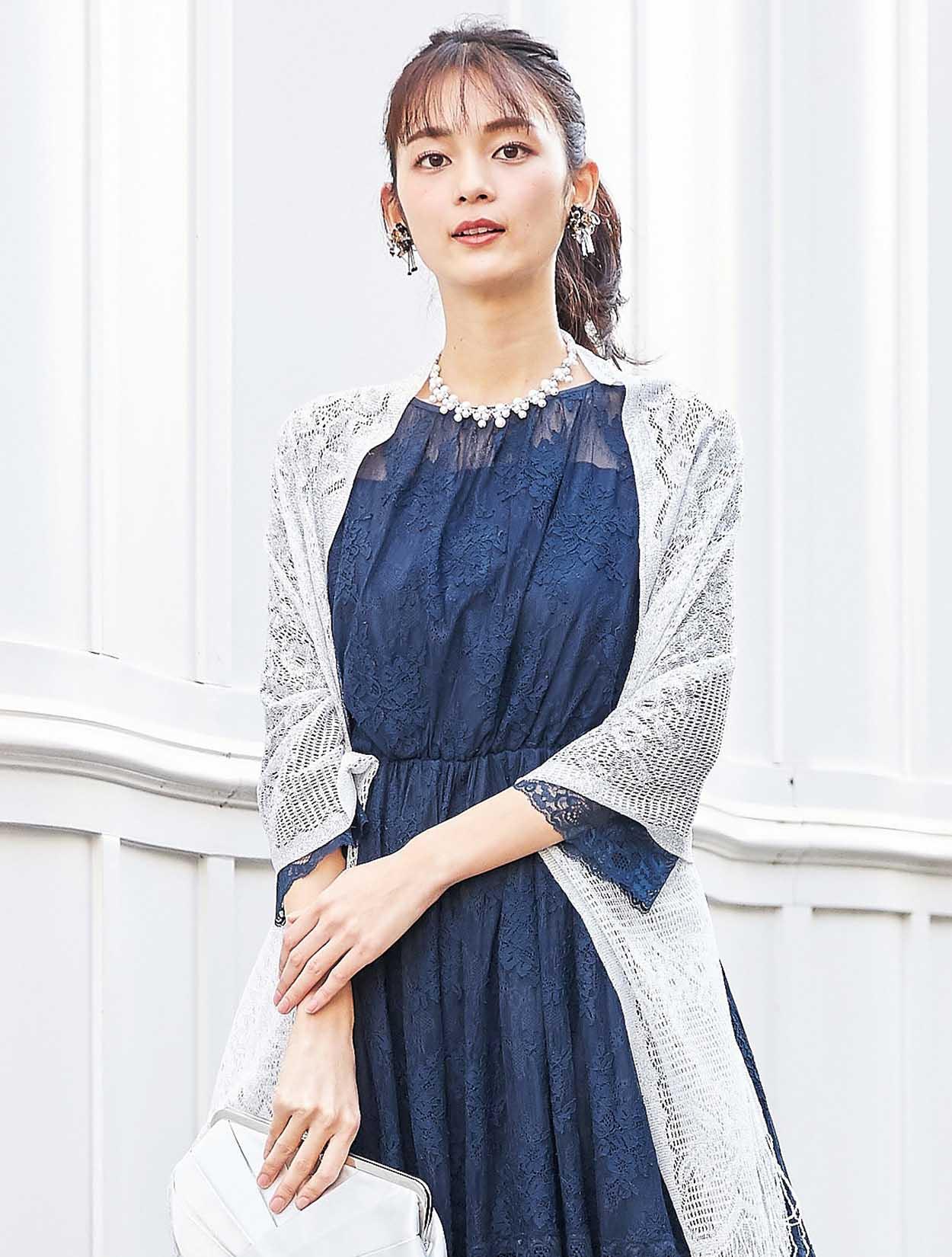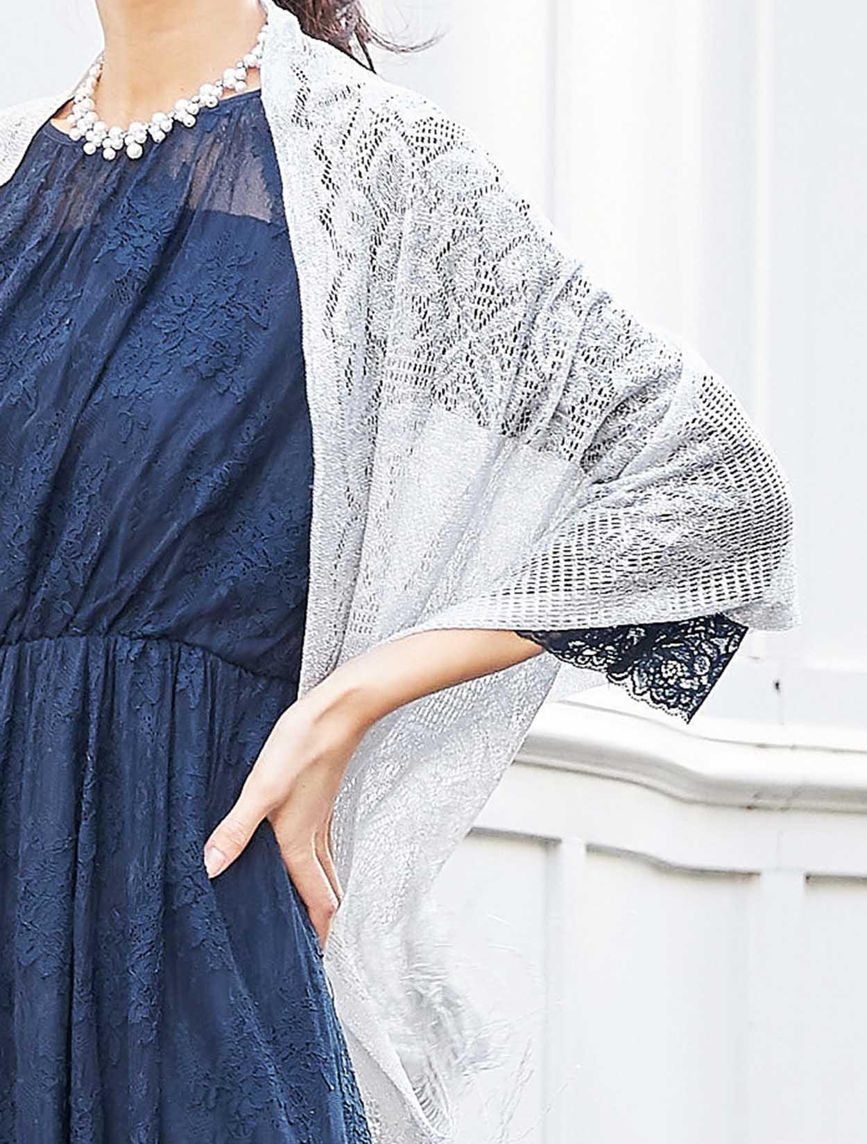 ネイビーのドレスに上品な輝きのシルバーショールをコーディネート。同色のバッグを合わせた落ち着きのあるスタイリングです。