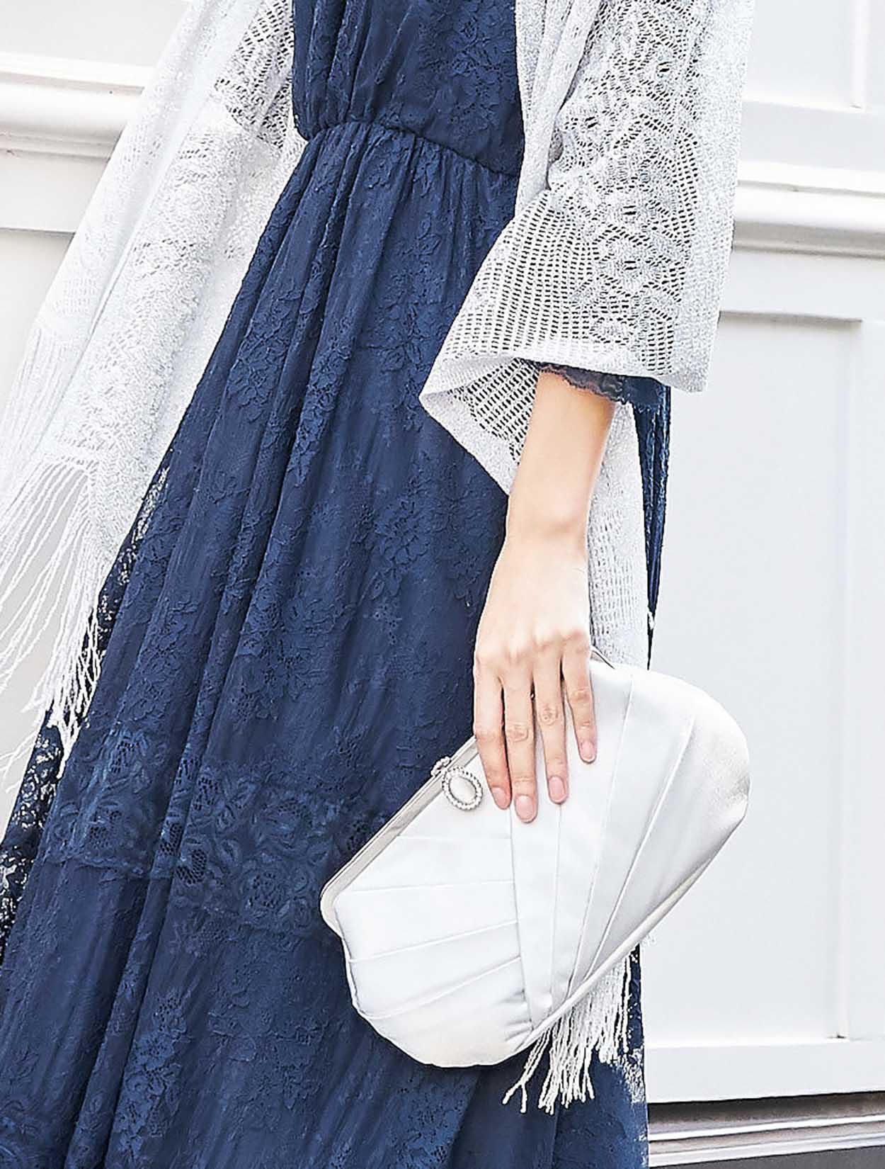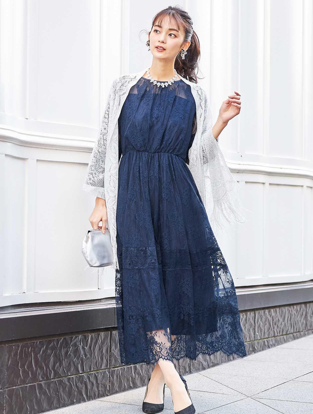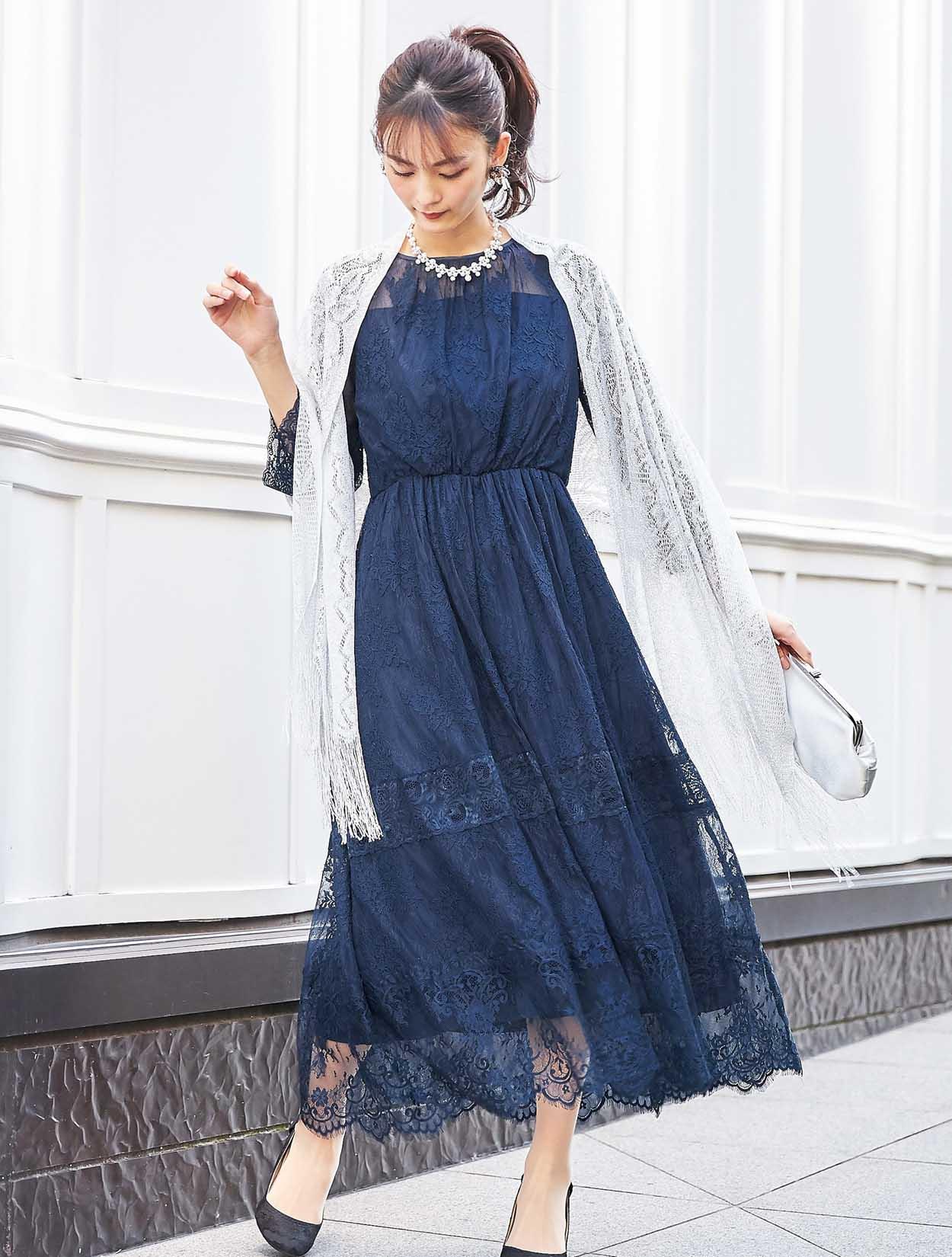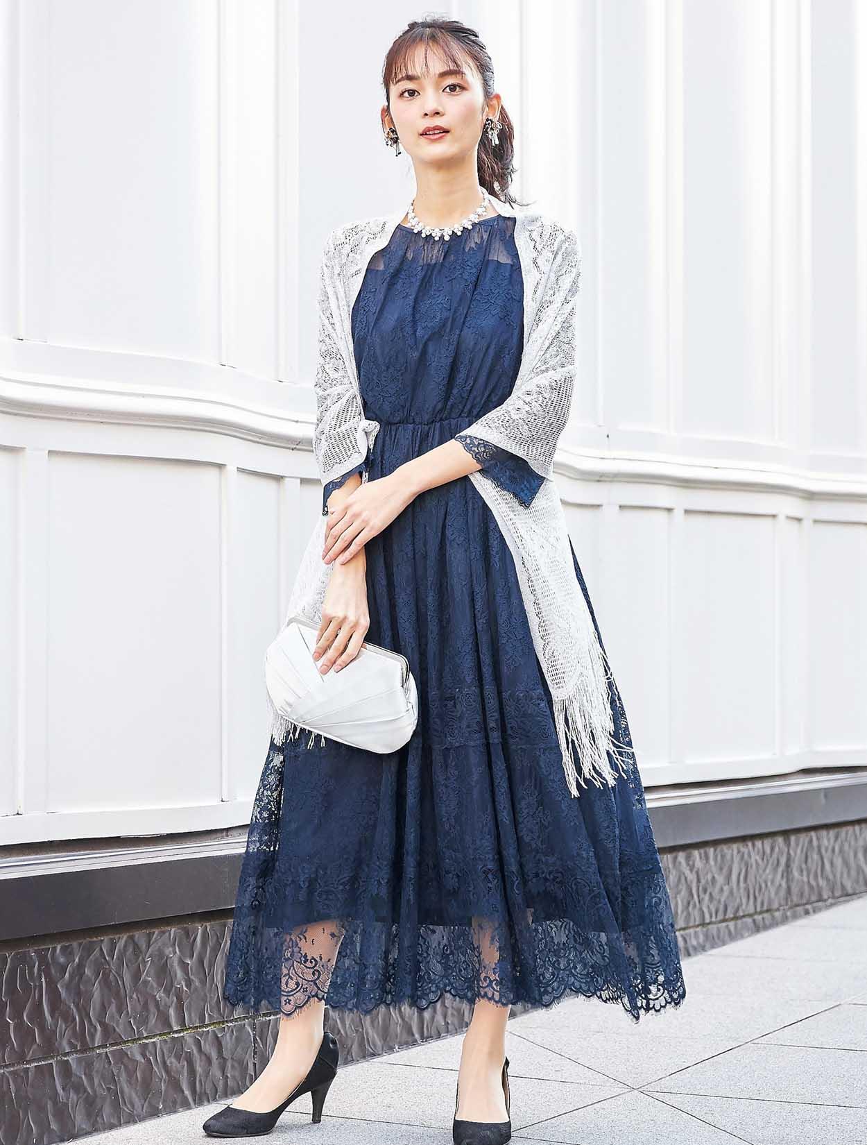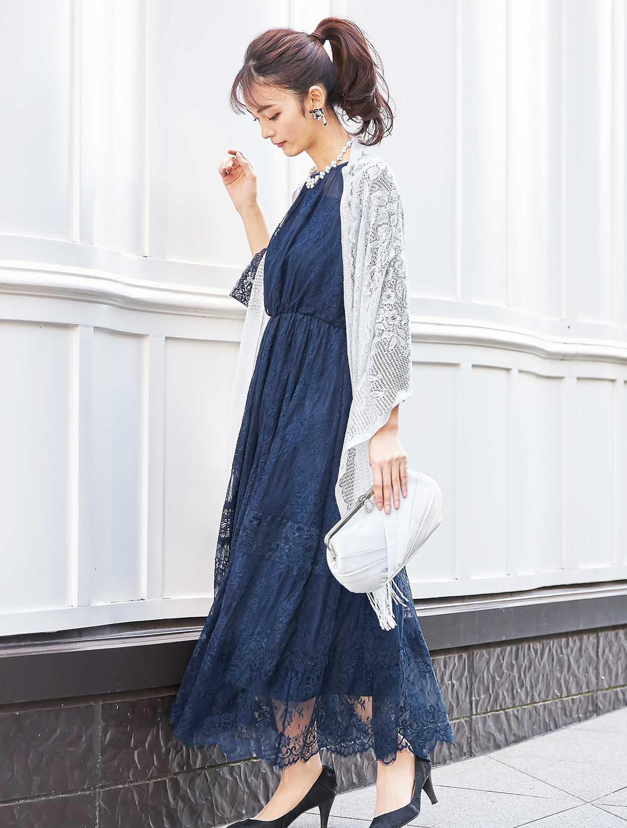 ネイビーのドレスに上品な輝きのシルバーショールをコーディネート。同色のバッグを合わせた落ち着きのあるスタイリングです。