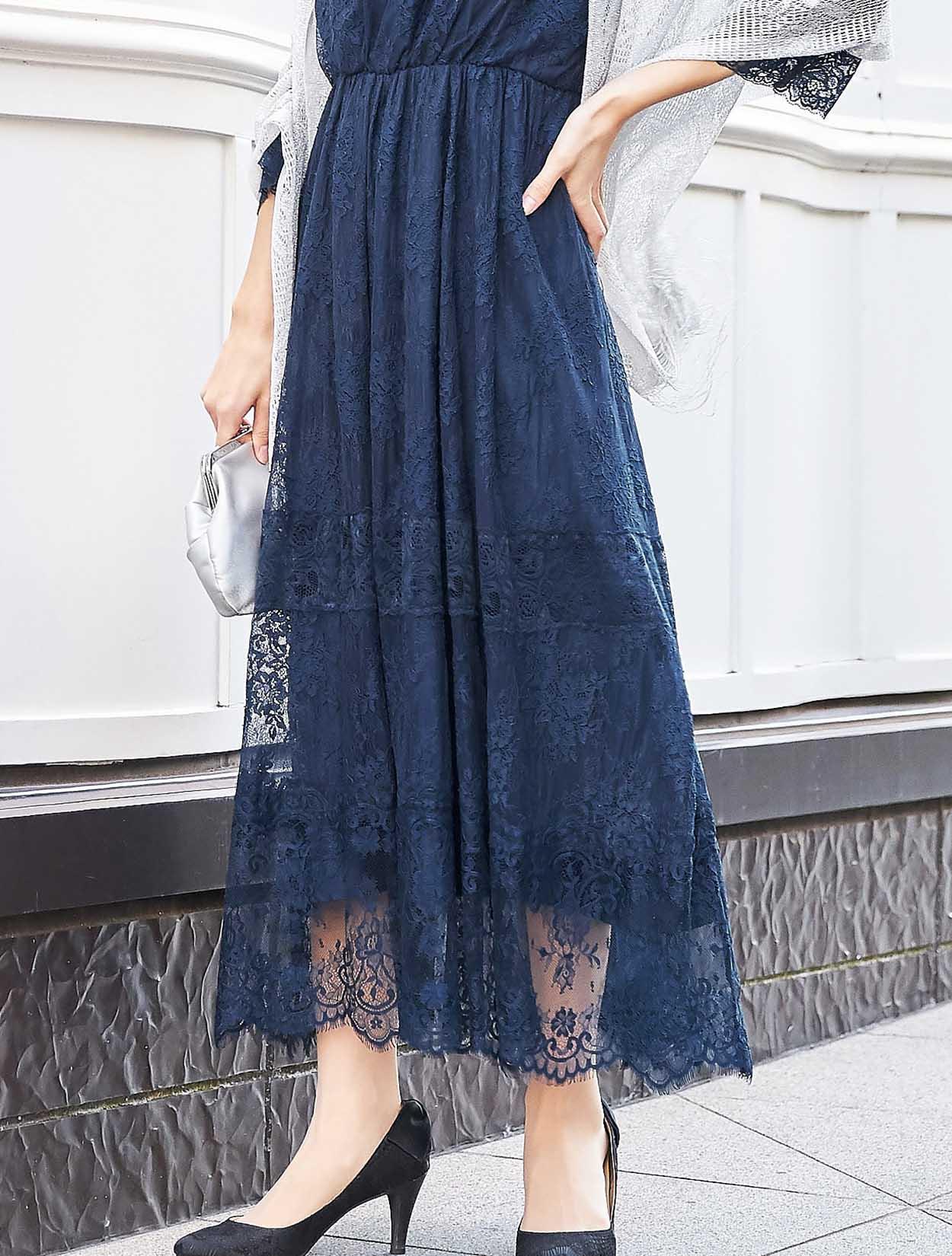程よい厚みのあるレースが上質感のあるドレス。透けすぎないレースは上品な着こなしが可能。複数の種類のレースを使っている凝ったデザインは、トレンドのレースドレスの中でも一際華やかにうつります。特にスカートの裾に使われたスカラップレースは、パッと目を引く華やかさがあります。トレンドの袖ありドレスなので、結婚式でも羽織り不要で一枚で着用可能。袖の長さもしっかりあるので、安心感もあります。ウエストはゴム仕様で、ストレスフリーな着心地も嬉しいポイント。長時間の着用でも疲れにくいドレスです。ロングドレスですが、スカート裾のレースから脚が透けるので、重たく見えずエアリーな印象です。