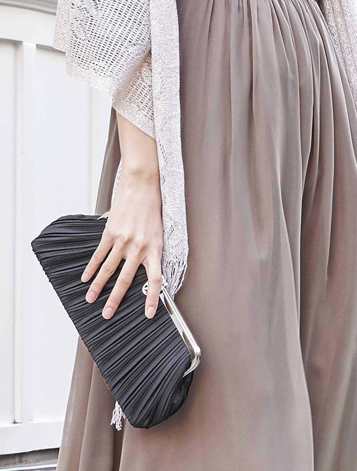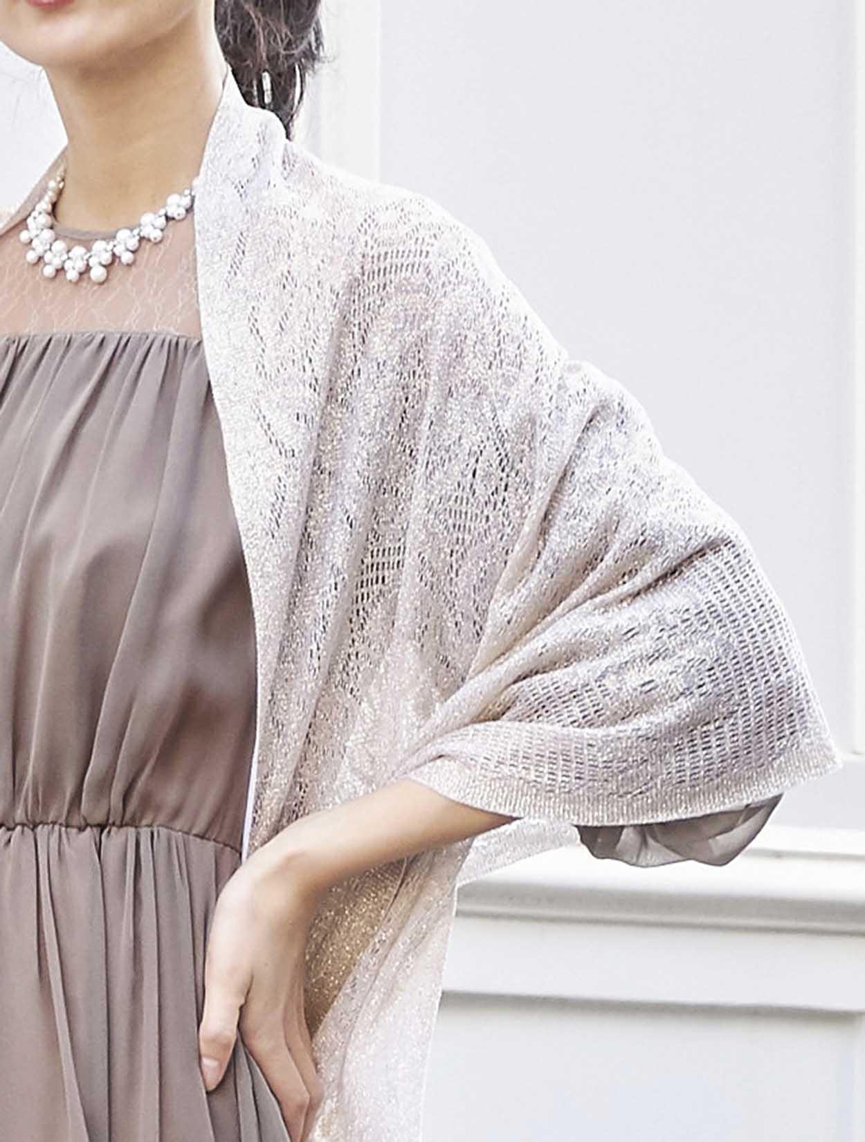 上品なベージュカラーにゴールドのショールを合わせた女性らしい優しい表情のコーディネート。ブラックのバッグを持つ事で全体が引き締まった印象に。