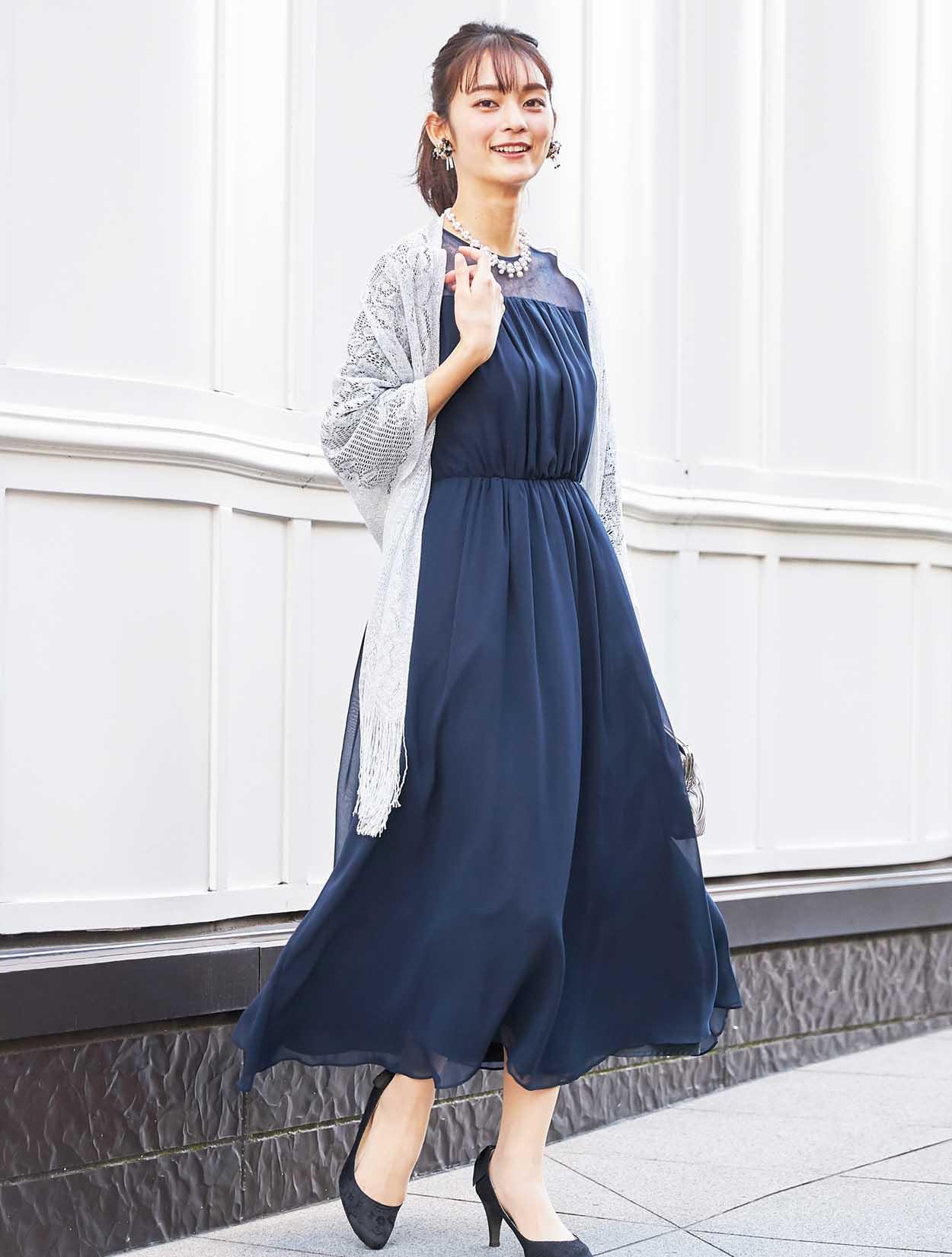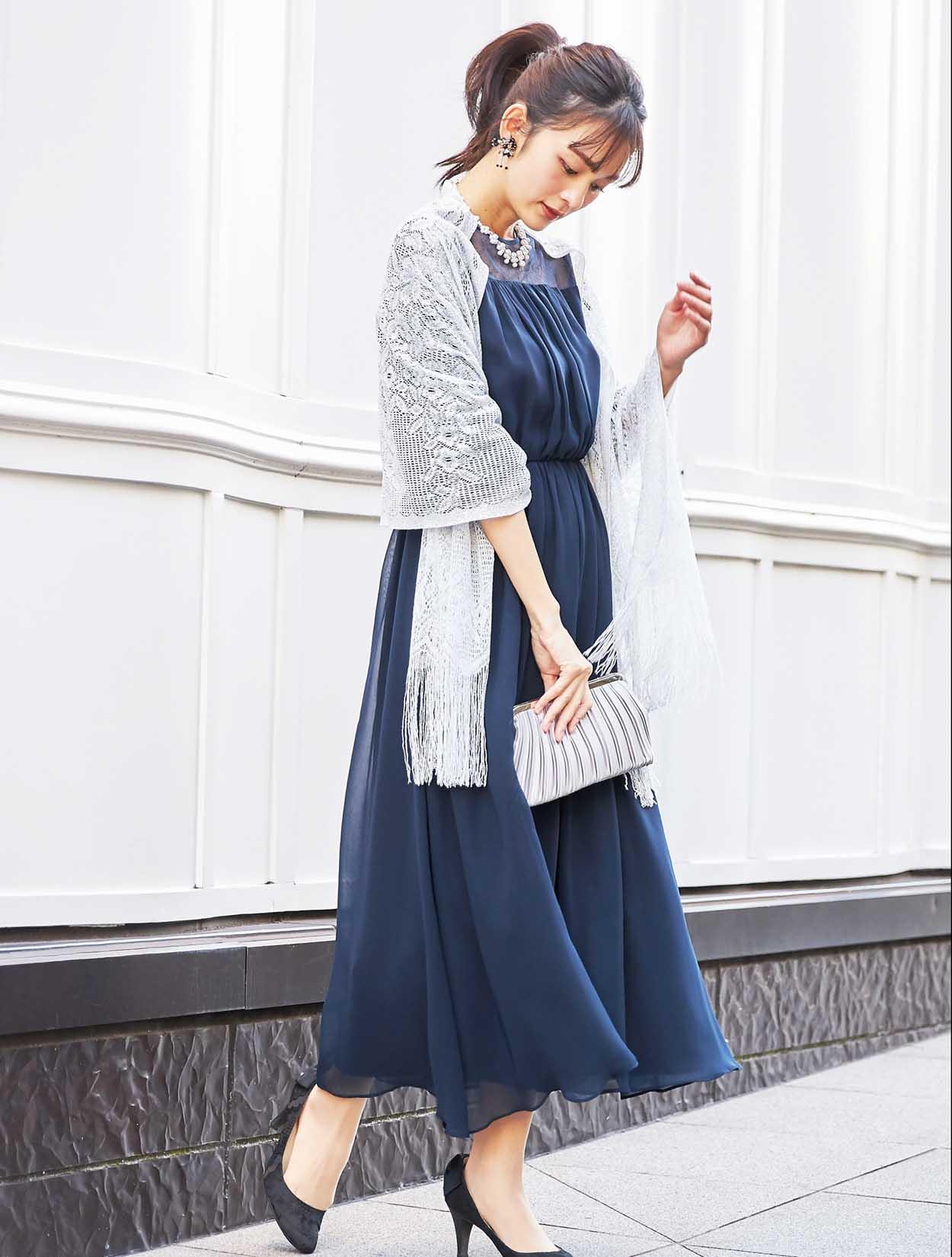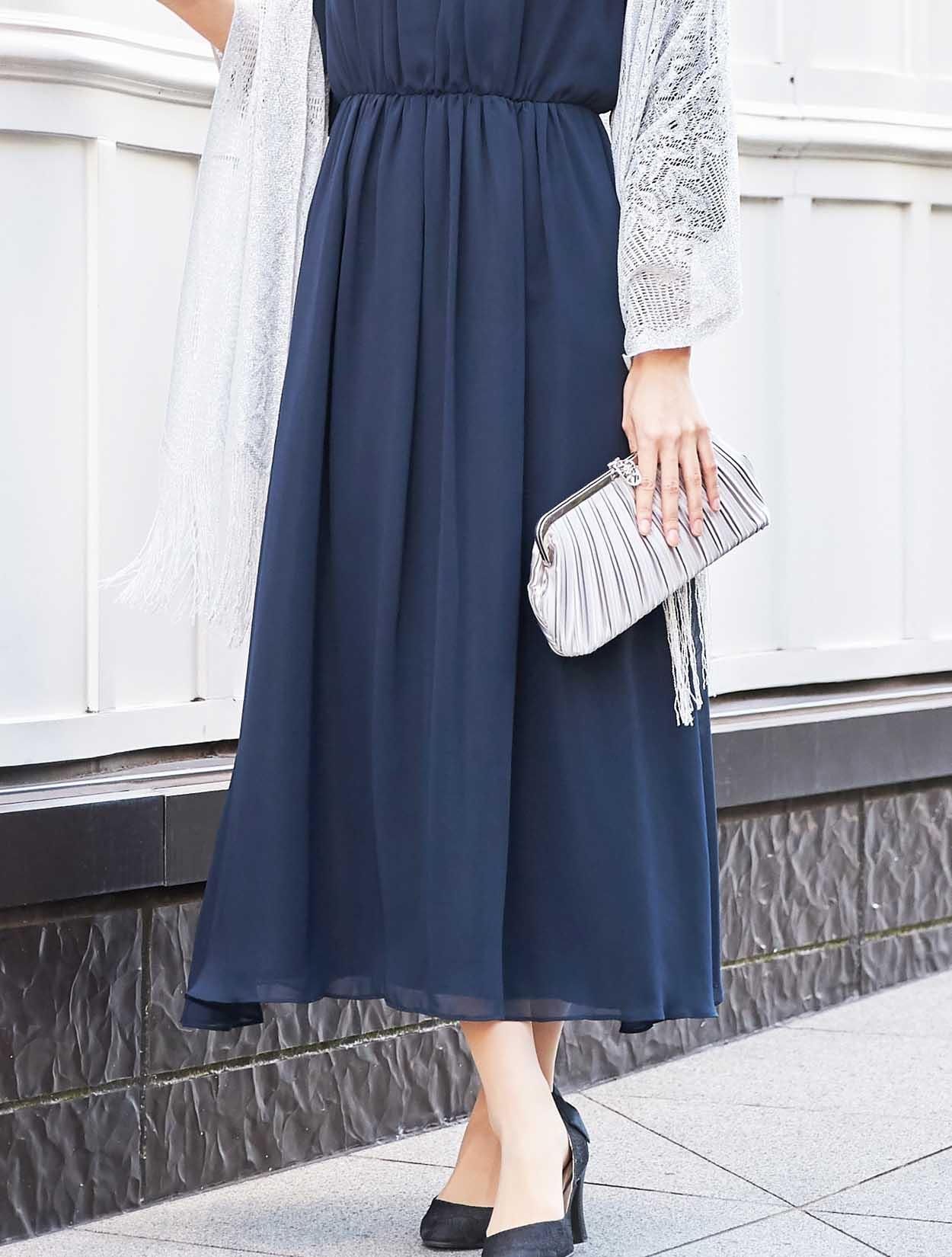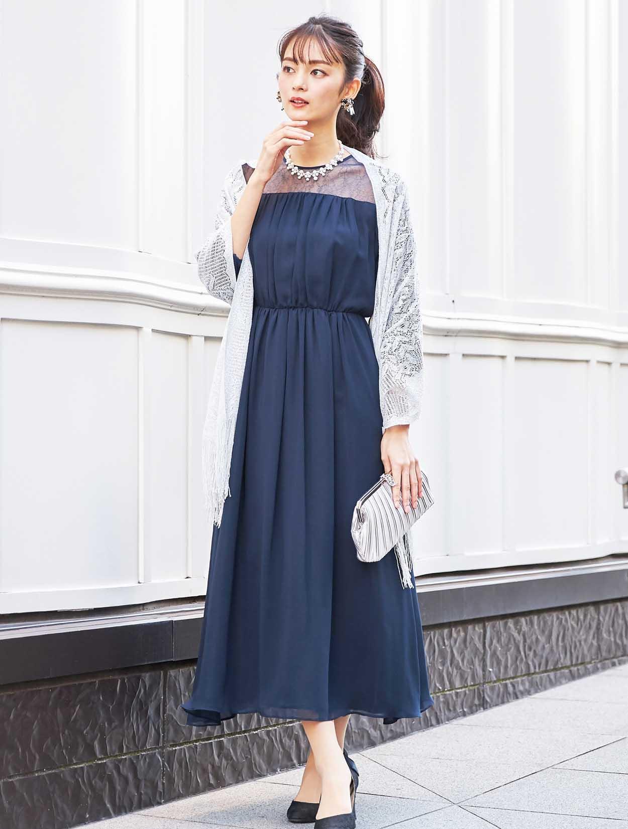 濃紺のミッドナイトブルーですが、生地が軽いので重たく見え過ぎません。締めカラーでもあるネイビーのドレスは、着痩せして見えるカラーでもあり人気です。