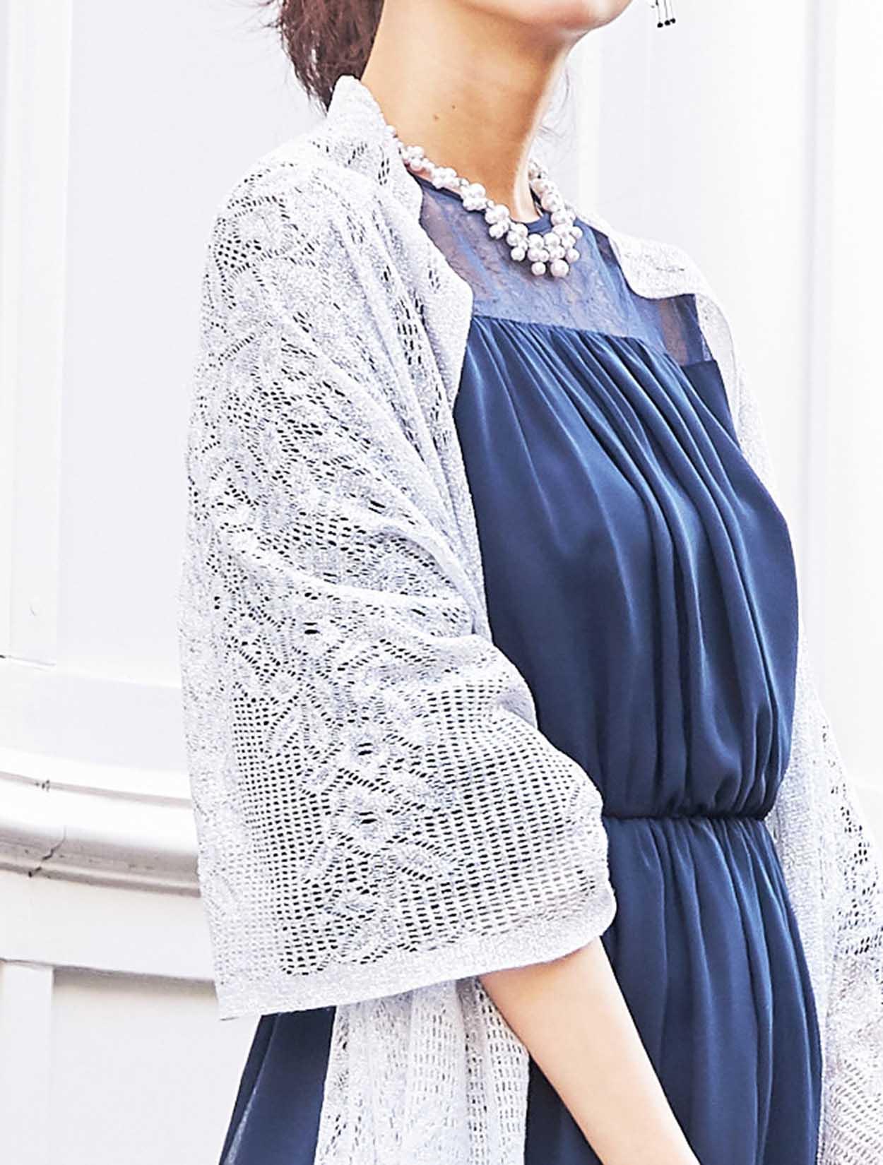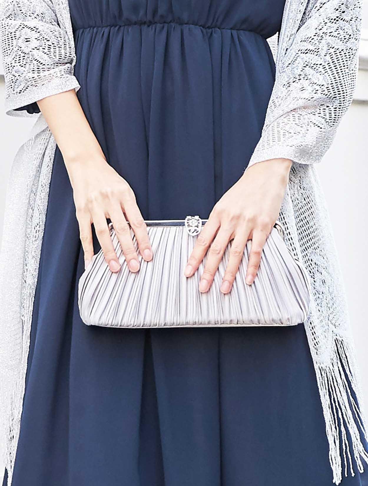 柔らかい印象のバルーンスリーブにシルバーのショールを合わせたシャープなコーディネート。品のあるプリーツバッグとも良く合う、落ち着いた大人っぽいスタイルです。