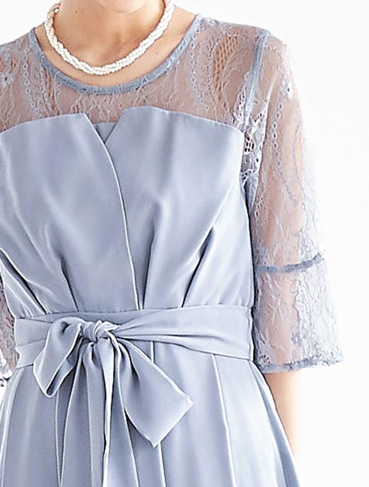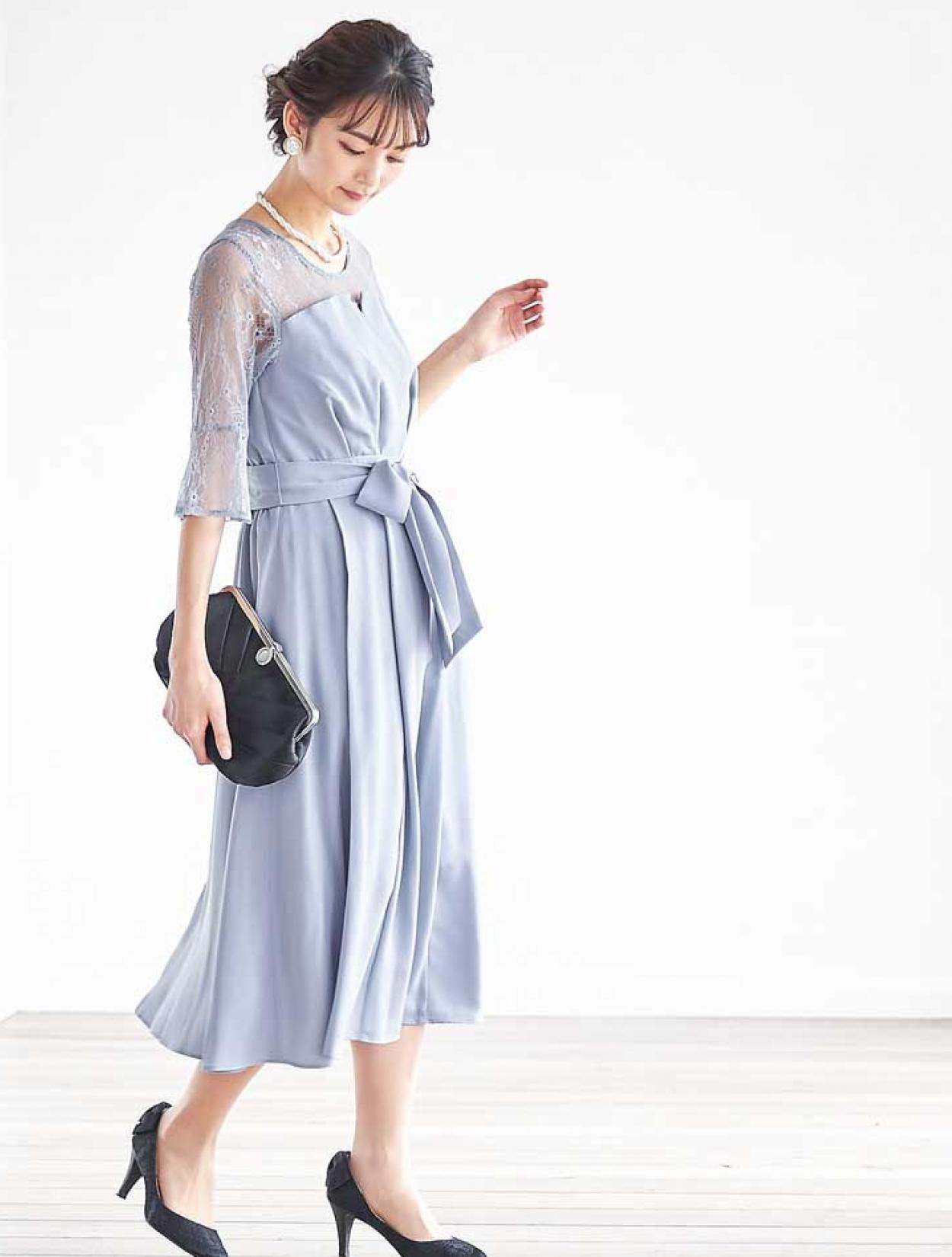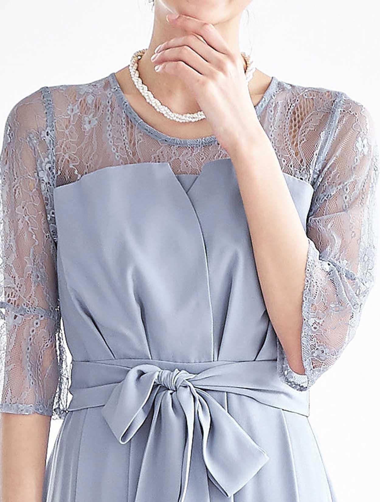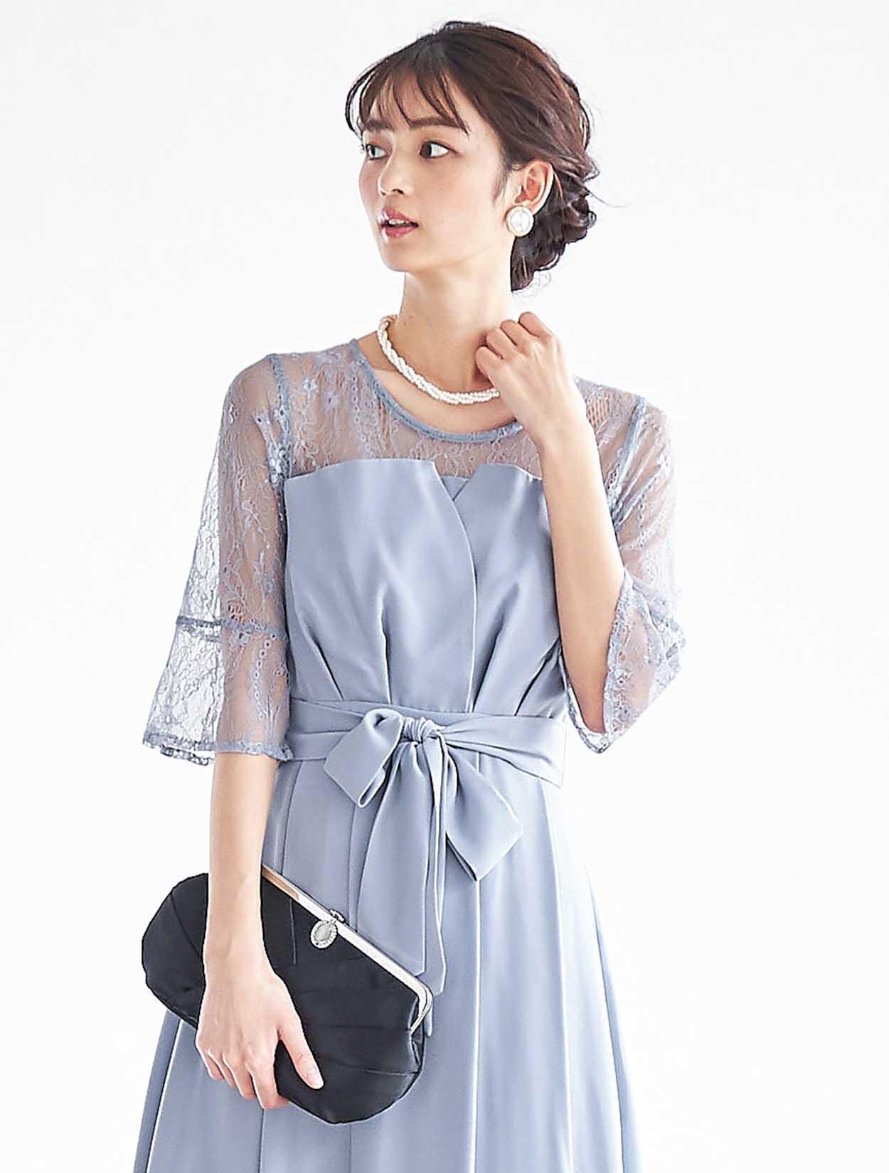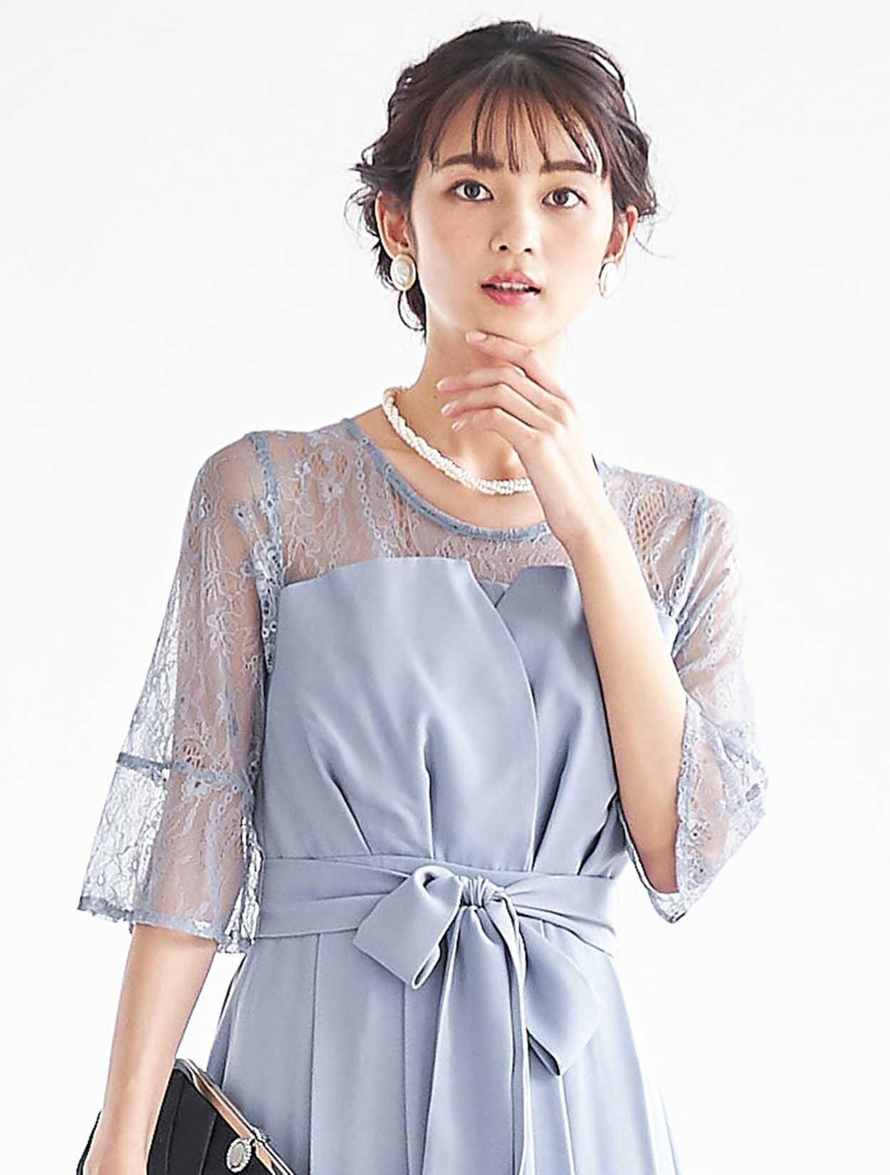 立体的なビスチェ風のデザインが目を引く人気ドレス。ウエストはリボンでキュッと絞れるので、メリハリが出てスタイルアップ効果抜群。デコルテから袖にかけて使われている繊細なレースは、女性らしい肌感を演出してくれます。トレンドの袖ありドレスは、結婚式でも羽織が不要。とろみのあるジョーゼット生地のスカートは、大きくプリーツをとって華やかなAラインスカートに。足首がしっかり見えるミモレ丈で、全体的にスッキリとまとまります。着崩れしないドレスなので、受付や代表スピーチをする方でも安心してご着用頂けます。