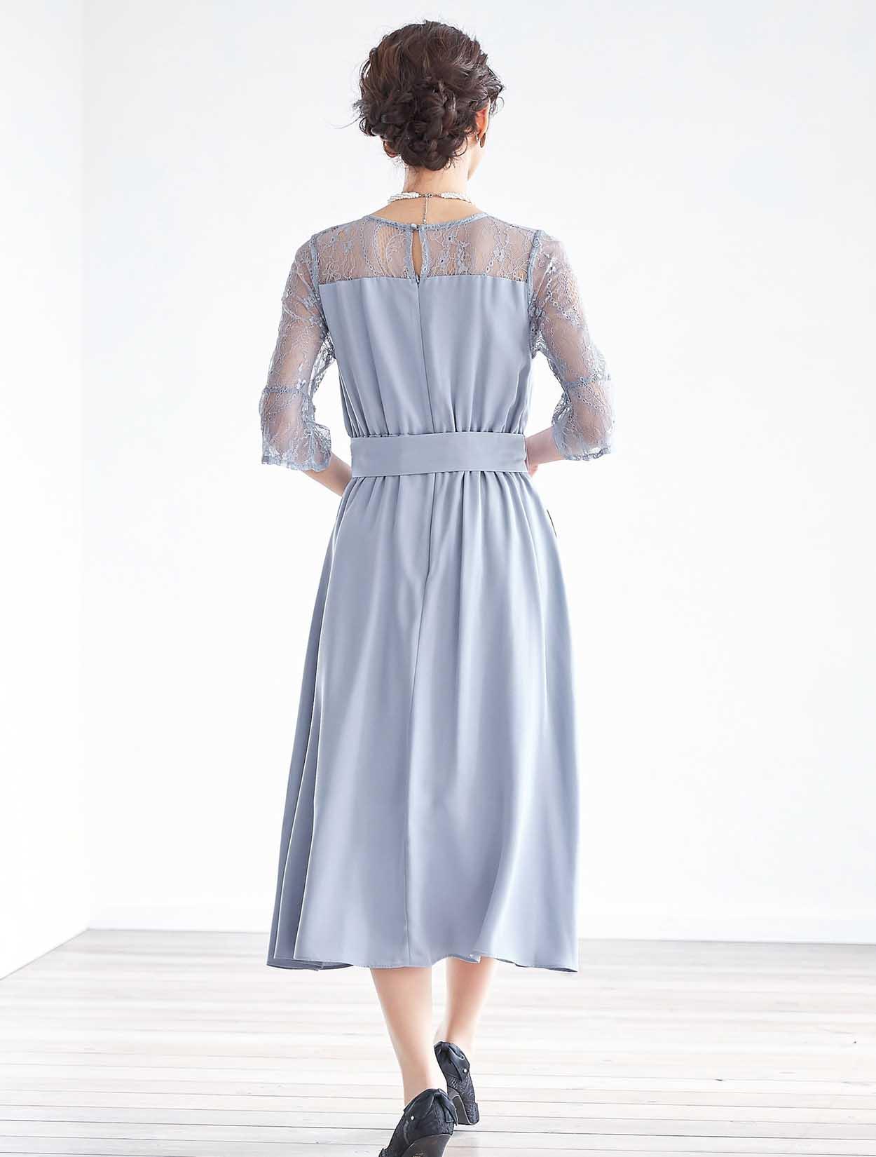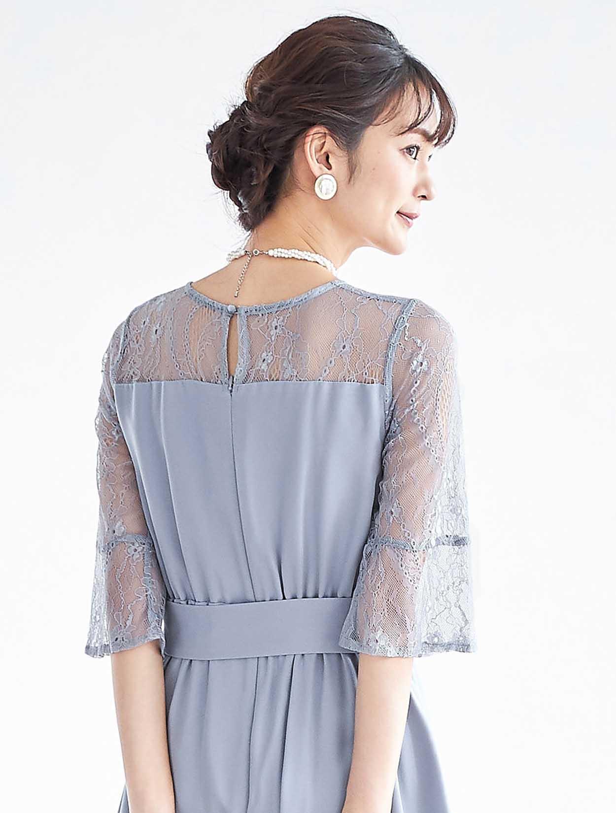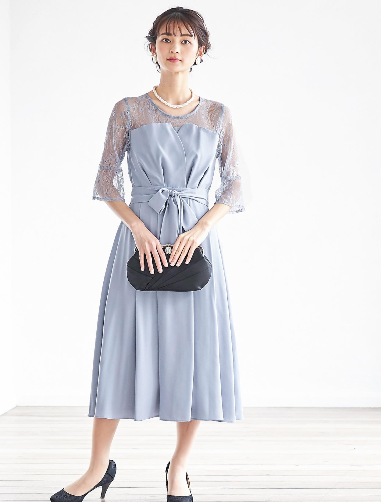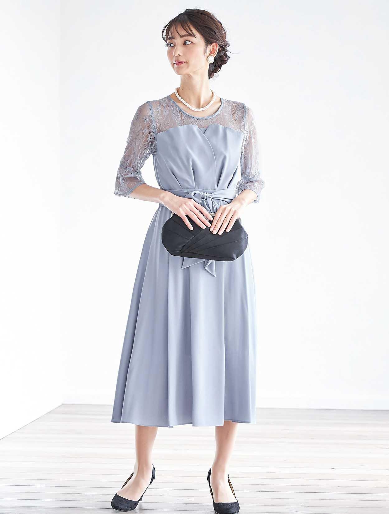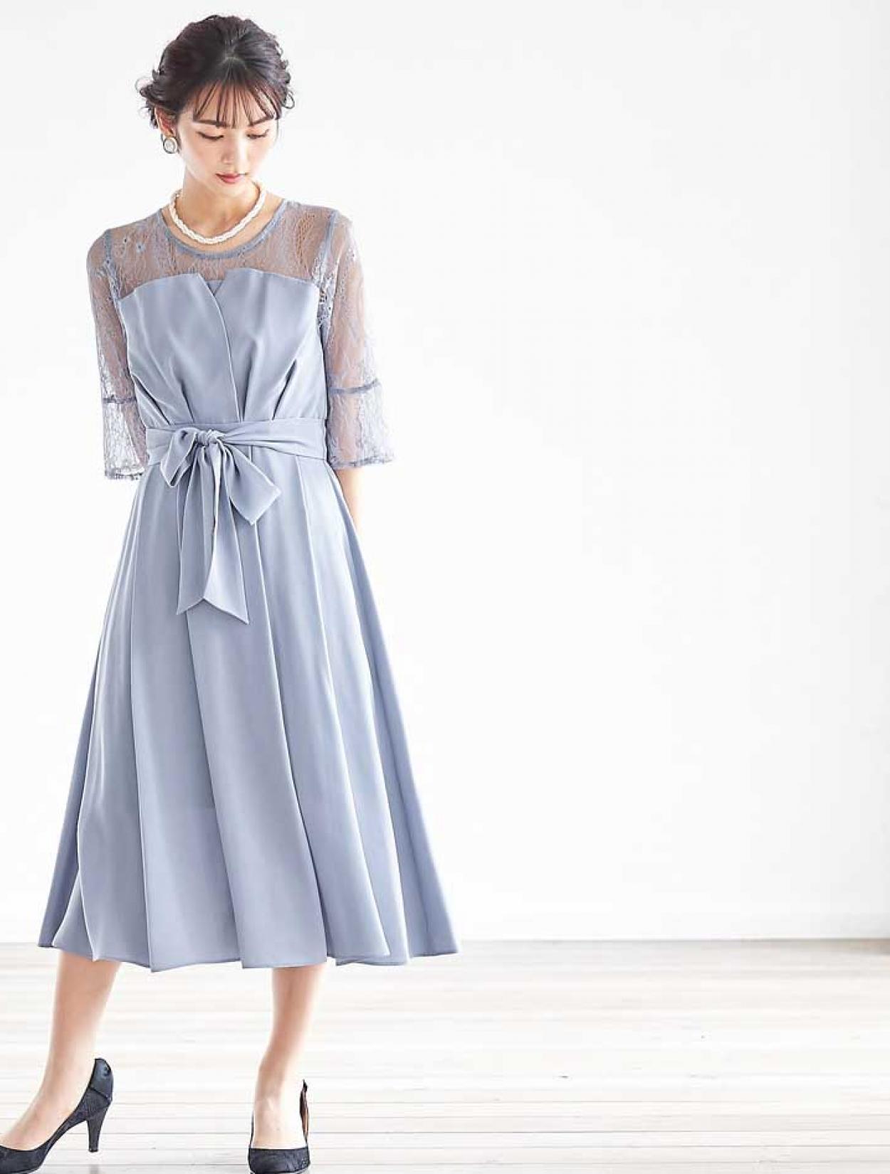 立体的なビスチェ風のデザインが目を引く人気ドレス。ウエストはリボンでキュッと絞れるので、メリハリが出てスタイルアップ効果抜群。デコルテから袖にかけて使われている繊細なレースは、女性らしい肌感を演出してくれます。トレンドの袖ありドレスは、結婚式でも羽織が不要。とろみのあるジョーゼット生地のスカートは、大きくプリーツをとって華やかなAラインスカートに。足首がしっかり見えるミモレ丈で、全体的にスッキリとまとまります。着崩れしないドレスなので、受付や代表スピーチをする方でも安心してご着用頂けます。
