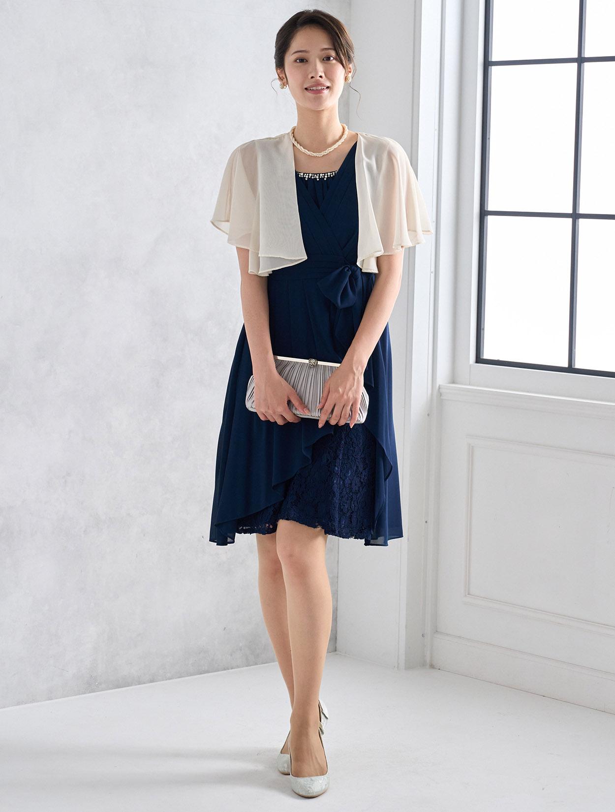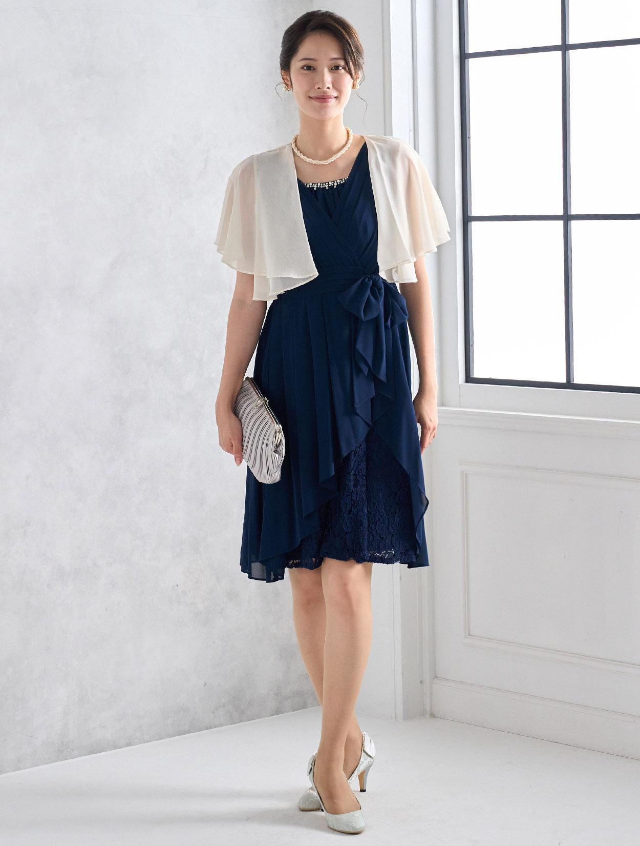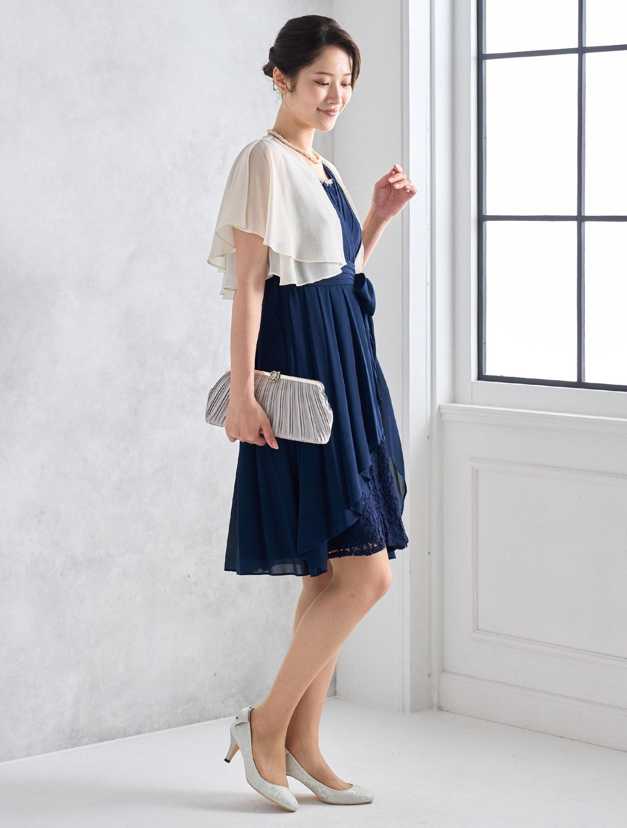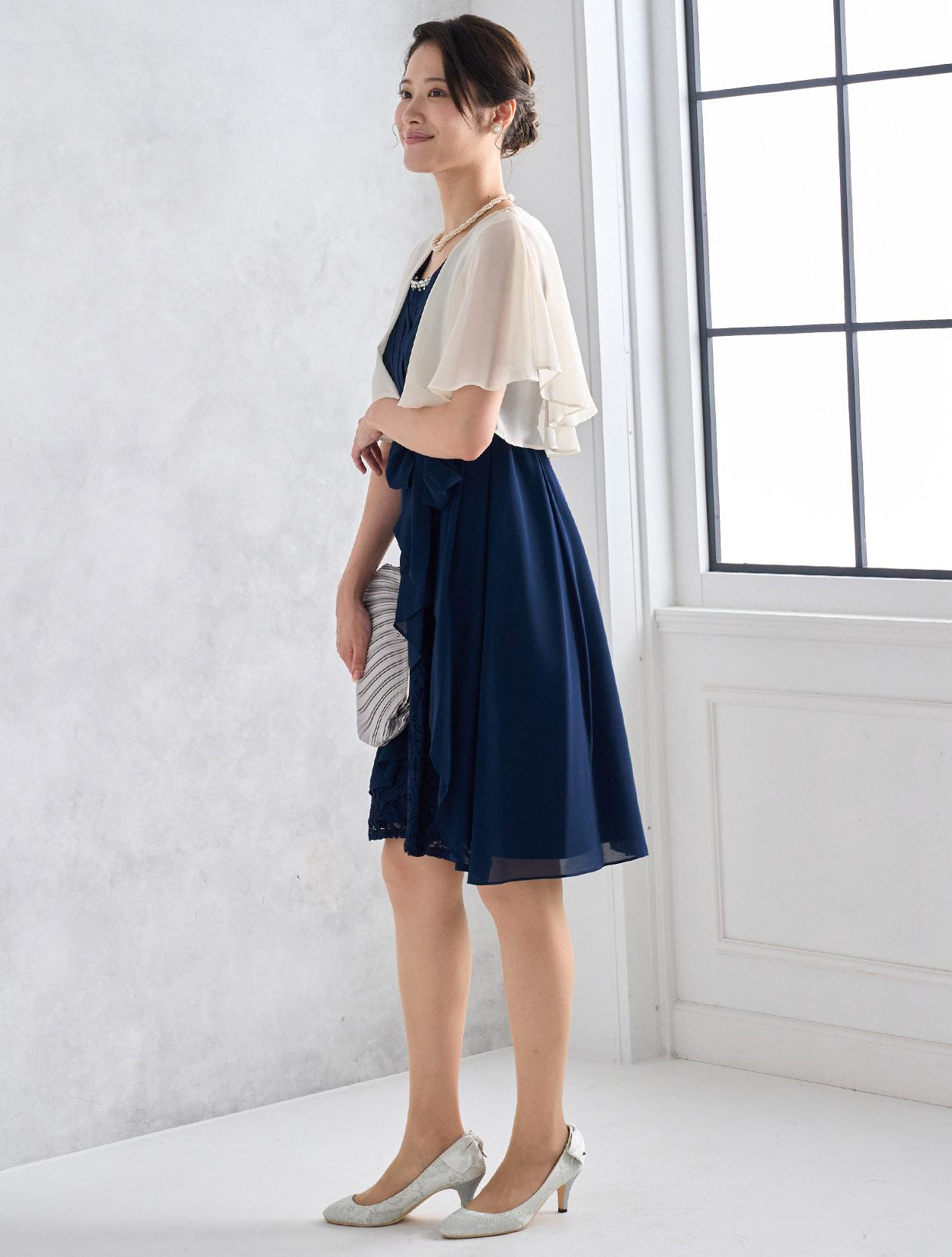 アイボリーの羽織を合わせてネイビードレスを明るくコーディネート。コーディネートの色味にメリハリが出るとお顔回りも明るく見えます。