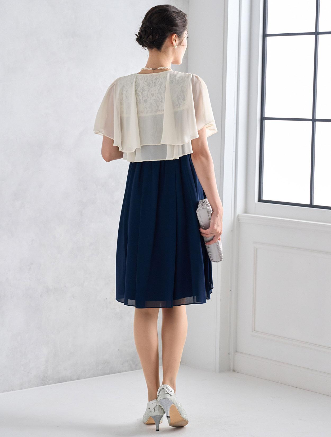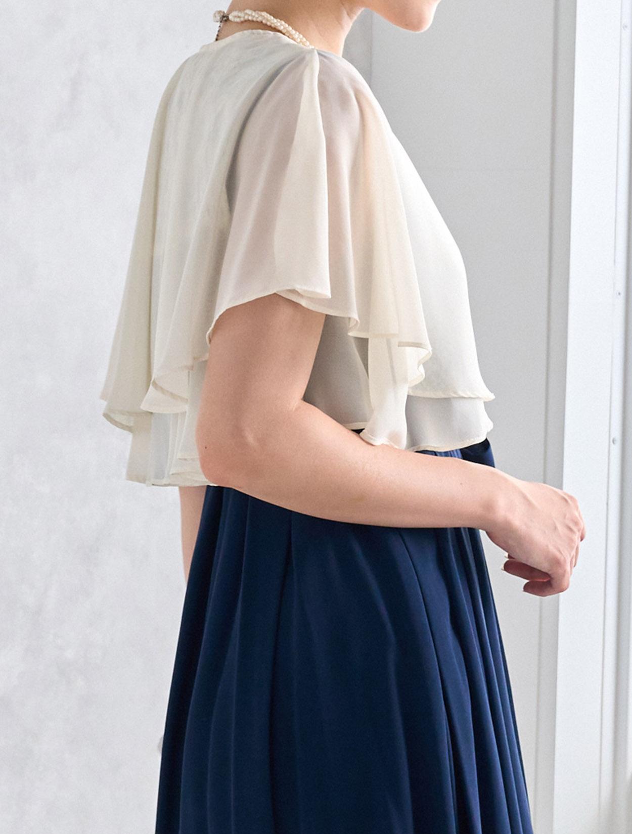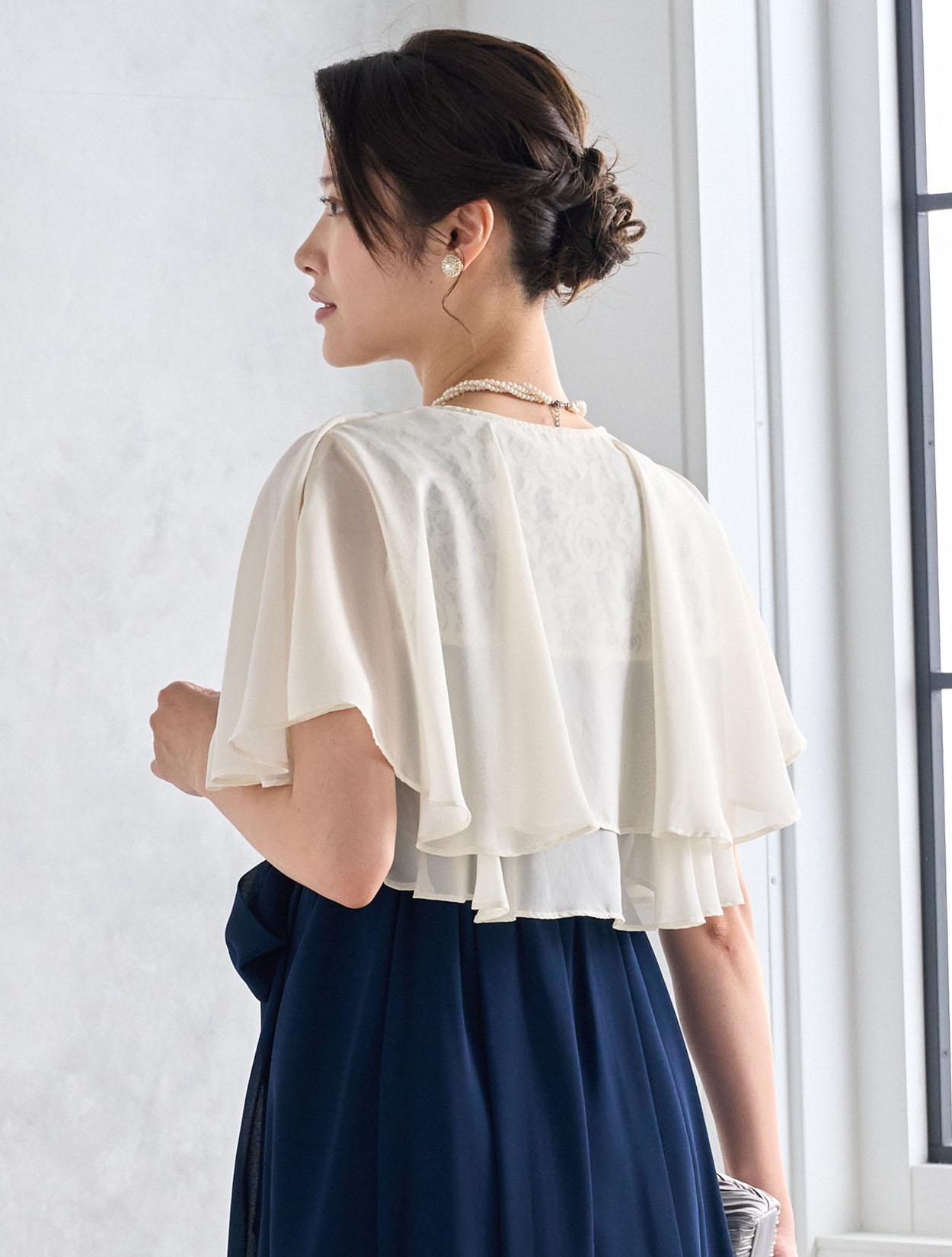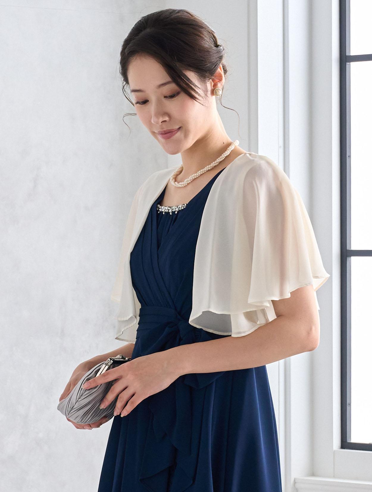 アイボリーの羽織を合わせてネイビードレスを明るくコーディネート。コーディネートの色味にメリハリが出るとお顔回りも明るく見えます。