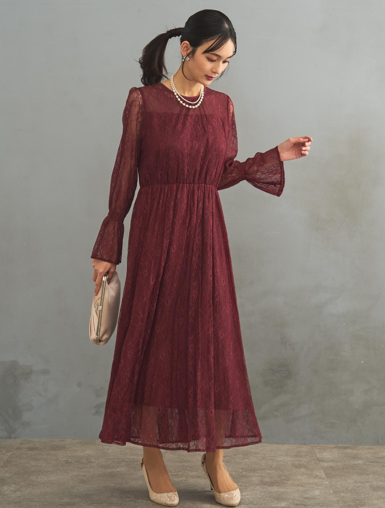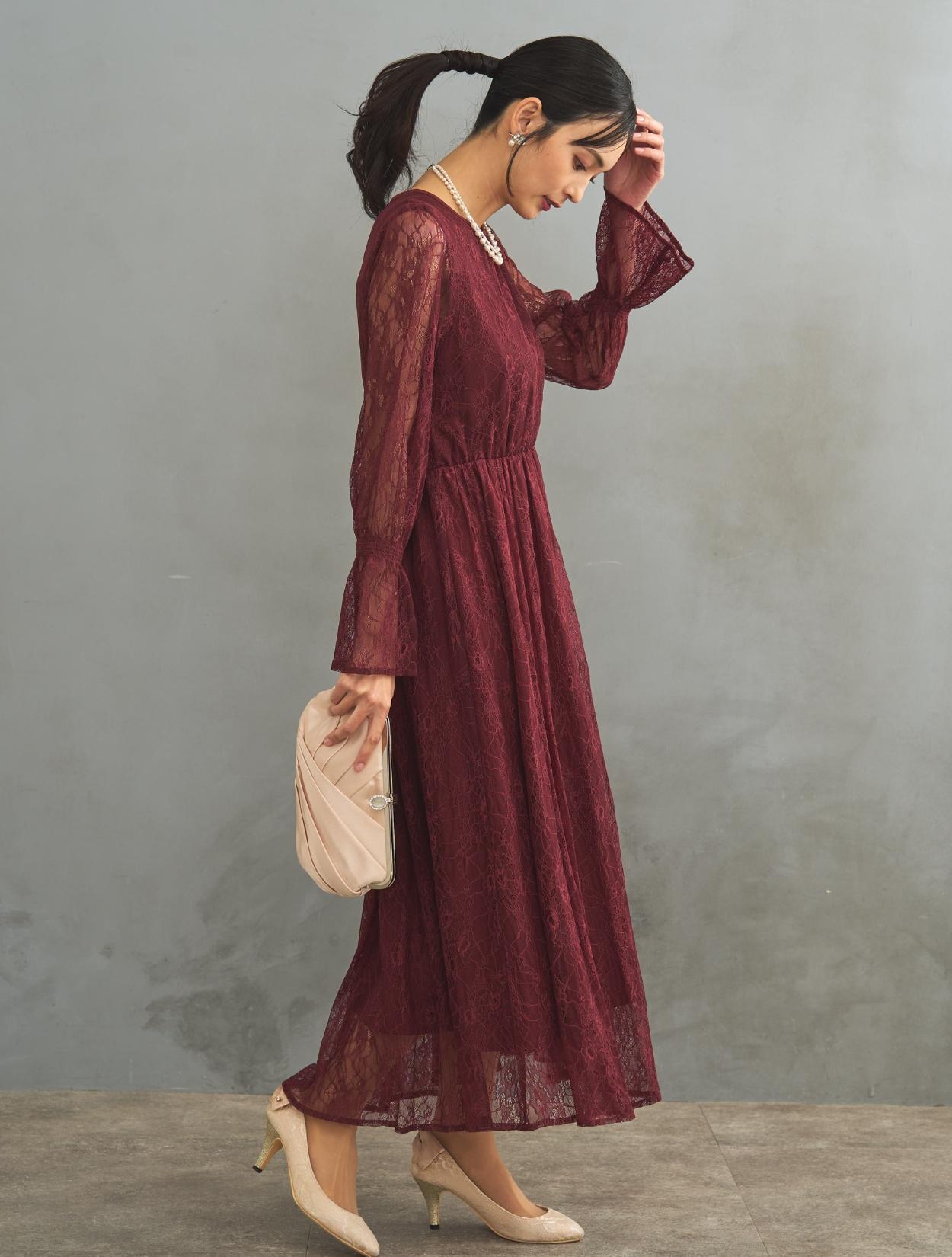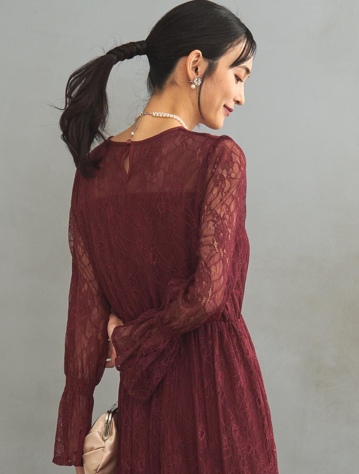 レース生地は年中ご着用いただけますが、長袖なので特に「春・秋・冬」におすすめです。また、ボルドーは秋冬に人気のカラーです。