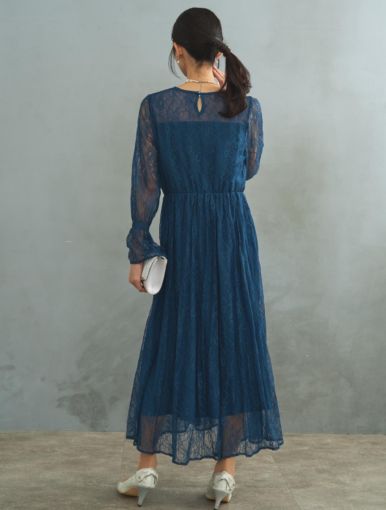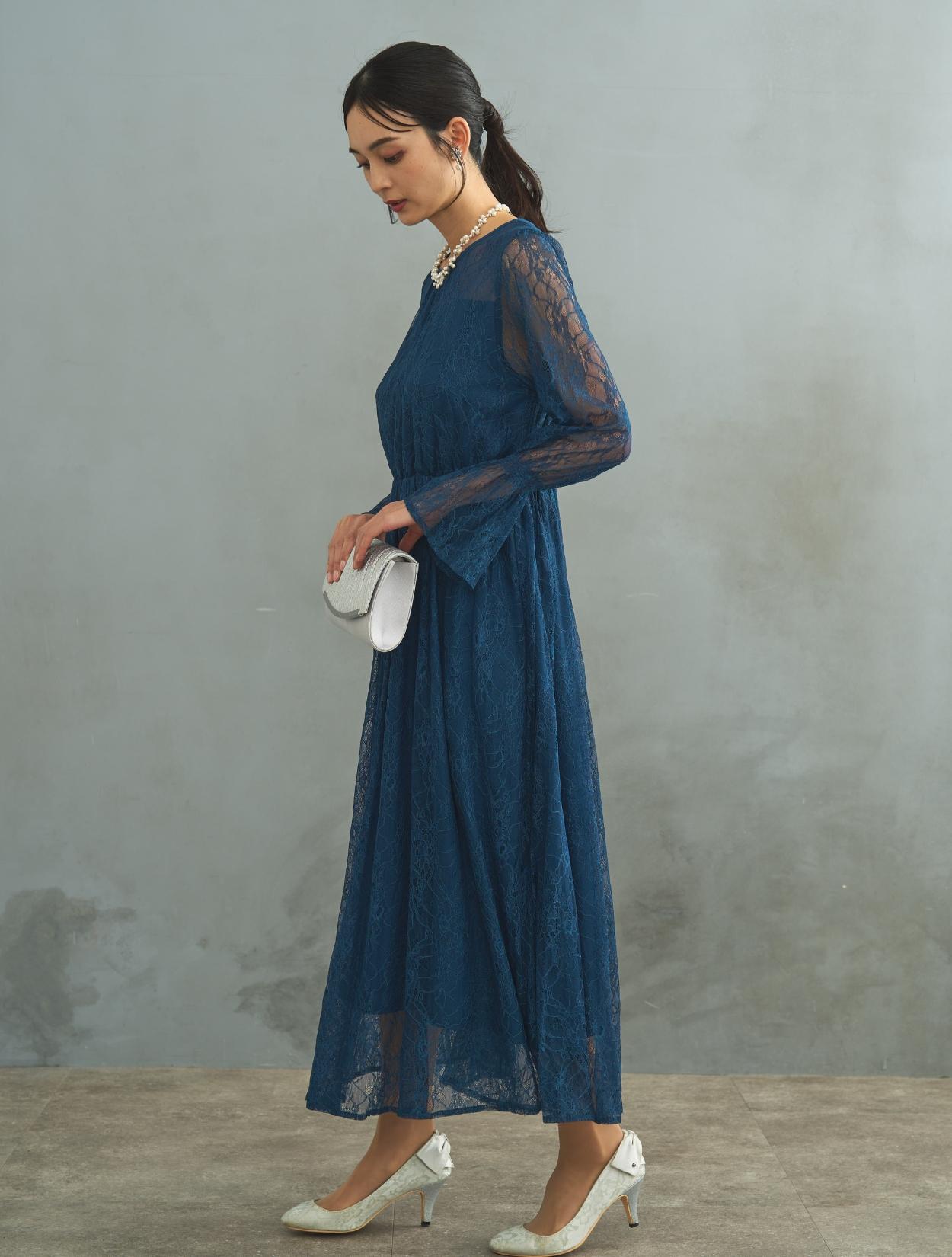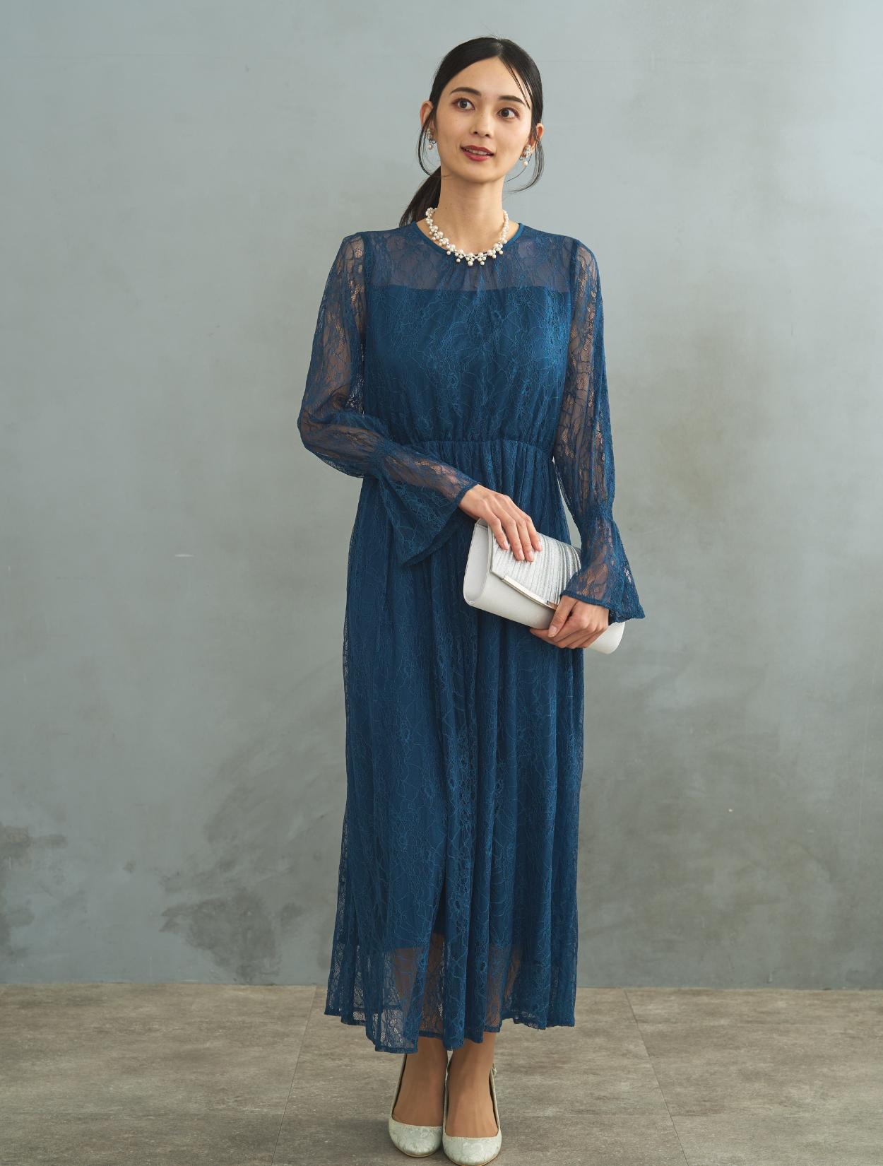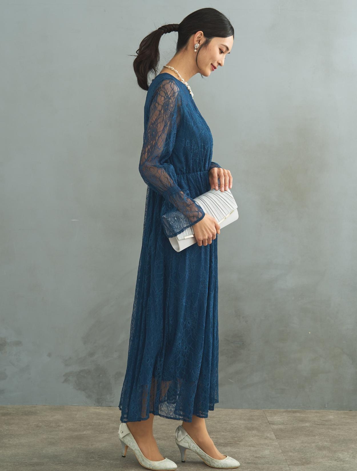 ドレスでは珍しい長袖タイプ。手首をキュッと絞ったキャンディースリーブは周りとなかなか被らないデザインです。お袖はあえて手の甲にかかるくらいに長めにデザインされています。袖ありドレスなので、結婚式でも羽織なしで安心して着用可能です。生地は総レースなので、ロング丈でも重たく見えません。裾には透け感があるので、長身でなくても着こなしやすいロングドレスです。また、ウエストはゴムなので長時間着ていても楽なデザインです。ウエストゴムでも、ウエスト周りはもたつかずスッキリ見えるデザインです。被りで着るタイプのドレスなので、背中ファスナーが心配な方でもお一人で簡単に着られます。