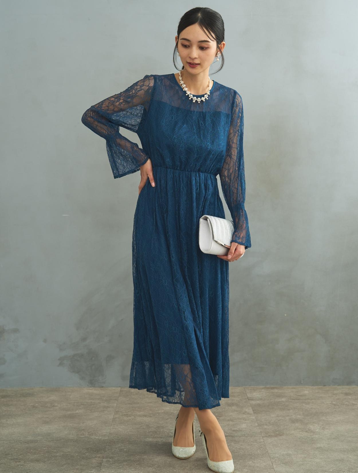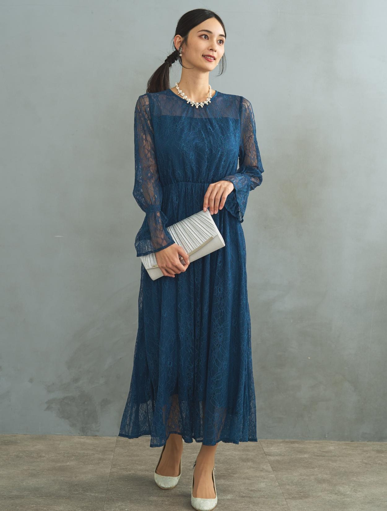 ドレスでは珍しい長袖タイプ。手首をキュッと絞ったキャンディースリーブは周りとなかなか被らないデザインです。お袖はあえて手の甲にかかるくらいに長めにデザインされています。袖ありドレスなので、結婚式でも羽織なしで安心して着用可能です。生地は総レースなので、ロング丈でも重たく見えません。裾には透け感があるので、長身でなくても着こなしやすいロングドレスです。また、ウエストはゴムなので長時間着ていても楽なデザインです。ウエストゴムでも、ウエスト周りはもたつかずスッキリ見えるデザインです。被りで着るタイプのドレスなので、背中ファスナーが心配な方でもお一人で簡単に着られます。