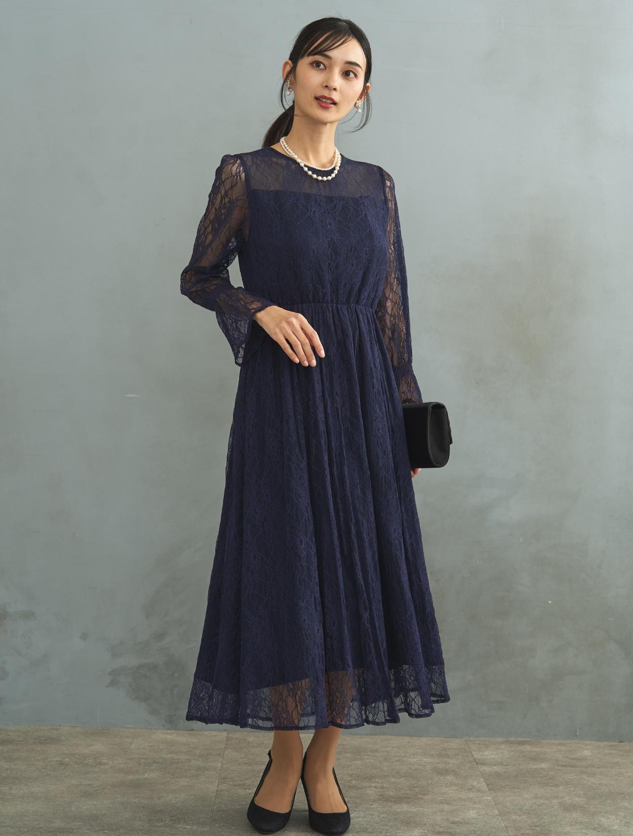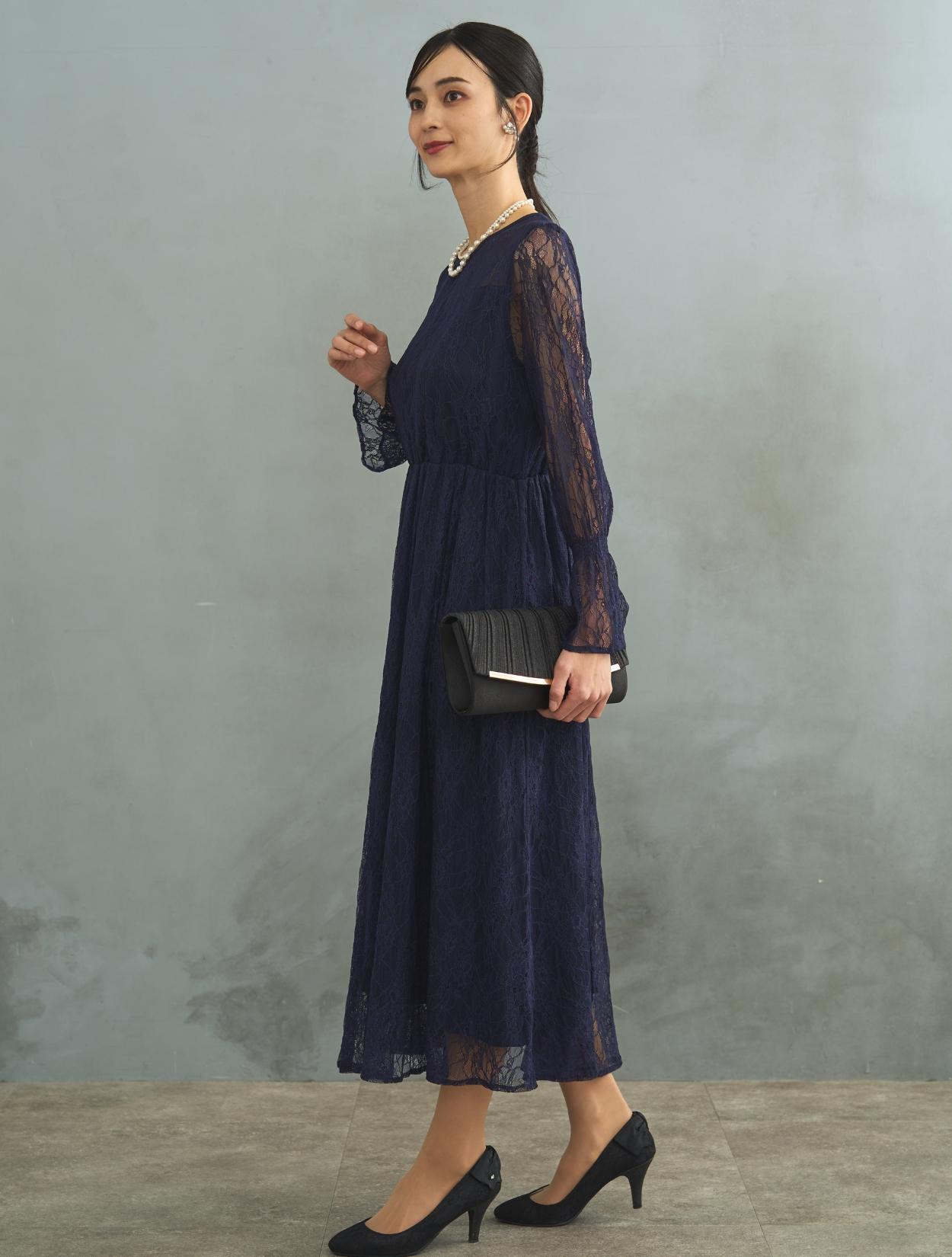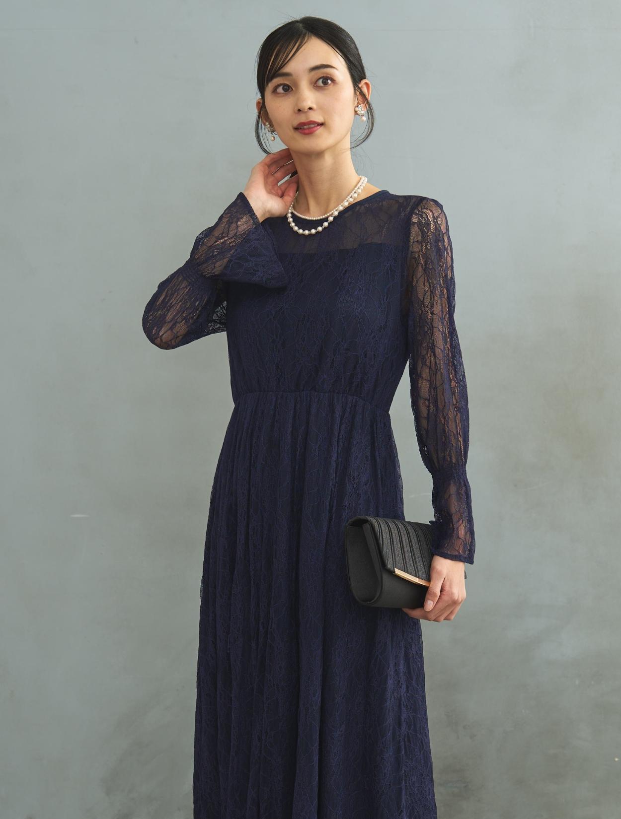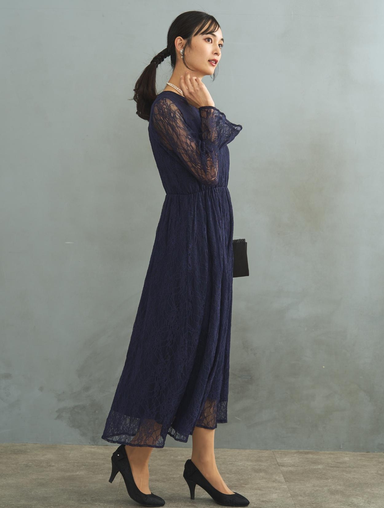 ドレスでは珍しい長袖タイプ。手首をキュッと絞ったキャンディースリーブは周りとなかなか被らないデザインです。お袖はあえて手の甲にかかるくらいに長めにデザインされています。袖ありドレスなので、結婚式でも羽織なしで安心して着用可能です。生地は総レースなので、ネイビーのロング丈でも重たく見えません。裾には透け感があるので、長身でなくても着こなしやすいロングドレスです。また、ウエストはゴムなので長時間着ていても楽なデザインです。ウエストゴムでも、ウエスト周りはもたつかずスッキリ見えるデザインです。被りで着るタイプのドレスなので、背中ファスナーが心配な方でもお一人で簡単に着られます。