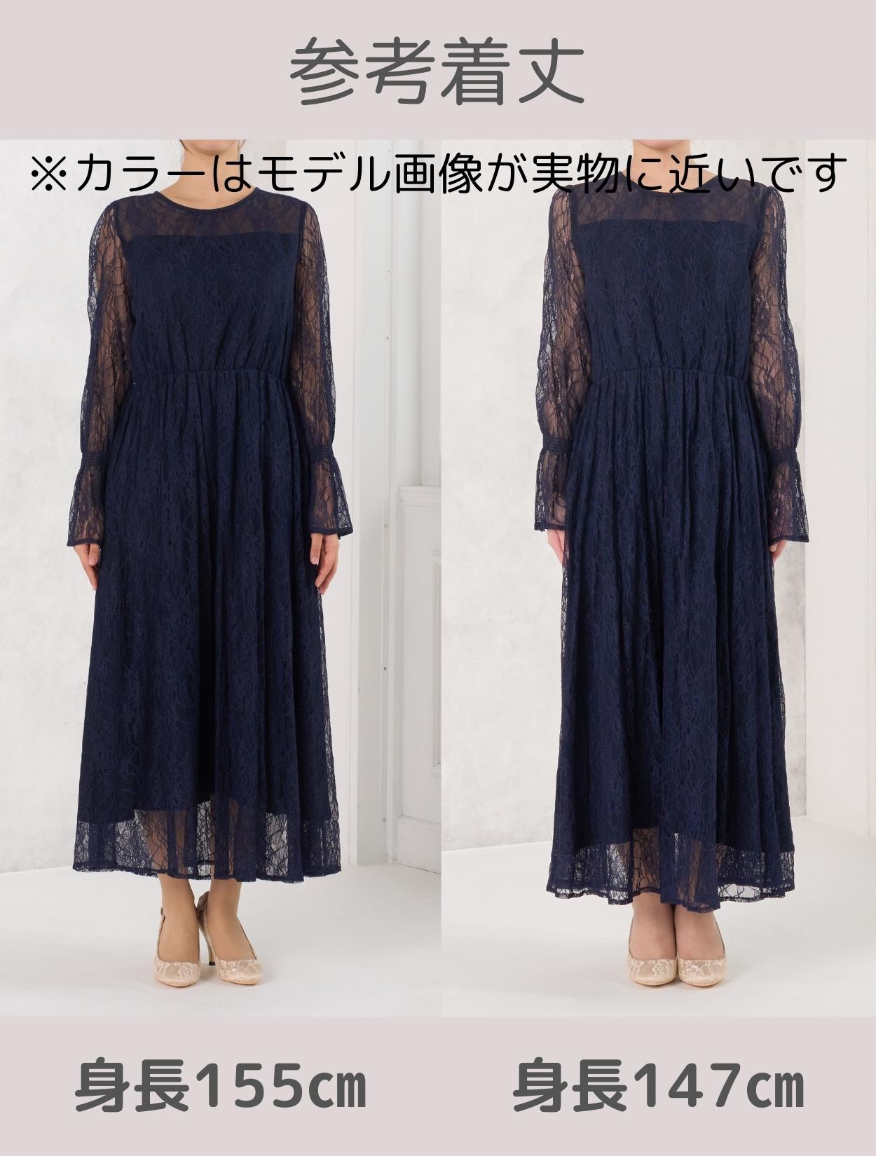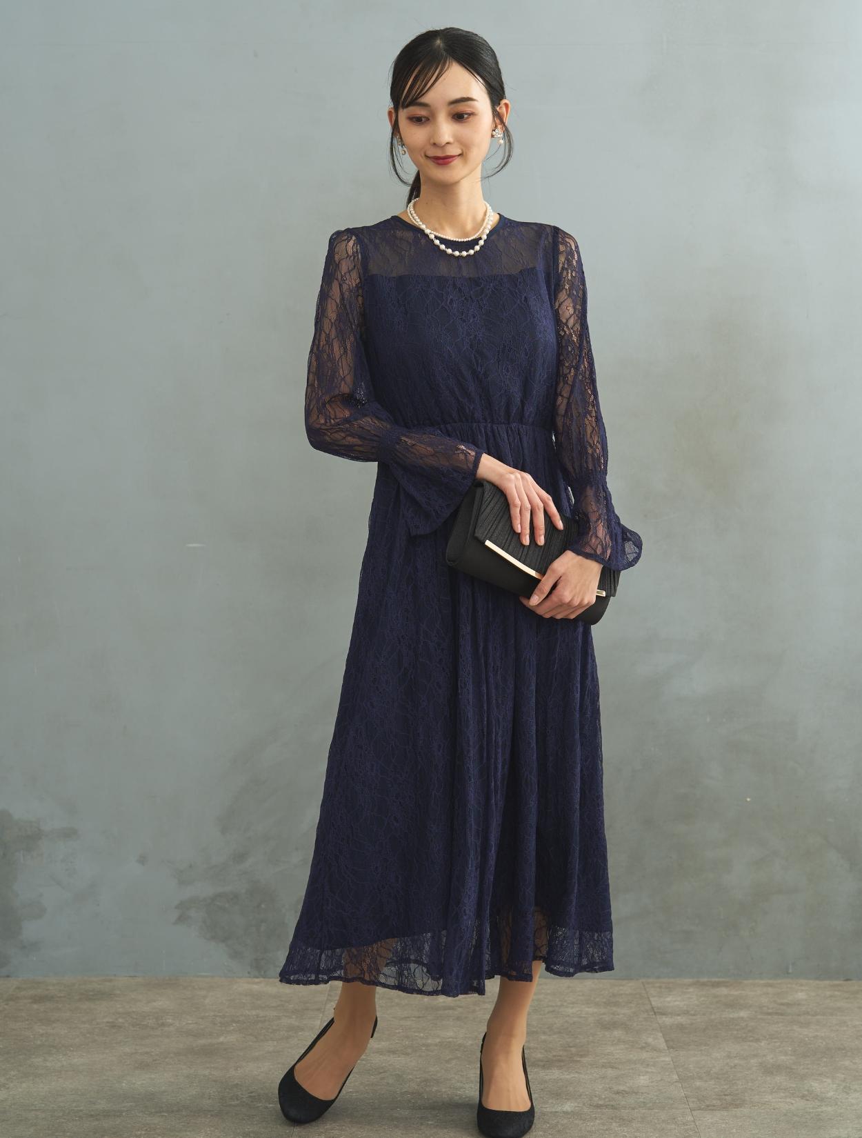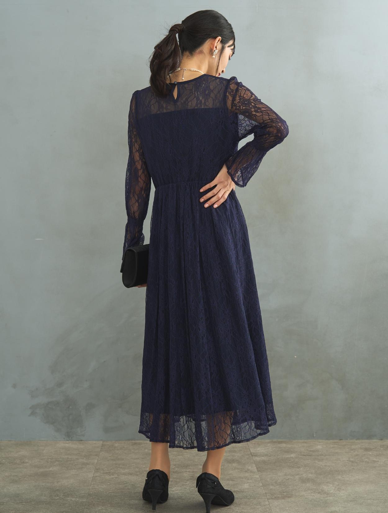 ドレスでは珍しい長袖タイプ。手首をキュッと絞ったキャンディースリーブは周りとなかなか被らないデザインです。お袖はあえて手の甲にかかるくらいに長めにデザインされています。袖ありドレスなので、結婚式でも羽織なしで安心して着用可能です。生地は総レースなので、ネイビーのロング丈でも重たく見えません。裾には透け感があるので、長身でなくても着こなしやすいロングドレスです。また、ウエストはゴムなので長時間着ていても楽なデザインです。ウエストゴムでも、ウエスト周りはもたつかずスッキリ見えるデザインです。被りで着るタイプのドレスなので、背中ファスナーが心配な方でもお一人で簡単に着られます。