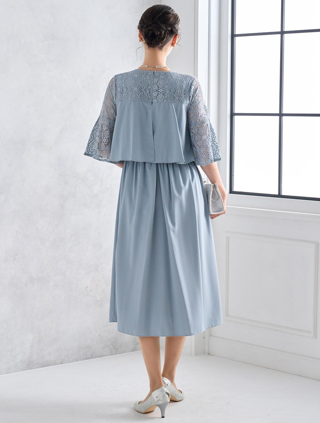 トレンドのレース素材のドレスですが、デコルテ部分には裏地が付いているのでインナーの肩紐が透ける心配はありません。割としっかりしたレースなので、二の腕の透け感も程よく安心感があり上品です。肘までしっかり隠れるほどの袖丈で、裾広がりにデザインされたお袖は、手首を女性らしく華奢に見せてくれるのも嬉しいポイント。人気の袖ありドレスは、結婚式でも一枚で着られます。トップはふんわりとしたオーバーブラウスのようなデザインで、上半身が華やかに見える事から写真写りにも◎。足首がしっかり見えるミモレ丈のスカートは、全体の印象をスッキリ見せてくれます。ウエストゴム仕様で、長時間着用していても楽に着られます。