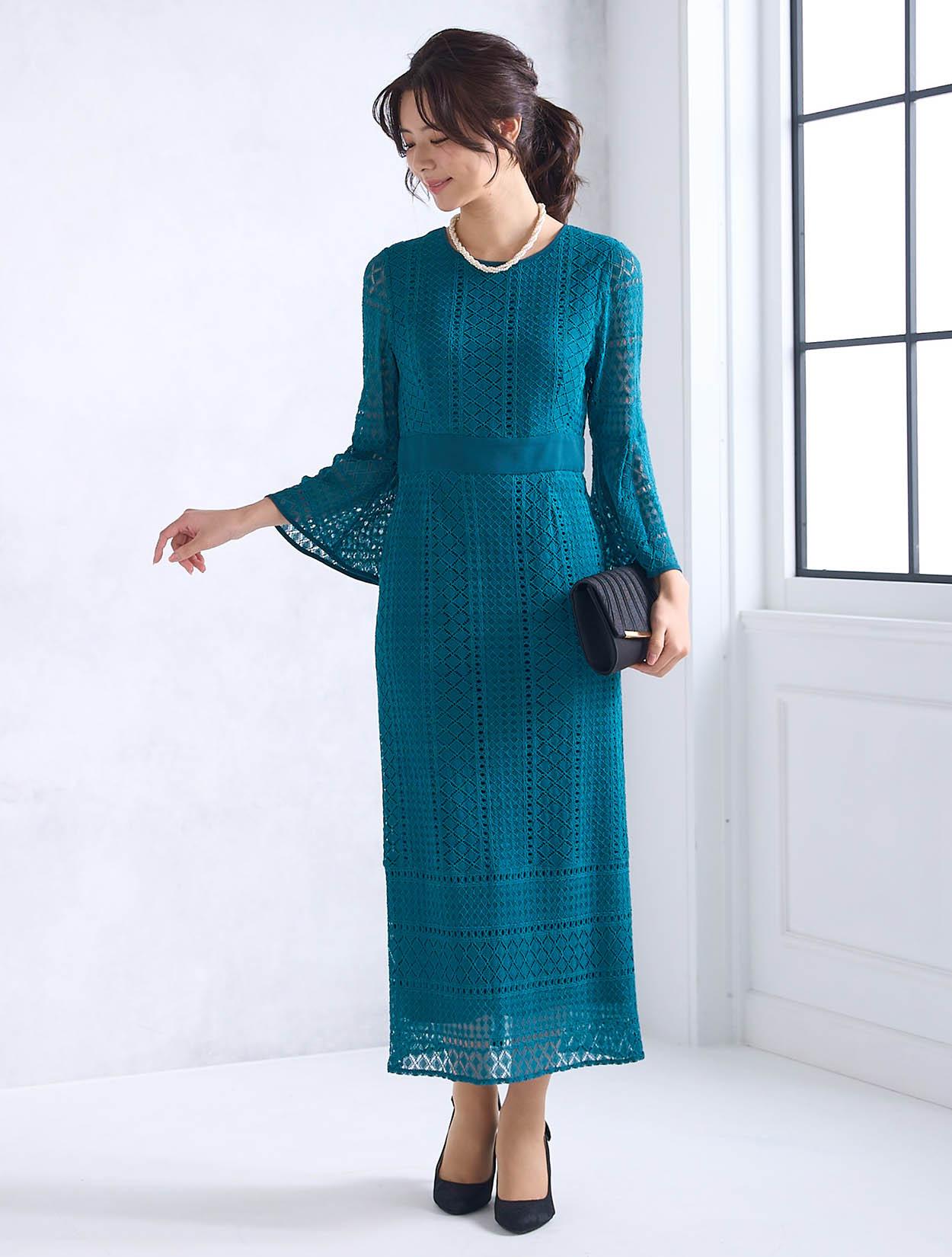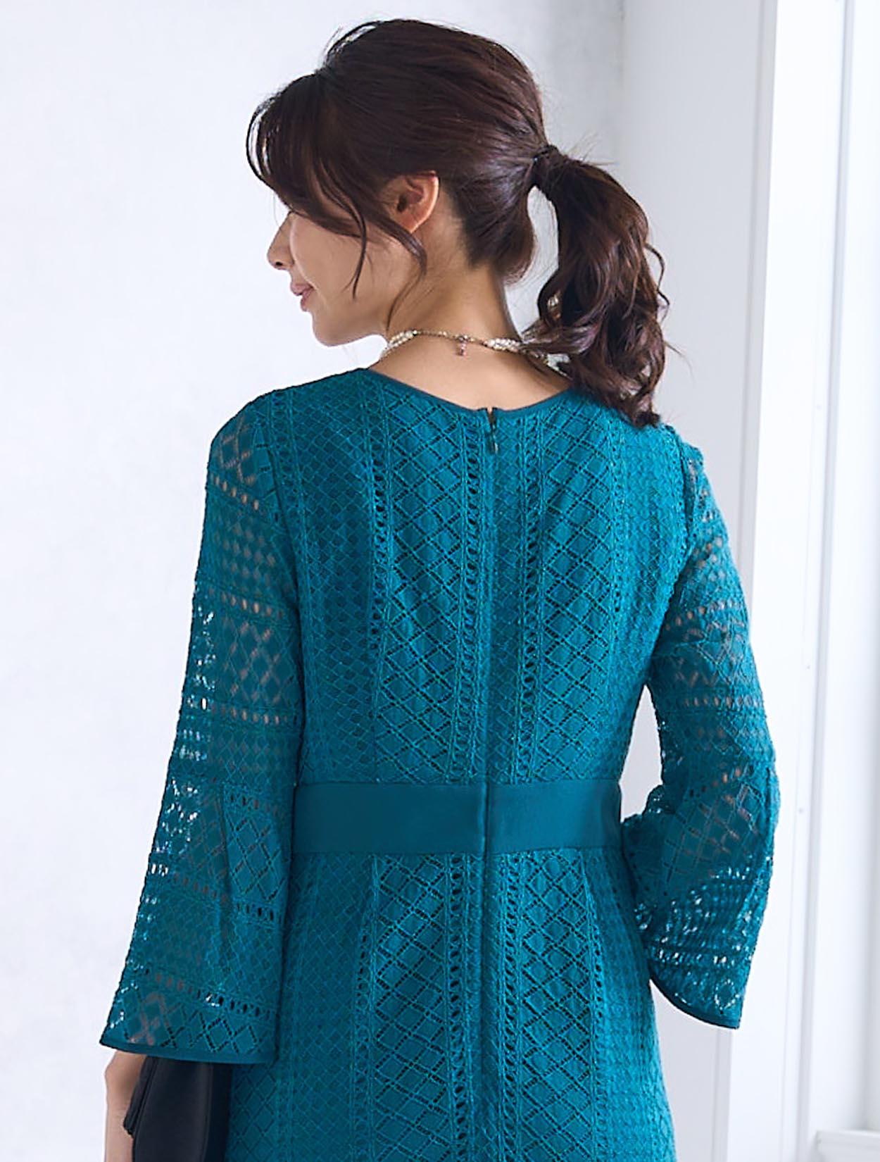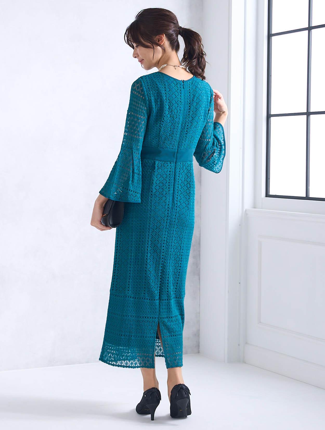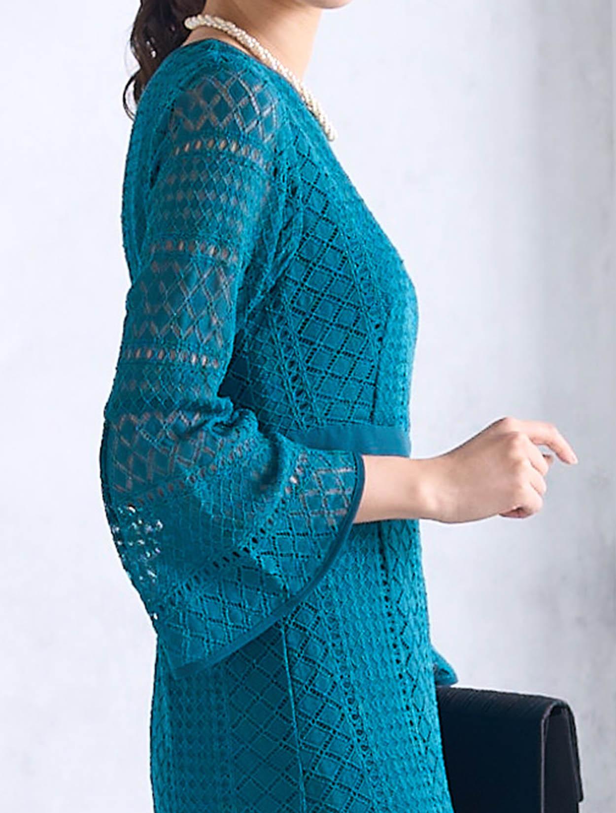 スカートが広がらない大人っぽいスタイルのドレスです。程よくタイトめなラインは、周りと被りずらくおしゃれさんにも人気。背中ファスナーで上半身から腰回りまでもたつかずキレイに着こなせます。ファスナーは外から見えにくいコンシールタイプで、少し開閉しずらい場合があります。タイトなデザインで伸縮はないので、全体的に3㎝程余裕があるサイズを選ぶと楽に着られます。クロシェ風のレース編みが特徴的で、透け過ぎず上品です。デコルテ部分のレースには裏地がついているので、インナー選びも難しくありません。お袖は華やかに広がったベルスリーブは、落ち着いたタイトドレスを一気にパーティー仕様にしてくれます。背中ファスナーで首元が開いていないので、普段Sサイズを着ている方でも着やすいドレスです。
