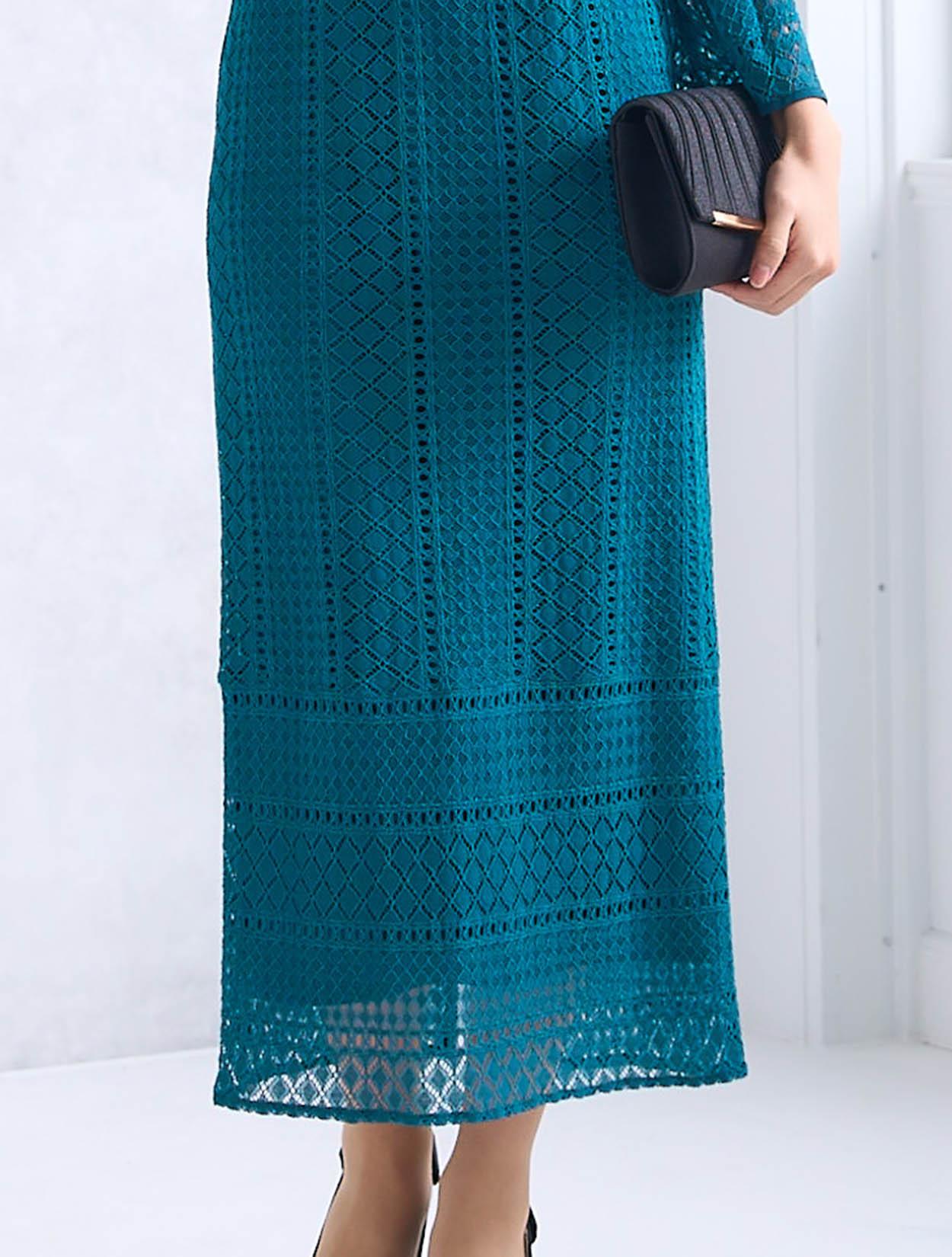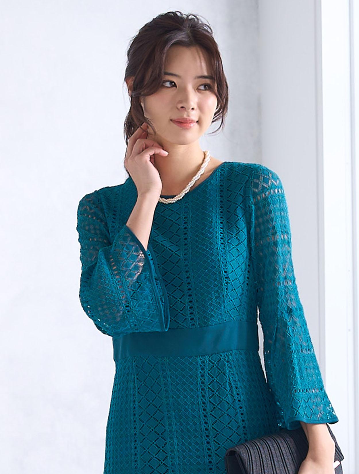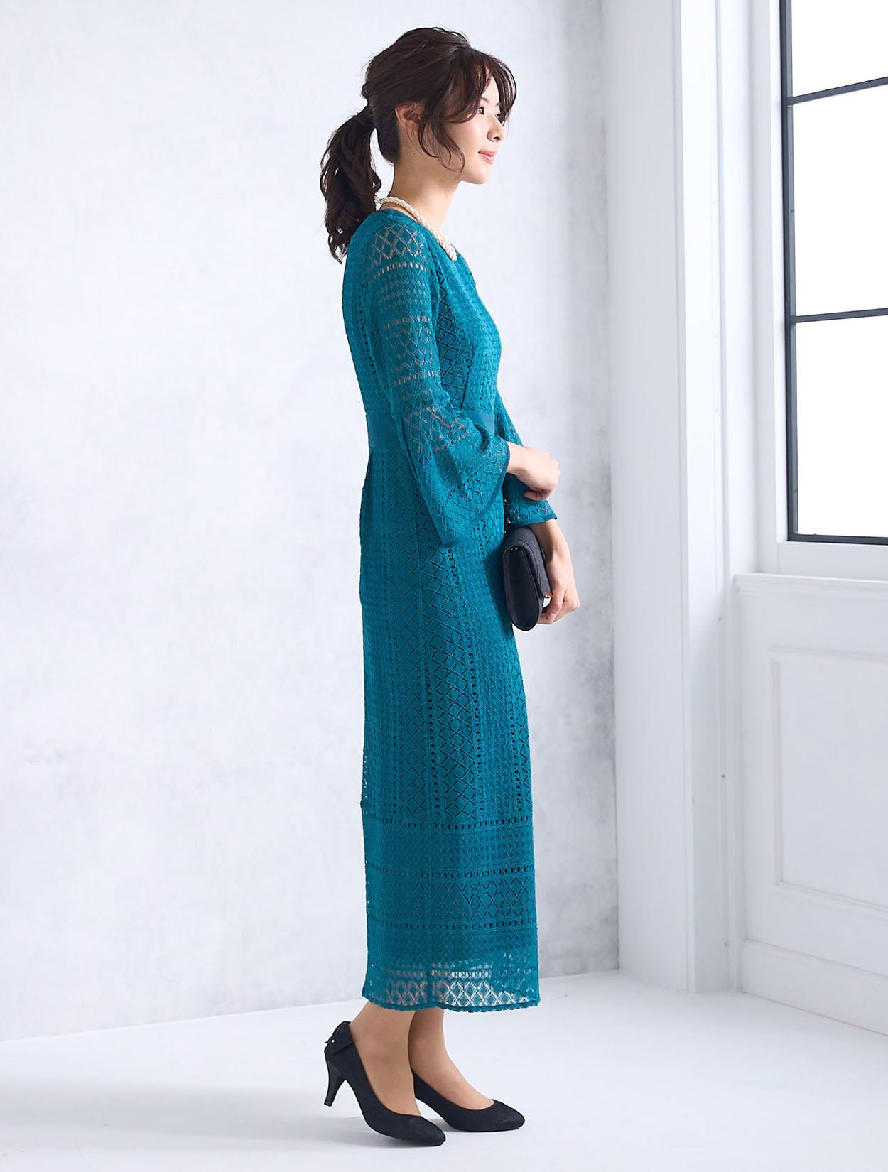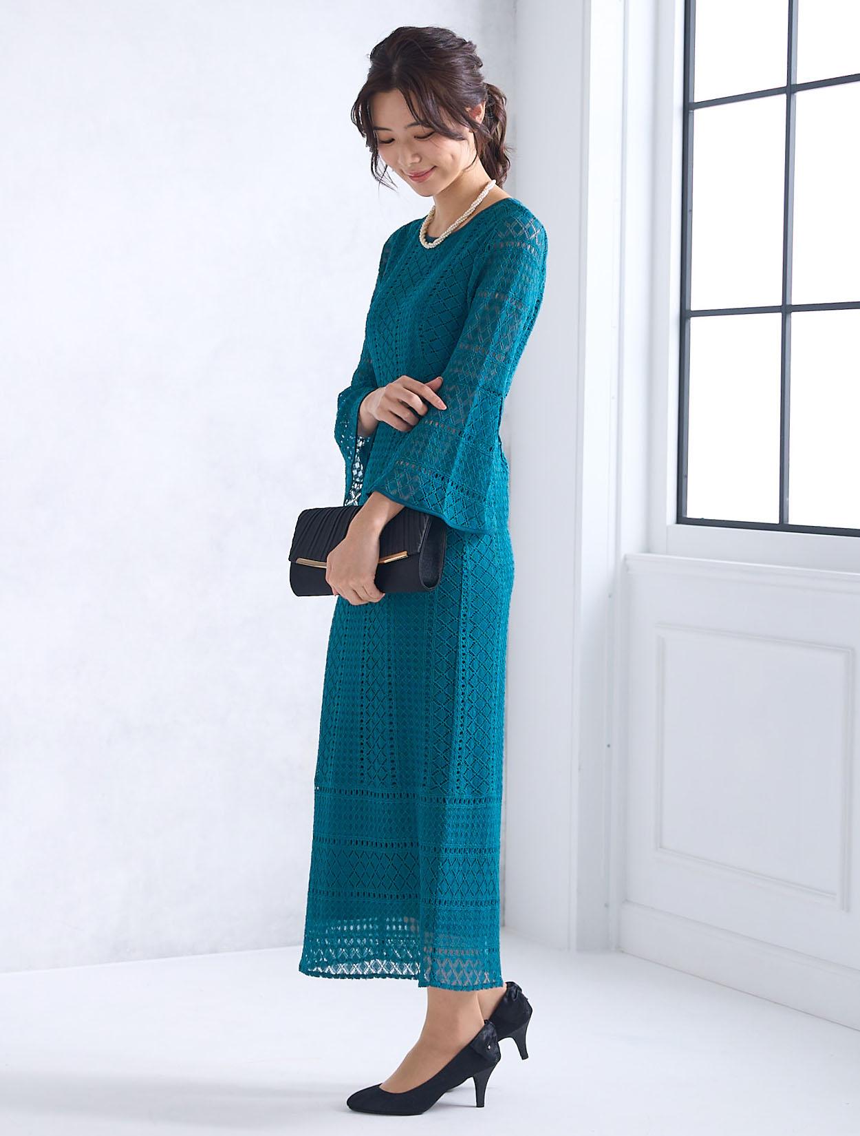 スカートが広がらない大人っぽいスタイルのドレスです。程よくタイトめなラインは、周りと被りずらくおしゃれさんにも人気。背中ファスナーで上半身から腰回りまでもたつかずキレイに着こなせます。ファスナーは外から見えにくいコンシールタイプで、少し開閉しずらい場合があります。タイトなデザインで伸縮はないので、全体的に3㎝程余裕があるサイズを選ぶと楽に着られます。クロシェ風のレース編みが特徴的で、透け過ぎず上品です。デコルテ部分のレースには裏地がついているので、インナー選びも難しくありません。お袖は華やかに広がったベルスリーブは、落ち着いたタイトドレスを一気にパーティー仕様にしてくれます。背中ファスナーで首元が開いていないので、普段Sサイズを着ている方でも着やすいドレスです。