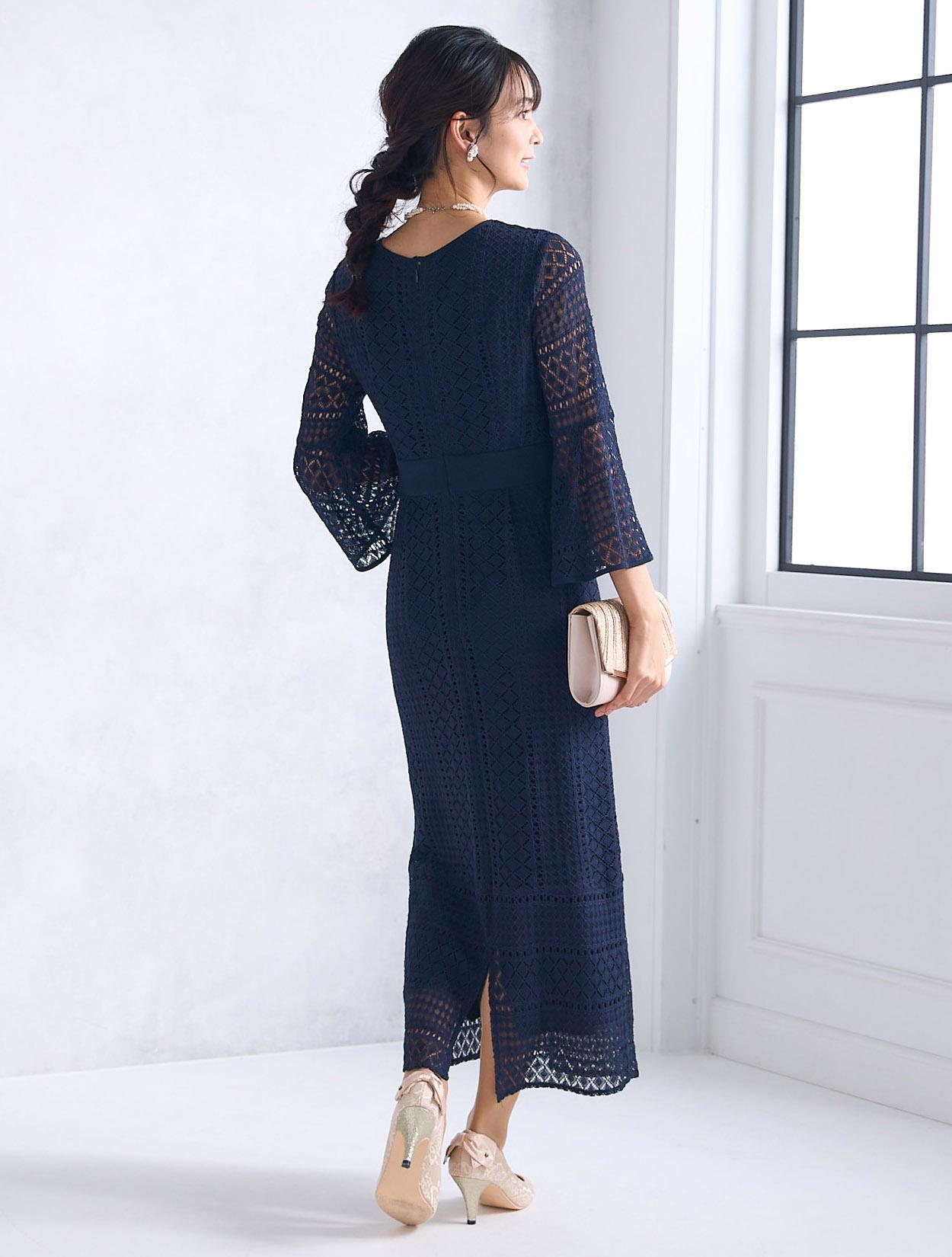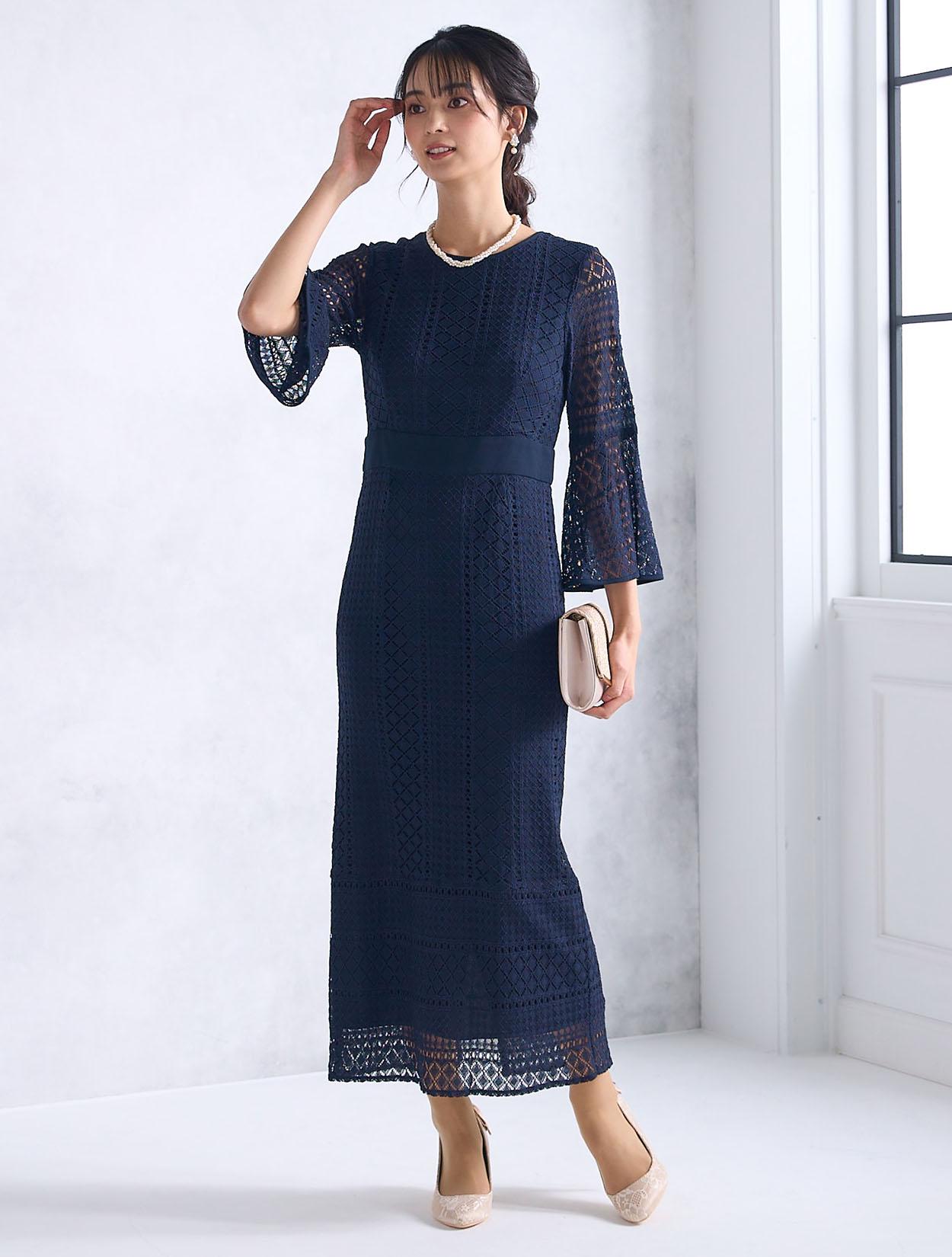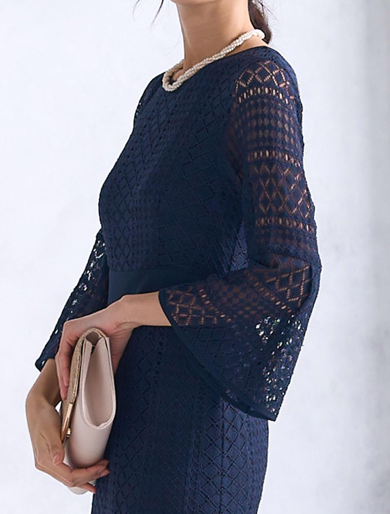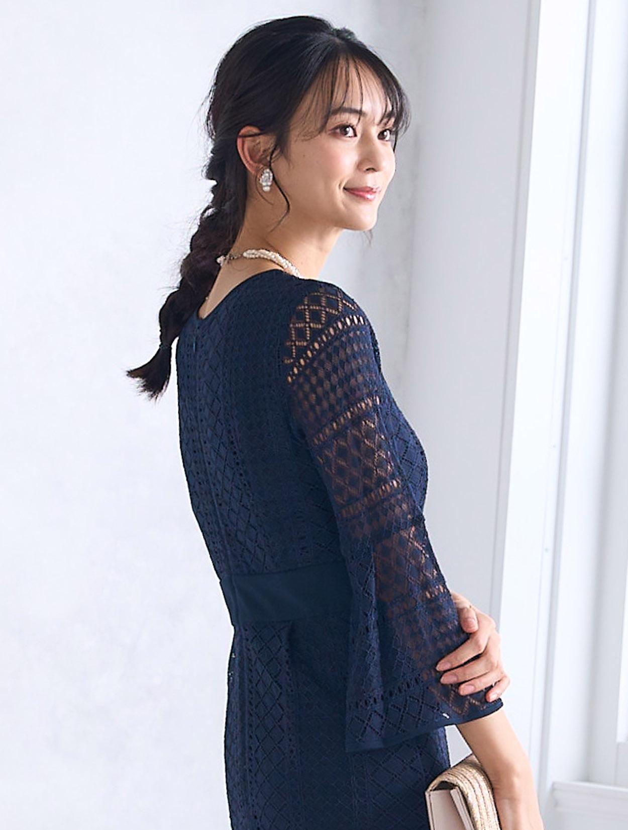 スカートが広がらない大人っぽいスタイルのドレスです。程よくタイトめなラインは、周りと被りずらくおしゃれさんにも人気。背中ファスナーで上半身から腰回りまでもたつかずキレイに着こなせます。ファスナーは外から見えにくいコンシールタイプで、少し開閉しずらい場合があります。タイトなデザインで伸縮はないので、全体的に3㎝程余裕があるサイズを選ぶと楽に着られます。クロシェ風のレース編みが特徴的で、透け過ぎず上品です。デコルテ部分のレースには裏地がついているので、インナー選びも難しくありません。お袖は華やかに広がったベルスリーブ。落ち着いたネイビードレスも、このスリーブデザインで一気にパーティー仕様になります。背中ファスナーで首元が開いていないので、普段Sサイズを着ている方でも着やすいドレスです。