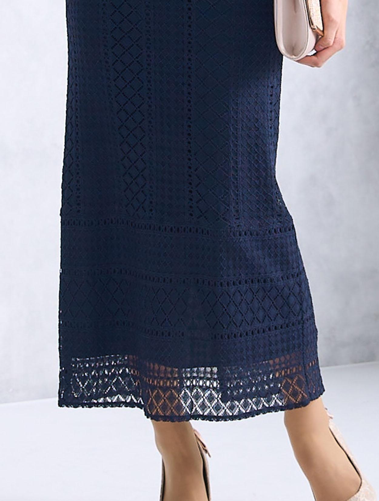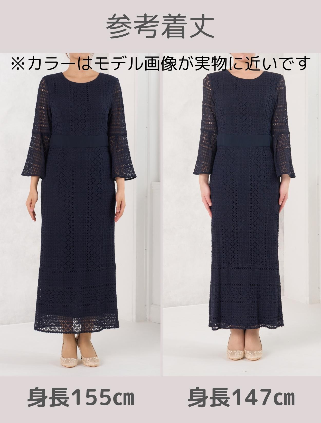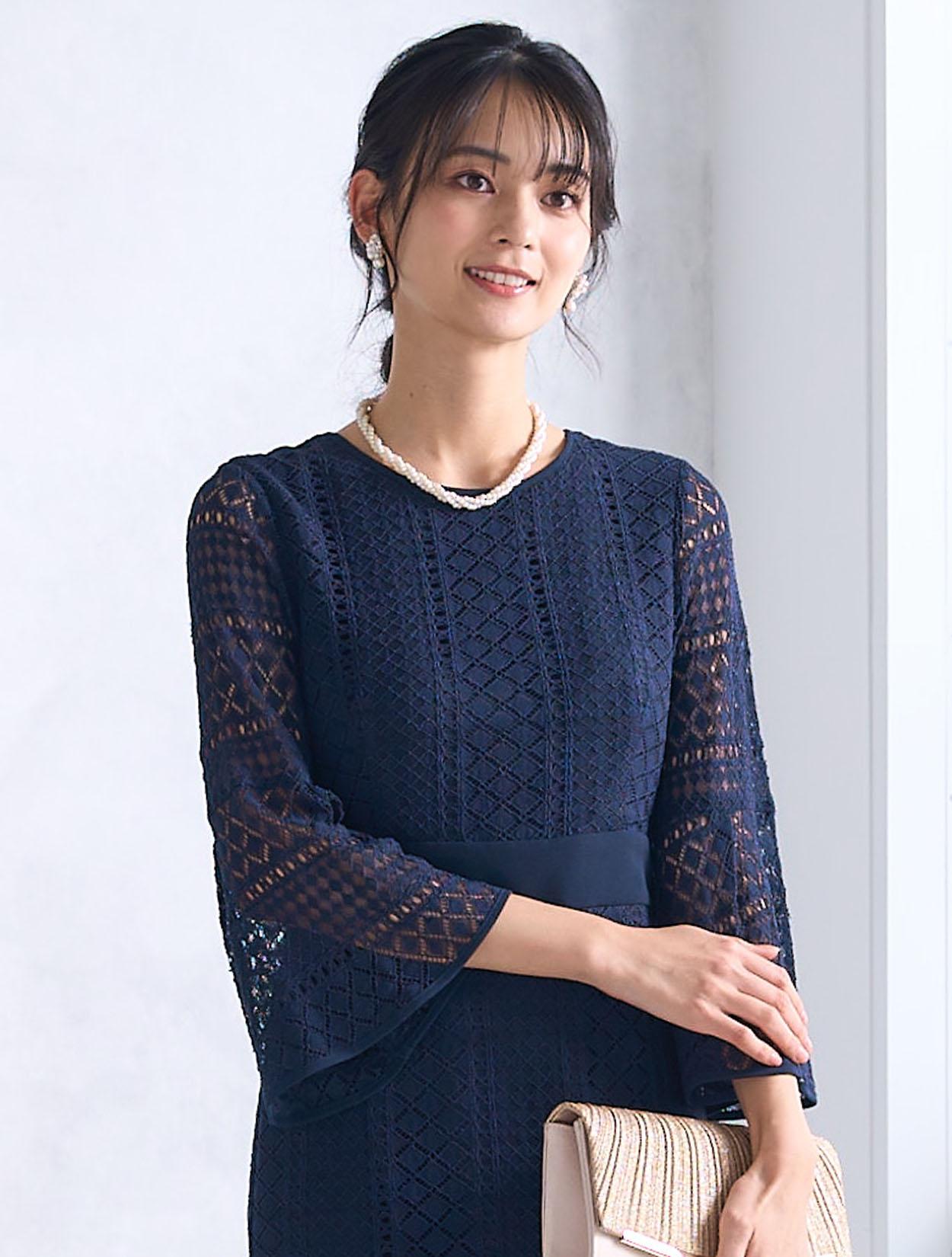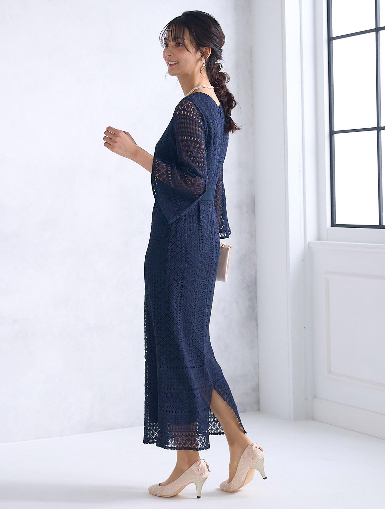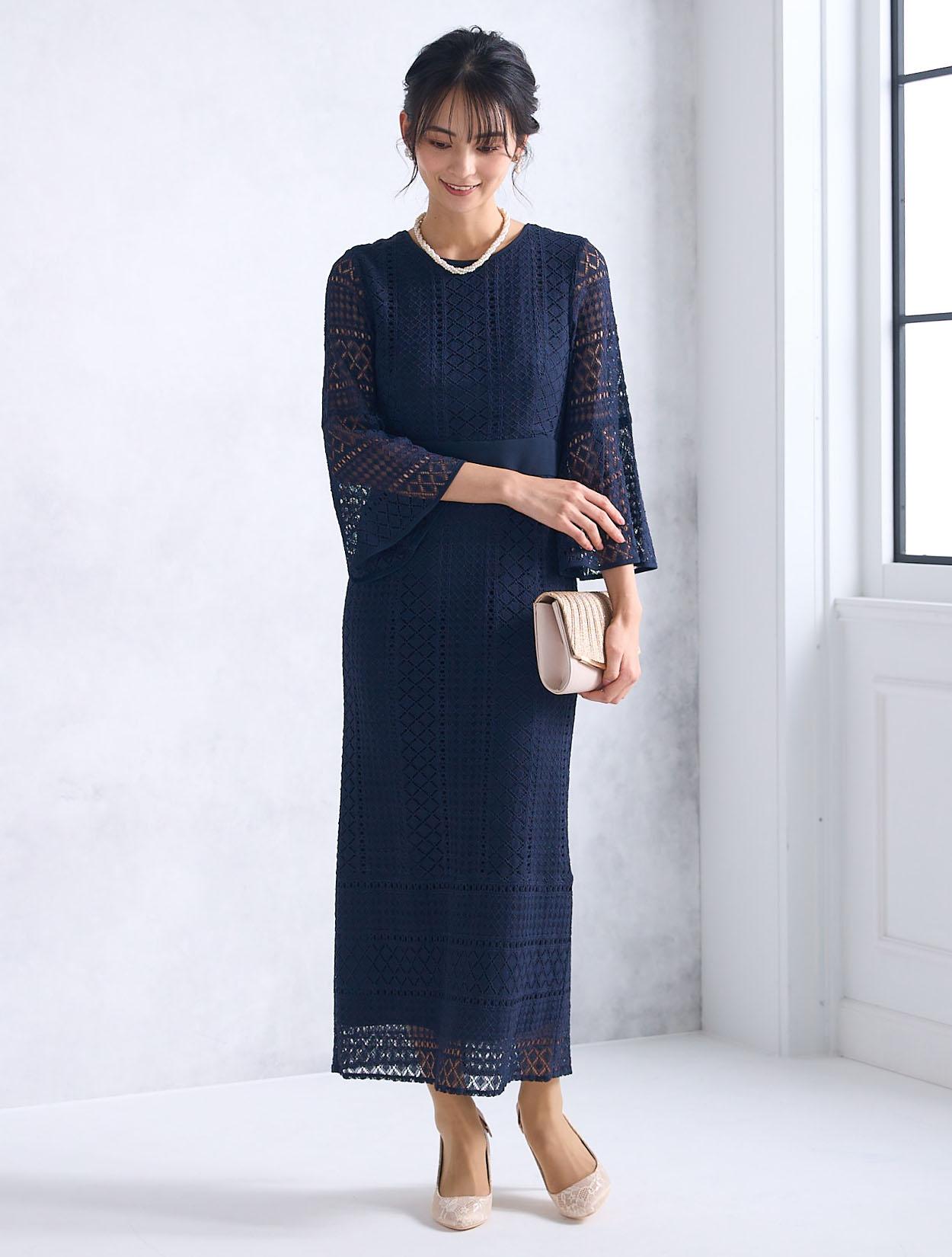 スカートが広がらない大人っぽいスタイルのドレスです。程よくタイトめなラインは、周りと被りずらくおしゃれさんにも人気。背中ファスナーで上半身から腰回りまでもたつかずキレイに着こなせます。ファスナーは外から見えにくいコンシールタイプで、少し開閉しずらい場合があります。タイトなデザインで伸縮はないので、全体的に3㎝程余裕があるサイズを選ぶと楽に着られます。クロシェ風のレース編みが特徴的で、透け過ぎず上品です。デコルテ部分のレースには裏地がついているので、インナー選びも難しくありません。お袖は華やかに広がったベルスリーブ。落ち着いたネイビードレスも、このスリーブデザインで一気にパーティー仕様になります。背中ファスナーで首元が開いていないので、普段Sサイズを着ている方でも着やすいドレスです。