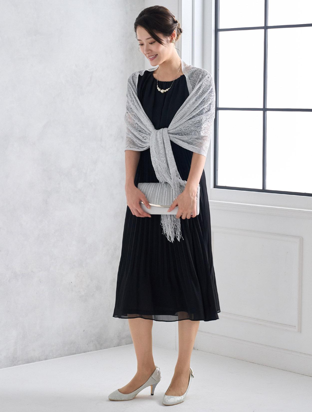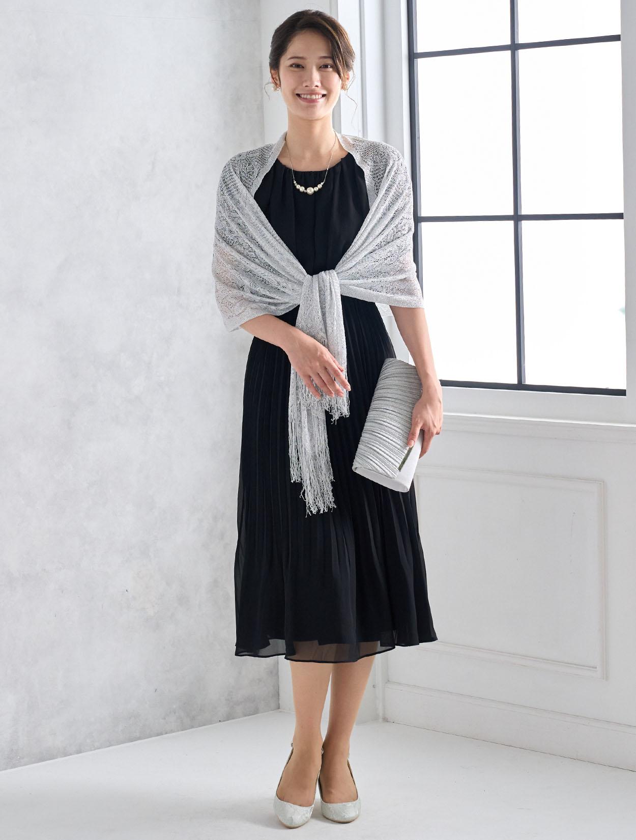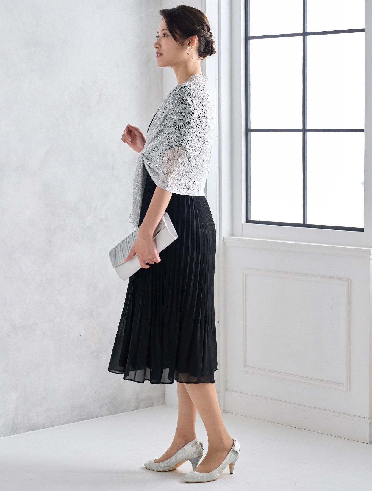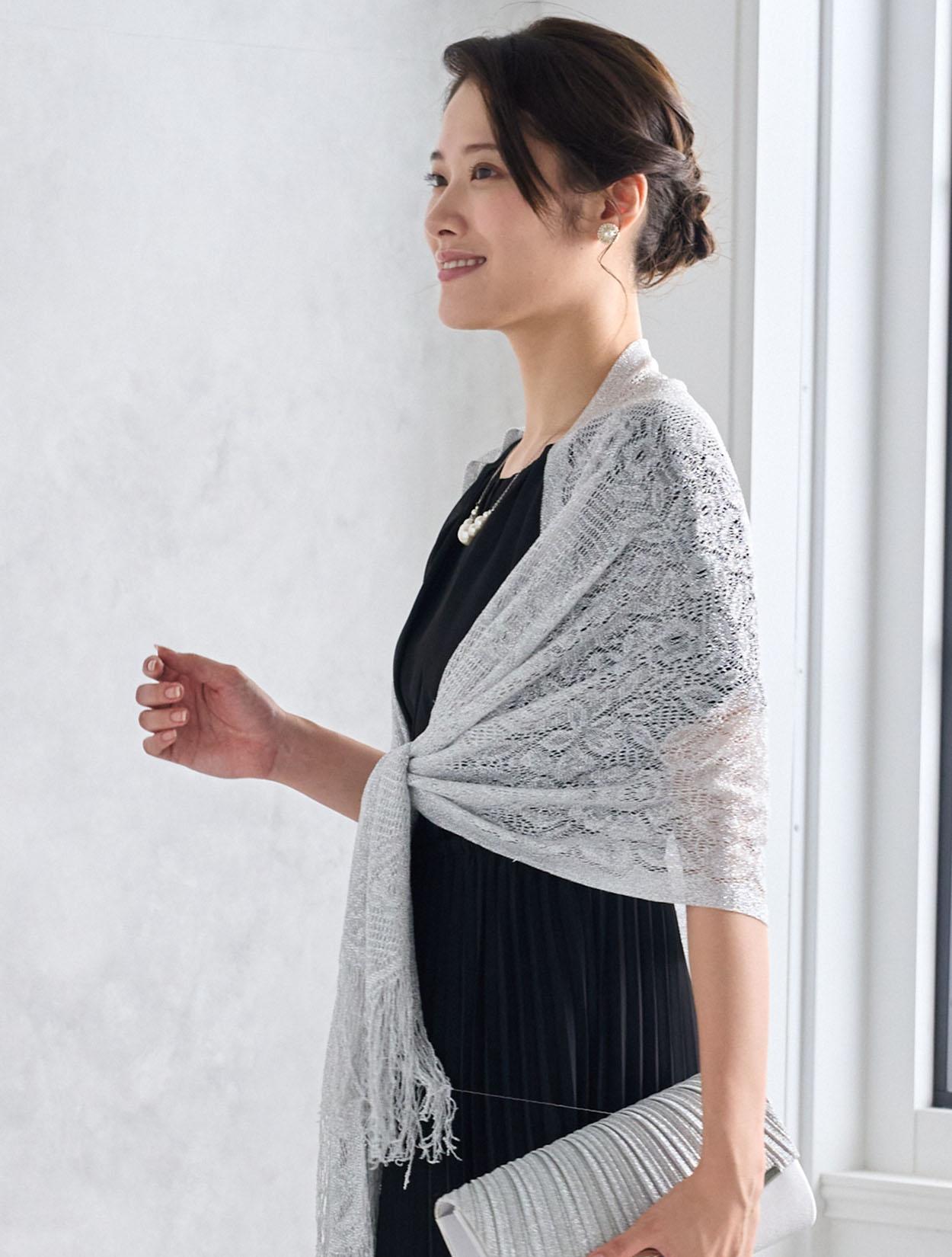 シルバーのラメショールがブラックドレスをぐっと華やかに見せてくれます。シックなブラックドレスが一気に大人のパーティー仕様に。ご親族に人気のコーデです。