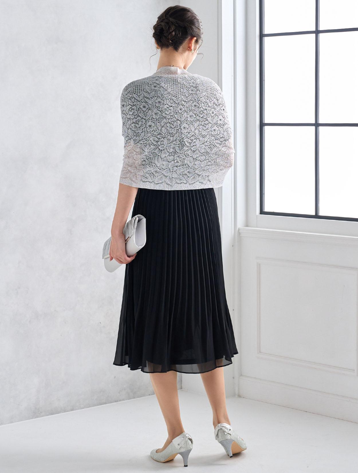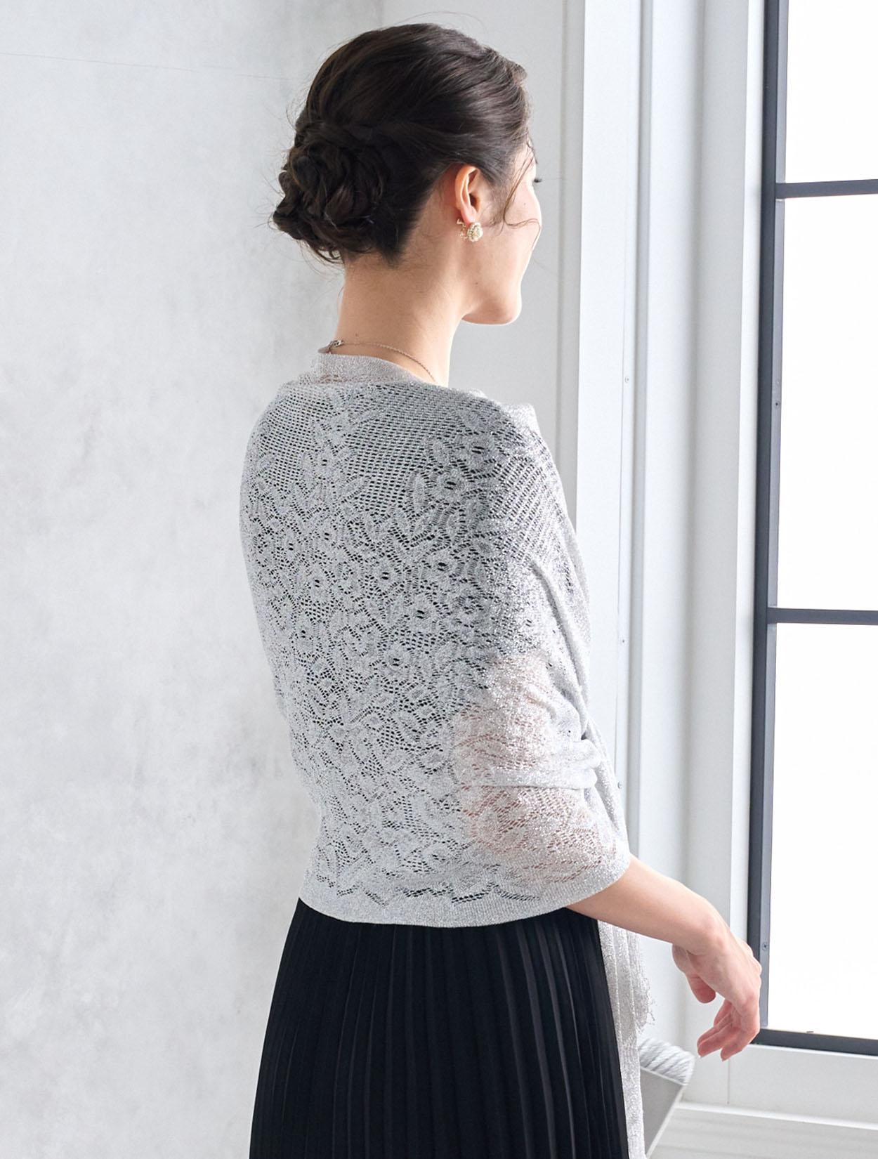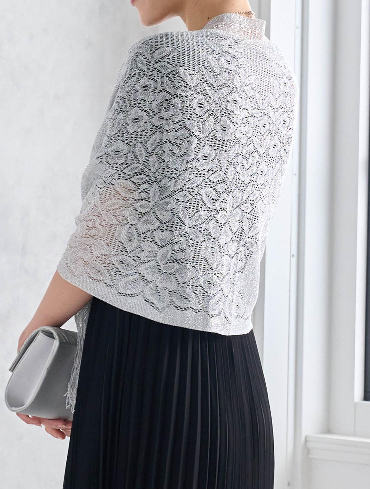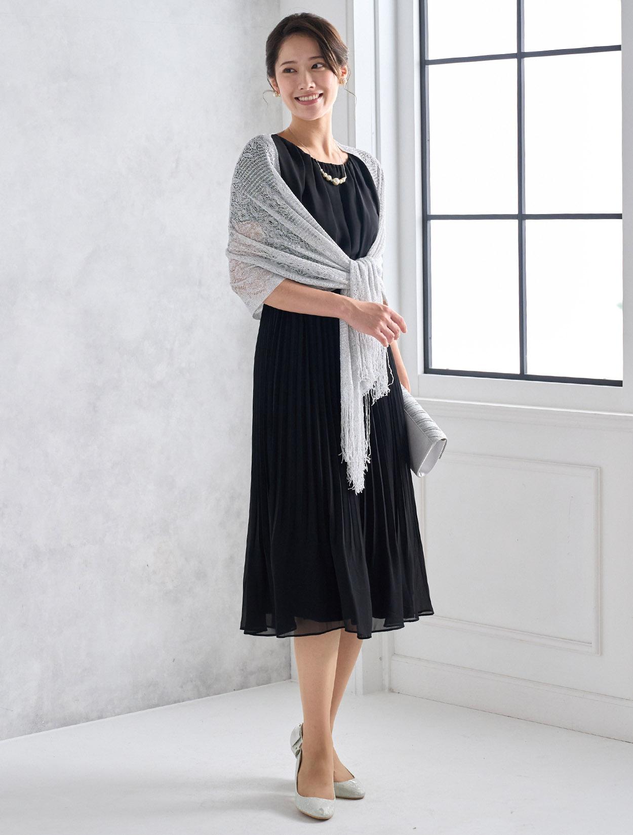シルバーのラメショールがブラックドレスをぐっと華やかに見せてくれます。シックなブラックドレスが一気に大人のパーティー仕様に。ご親族に人気のコーデです。