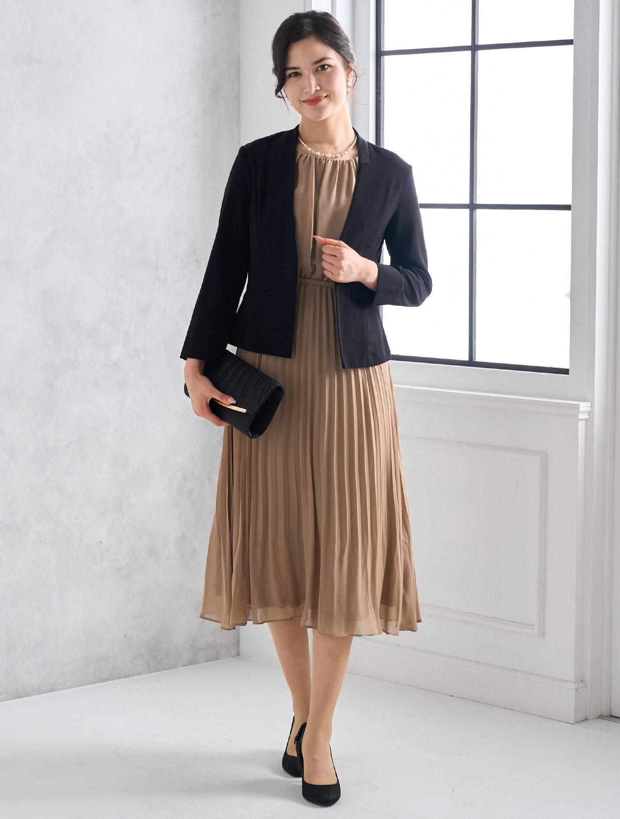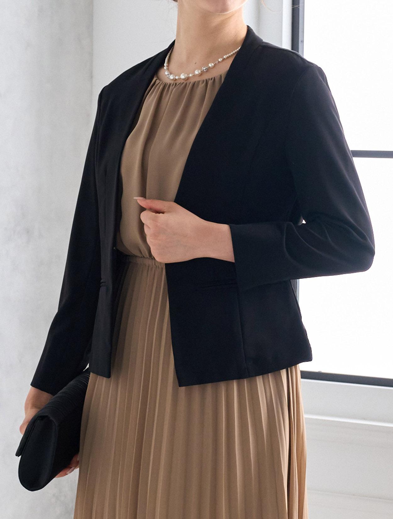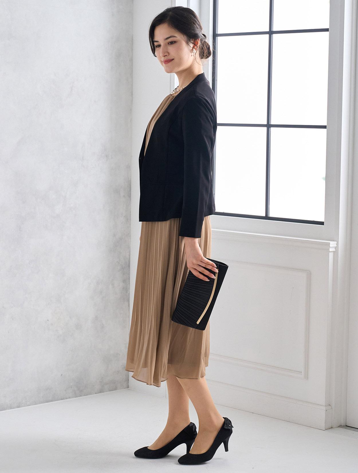 ブラックのジャケットを合わせたメリハリときちんと感のあるコーディネート。着丈が長めのジャケットは落ち着いて見えるので、ご親族にもおすすめのドレスコーデです。