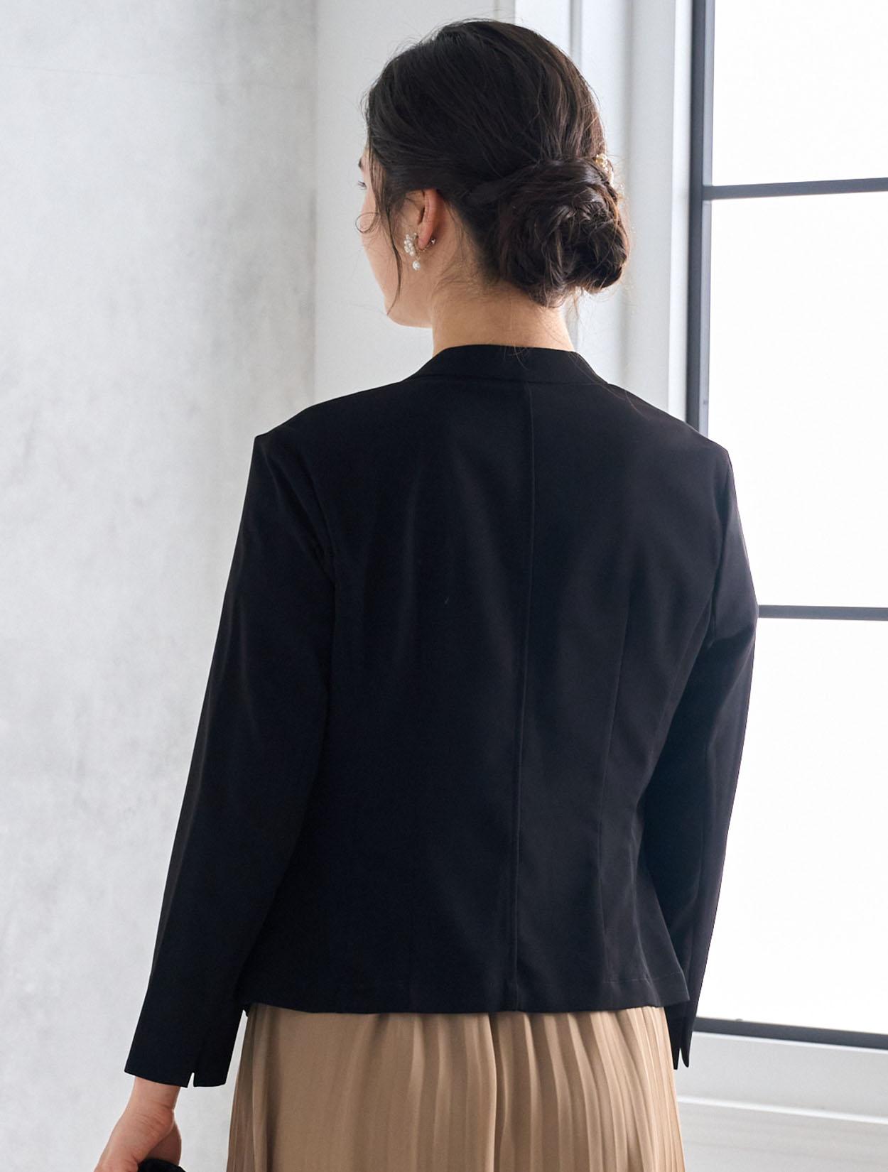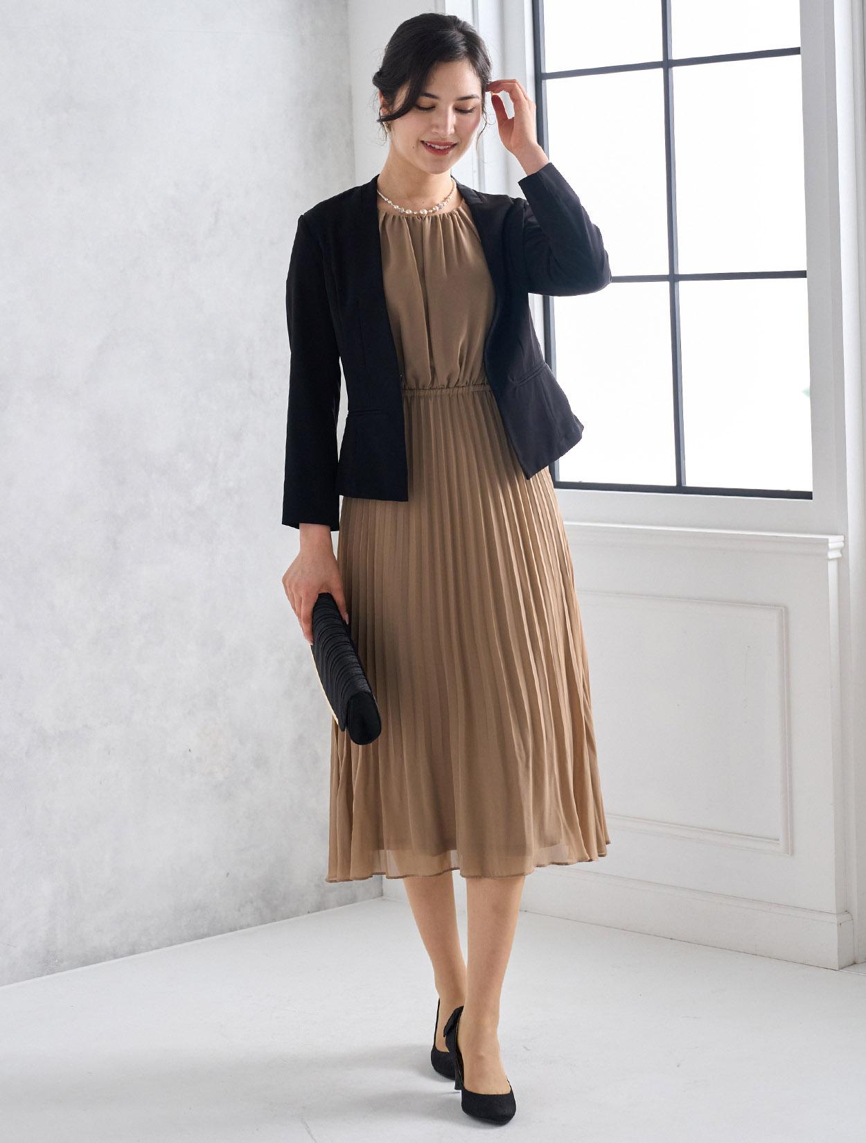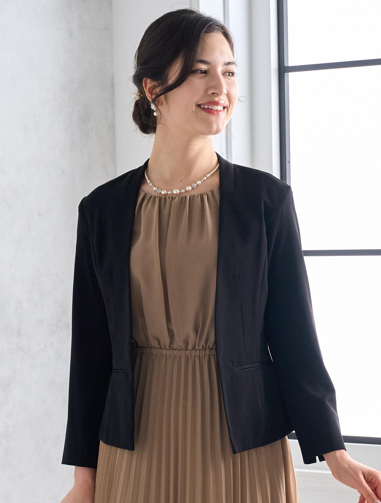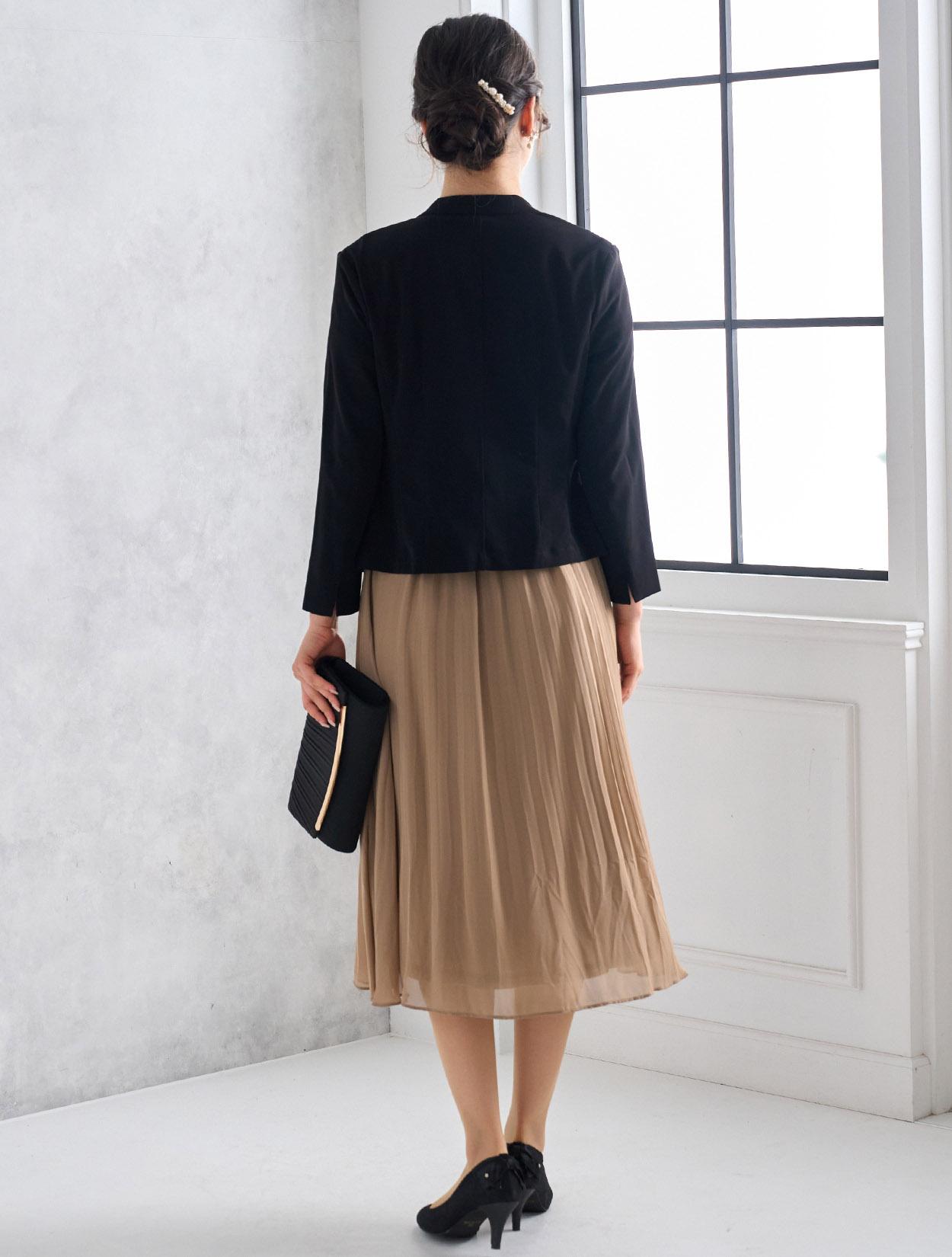 ブラックのジャケットを合わせたメリハリときちんと感のあるコーディネート。着丈が長めのジャケットは落ち着いて見えるので、ご親族にもおすすめのドレスコーデです。
