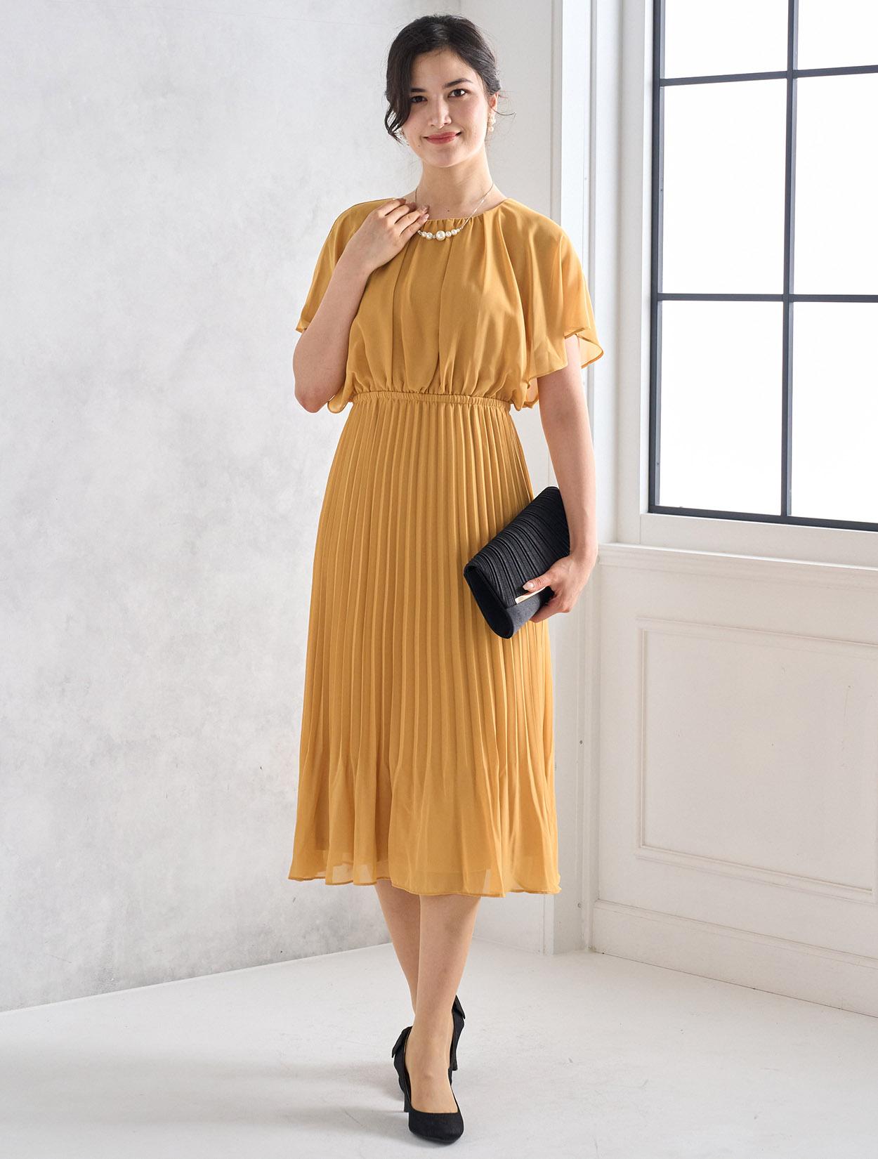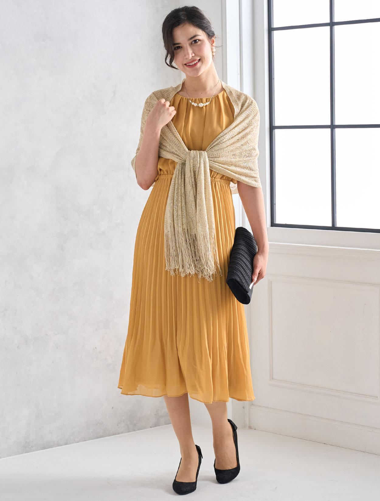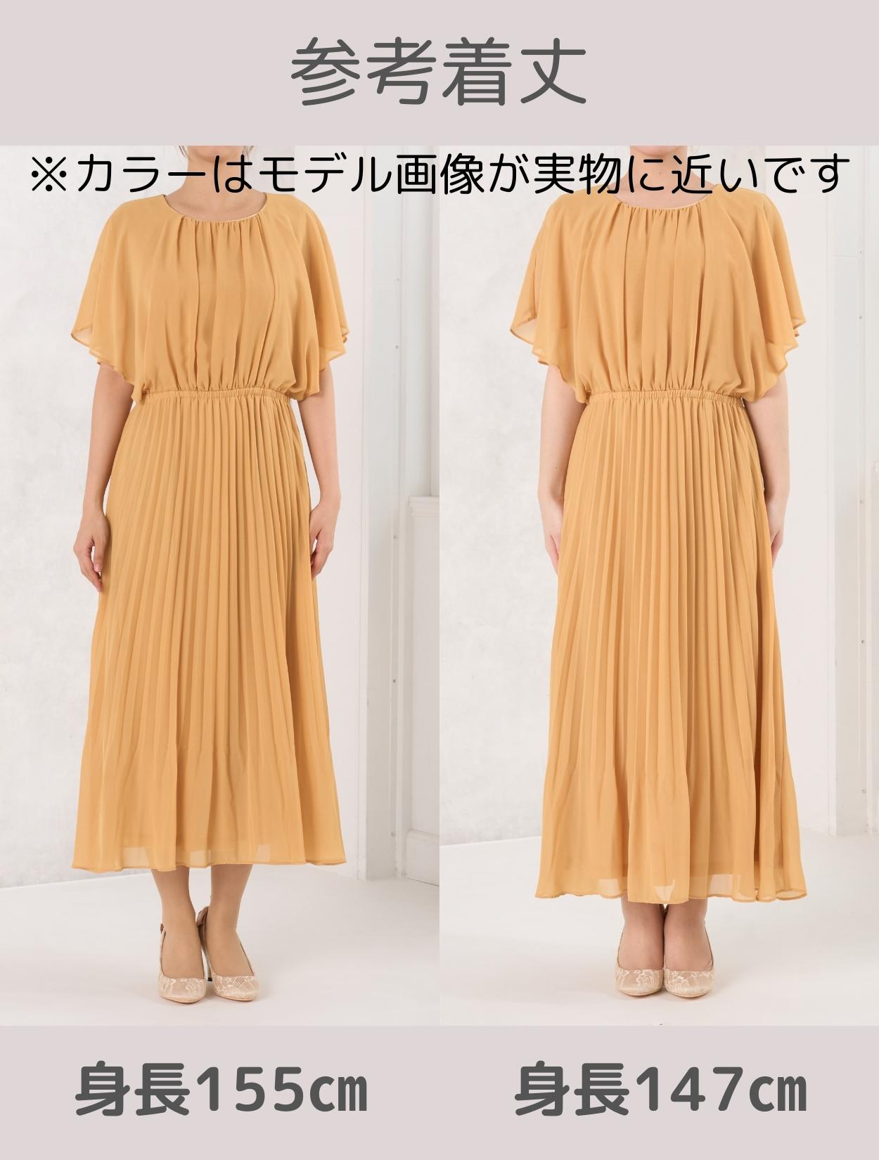 トレンドのプリーツスカートは、縦のラインを強調してくれるのでスタイルアップ効果もあります。裾に向けてプリーツがほどけていくデザインは、足元に軽さと動きを出してくれます。上半身はオーバーブラウス風のデザインでフワッとしていますが、ウエストはキュッと閉まっていますのでメリハリがあります。ブラウス風のトップスは、バストを目立たせたくない方にもおすすめです。袖ありドレスなので、結婚式でも一枚で着られます。ウエストゴム仕様は、長時間着ていても疲れずらく人気です。被りで着用するタイプなので、背中ファスナーが心配な方でも着脱が楽です。