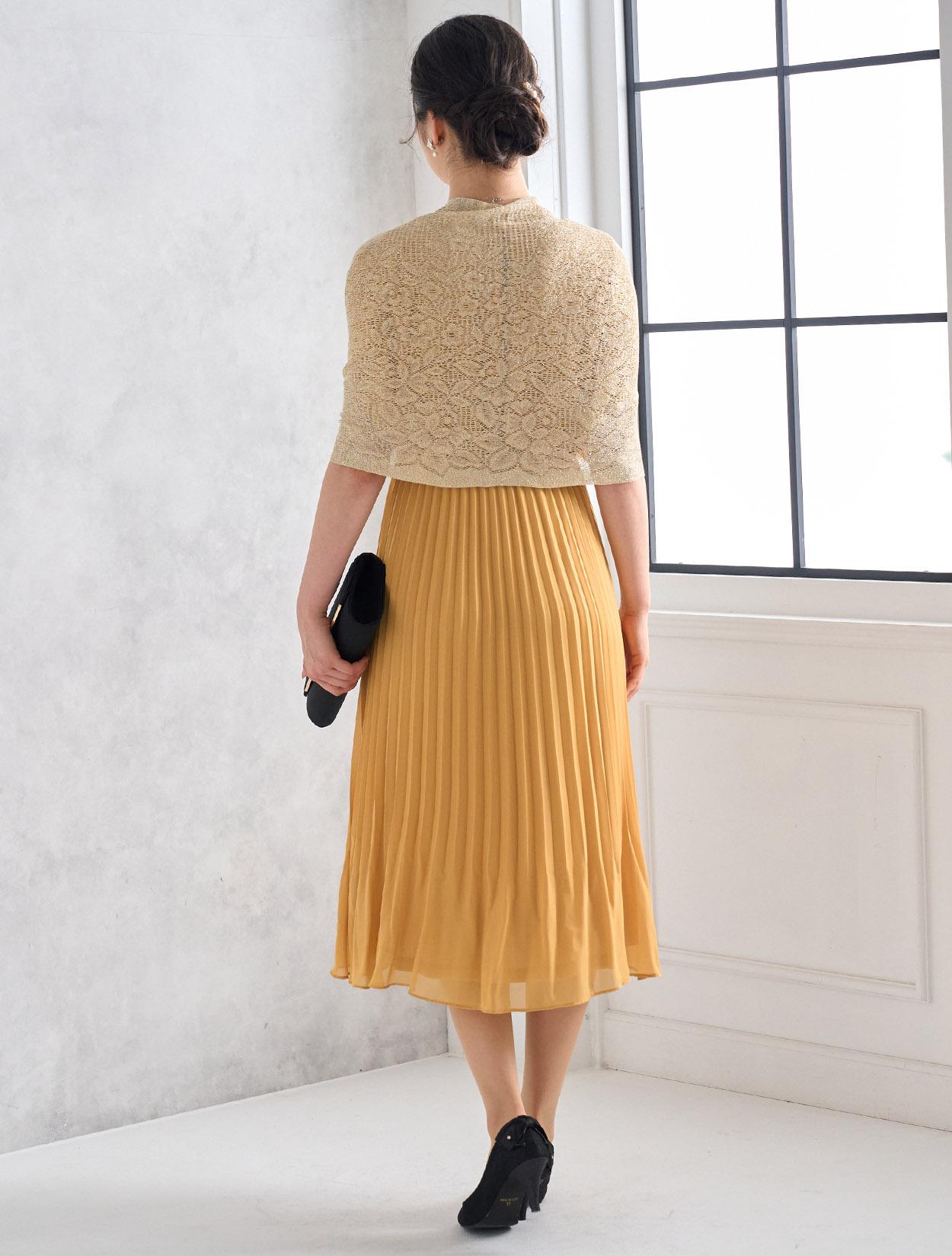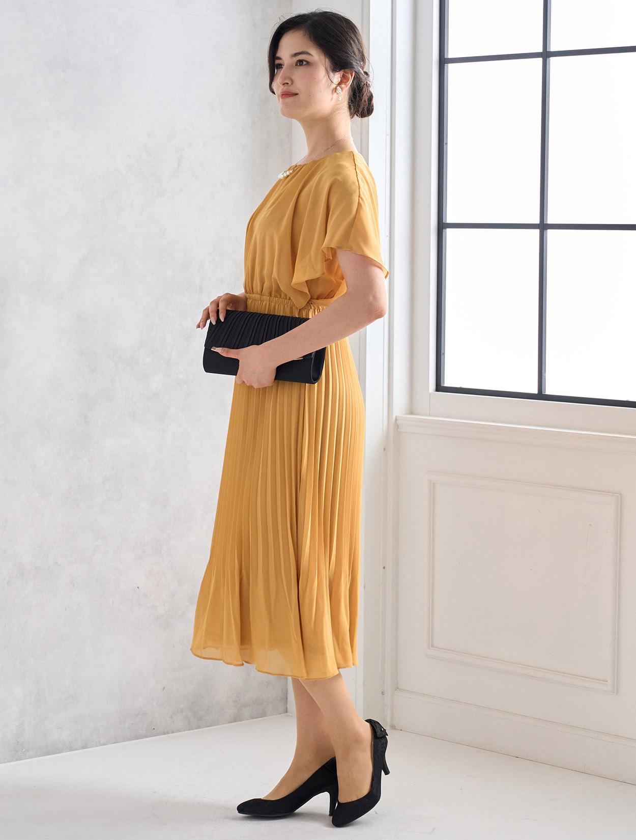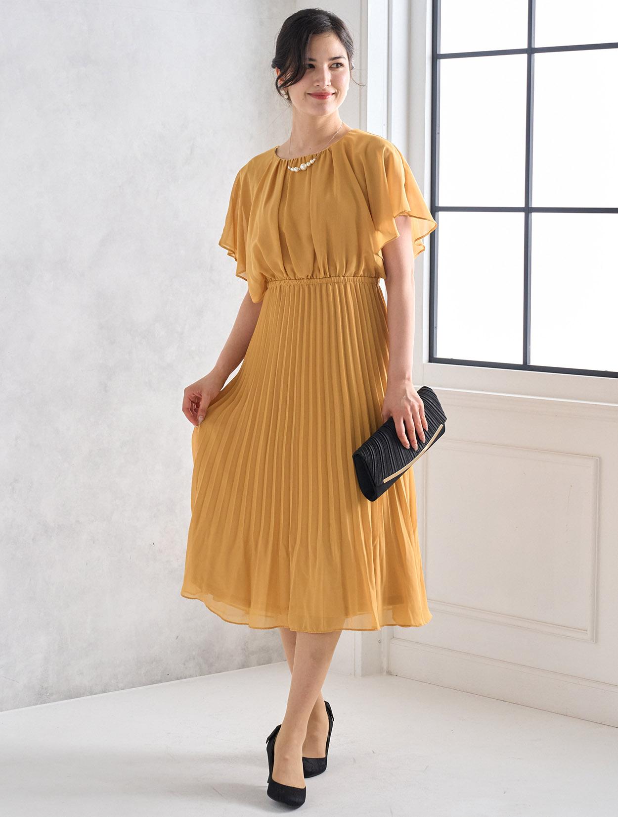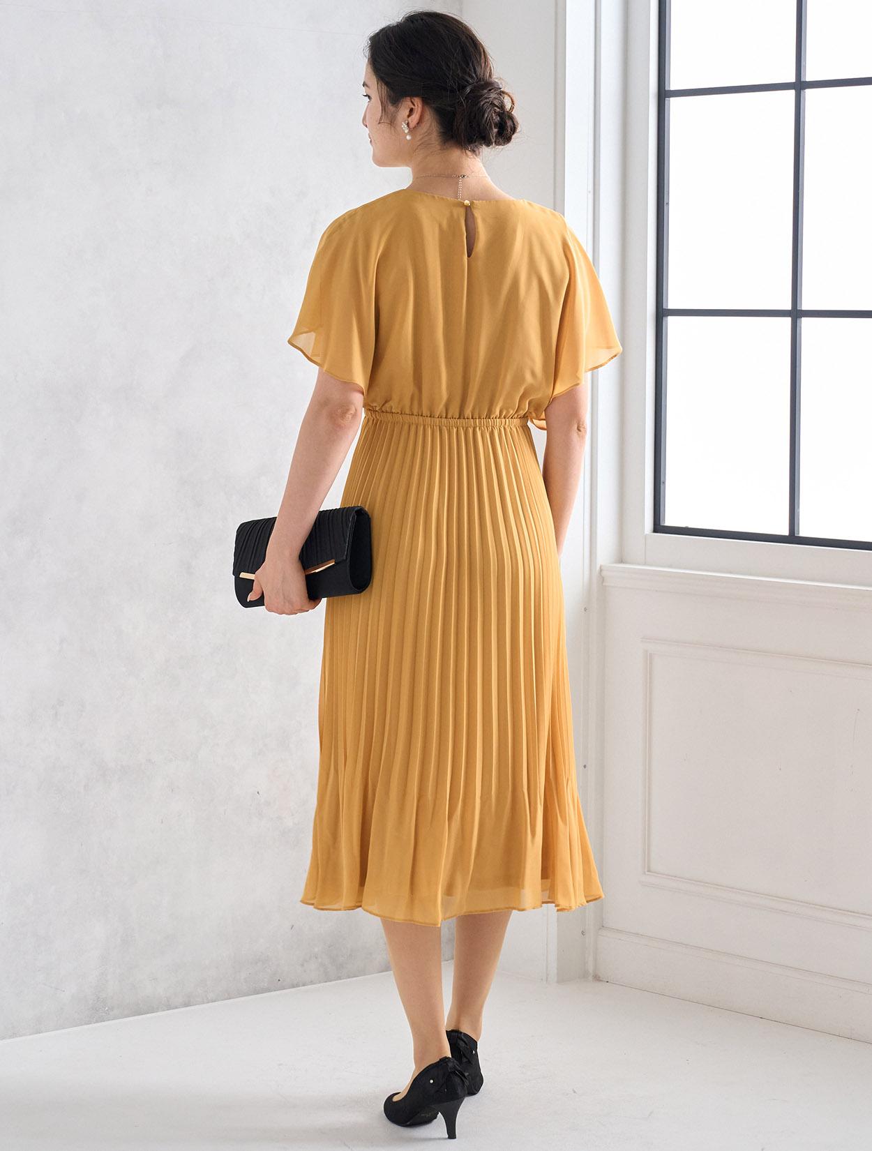 トレンドのプリーツスカートは、縦のラインを強調してくれるのでスタイルアップ効果もあります。裾に向けてプリーツがほどけていくデザインは、足元に軽さと動きを出してくれます。上半身はオーバーブラウス風のデザインでフワッとしていますが、ウエストはキュッと閉まっていますのでメリハリがあります。ブラウス風のトップスは、バストを目立たせたくない方にもおすすめです。袖ありドレスなので、結婚式でも一枚で着られます。ウエストゴム仕様は、長時間着ていても疲れずらく人気です。被りで着用するタイプなので、背中ファスナーが心配な方でも着脱が楽です。
