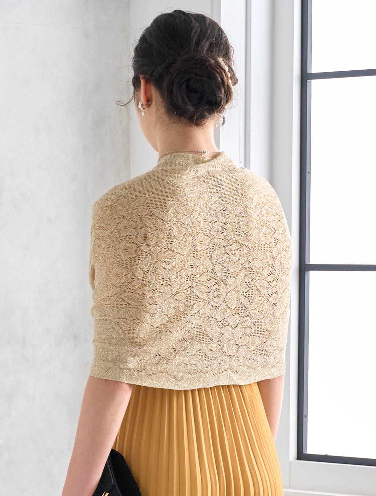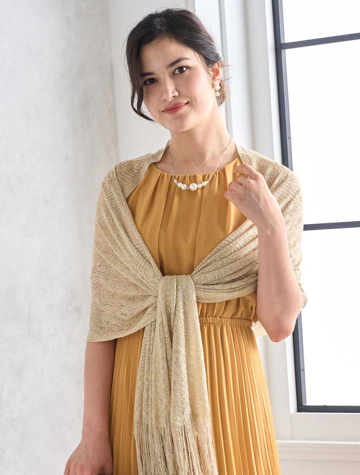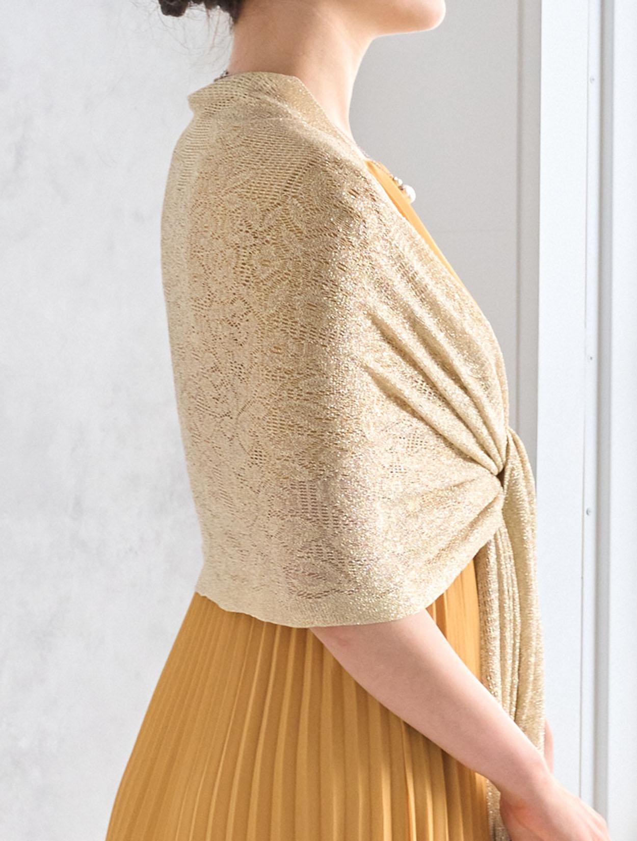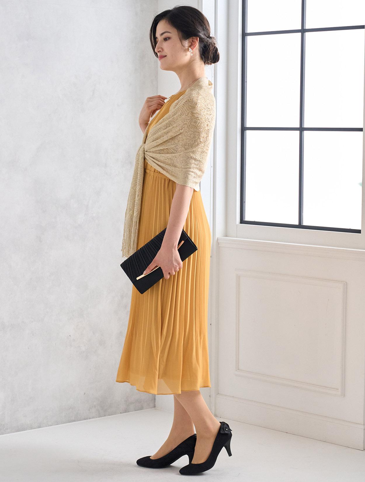 ゴールドのラメショールが華やかなパーティー感のあるコーディネート。ブラックの小物でメリハリを出した大人の甘辛コーデは、20代後半から30代に人気です。