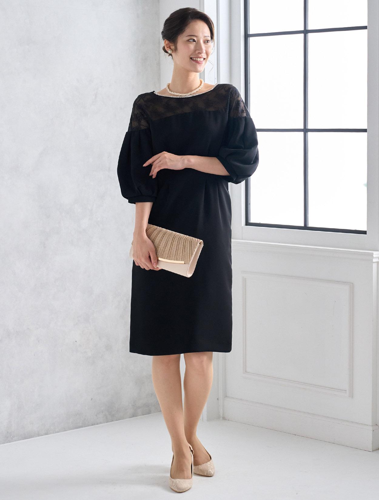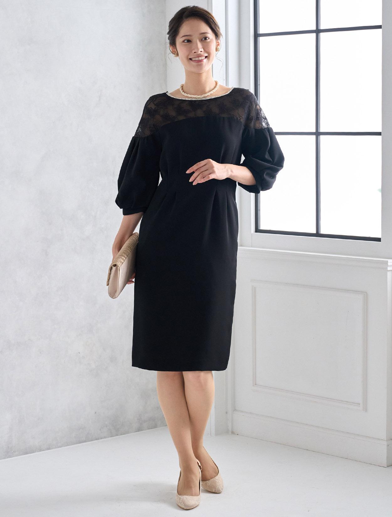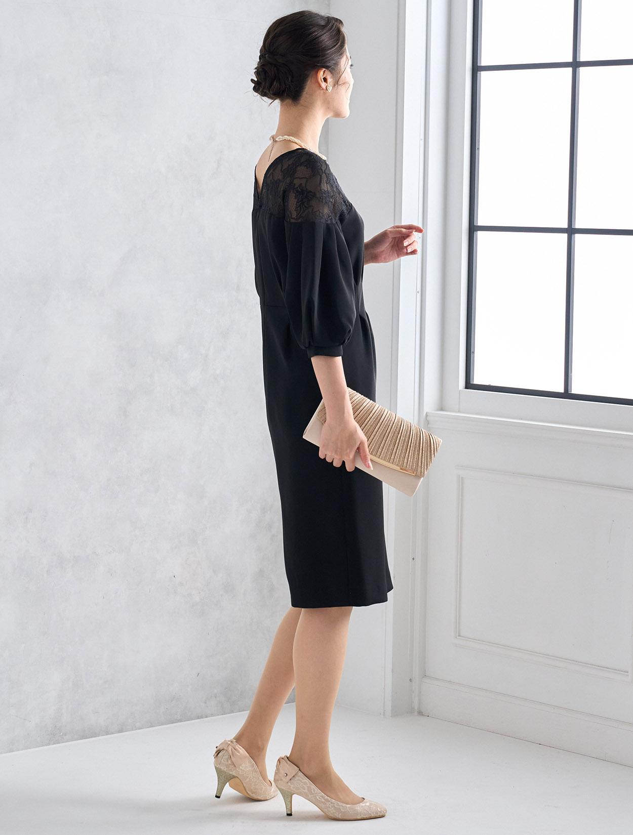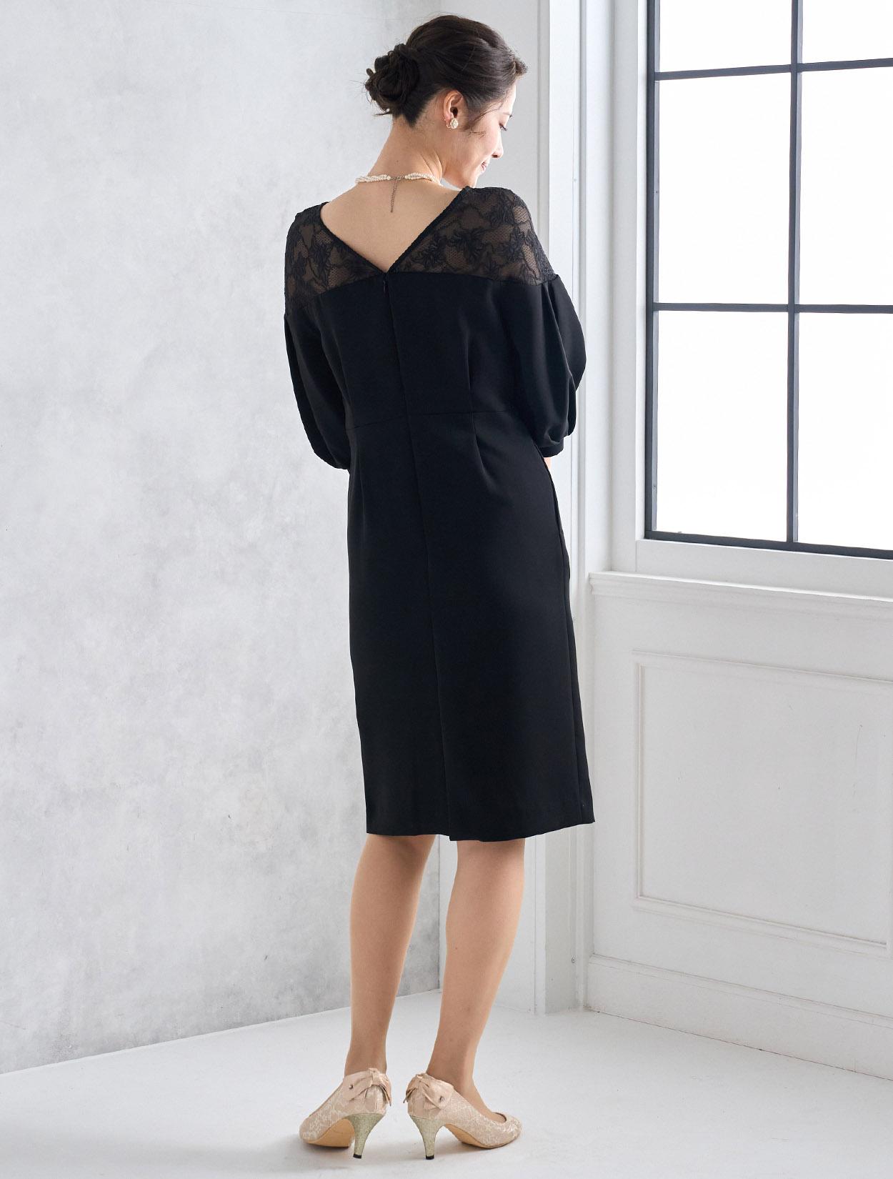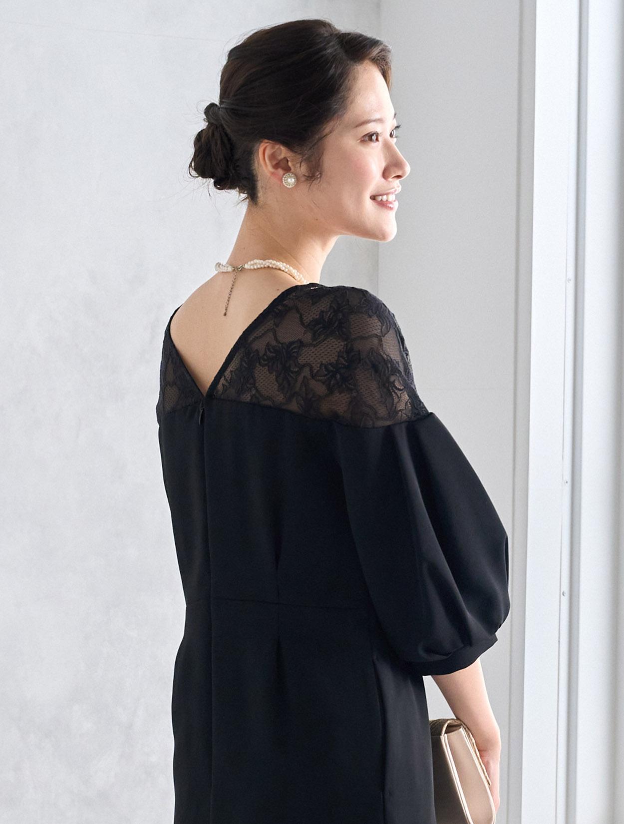 ハイウエストのラインにタックが入っていて脚長効果抜群。スカートは膝丈より少し長めの作りで、165㎝くらいの方までなら膝が隠れる程の丈になり、結婚式でも安心して着られます。しっかりと柄が見えるデコルテレースは、透け過ぎず上品です。ネックラインのビジューがブラックドレスにパーティー感をプラスしてくれます。全体的にタイトめのデザインですが、ふんわりとしたバルーンスリーブでメリハリあるシルエットを楽しめます。タイトなラインで伸縮はないので、全体的に3㎝程余裕があるサイズを選ぶと楽に着られます。背中はVラインのデザインで、後姿までおしゃれにきまります。