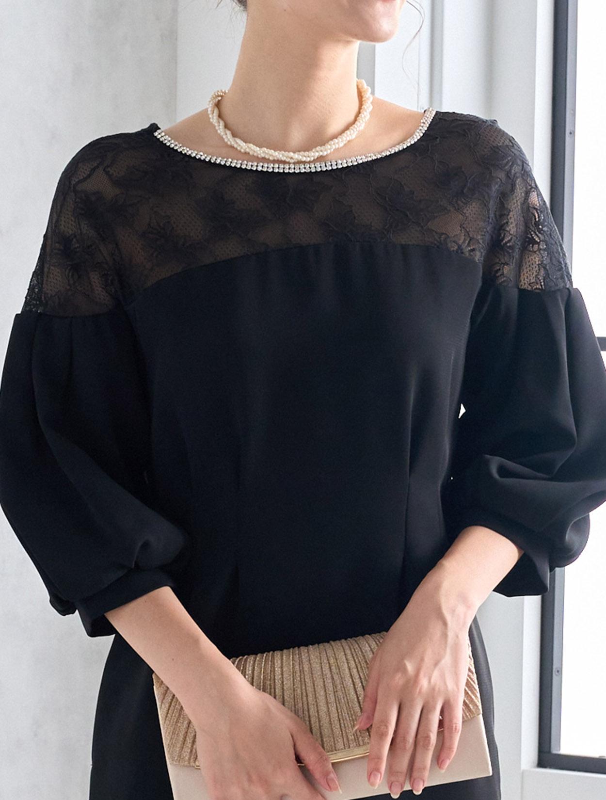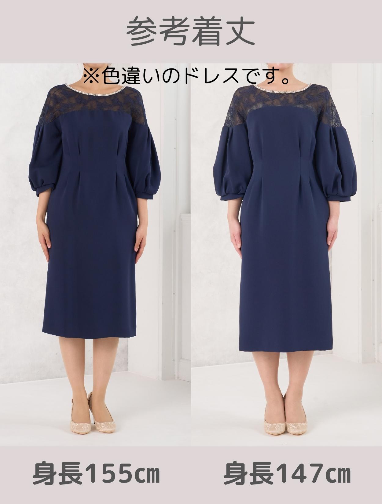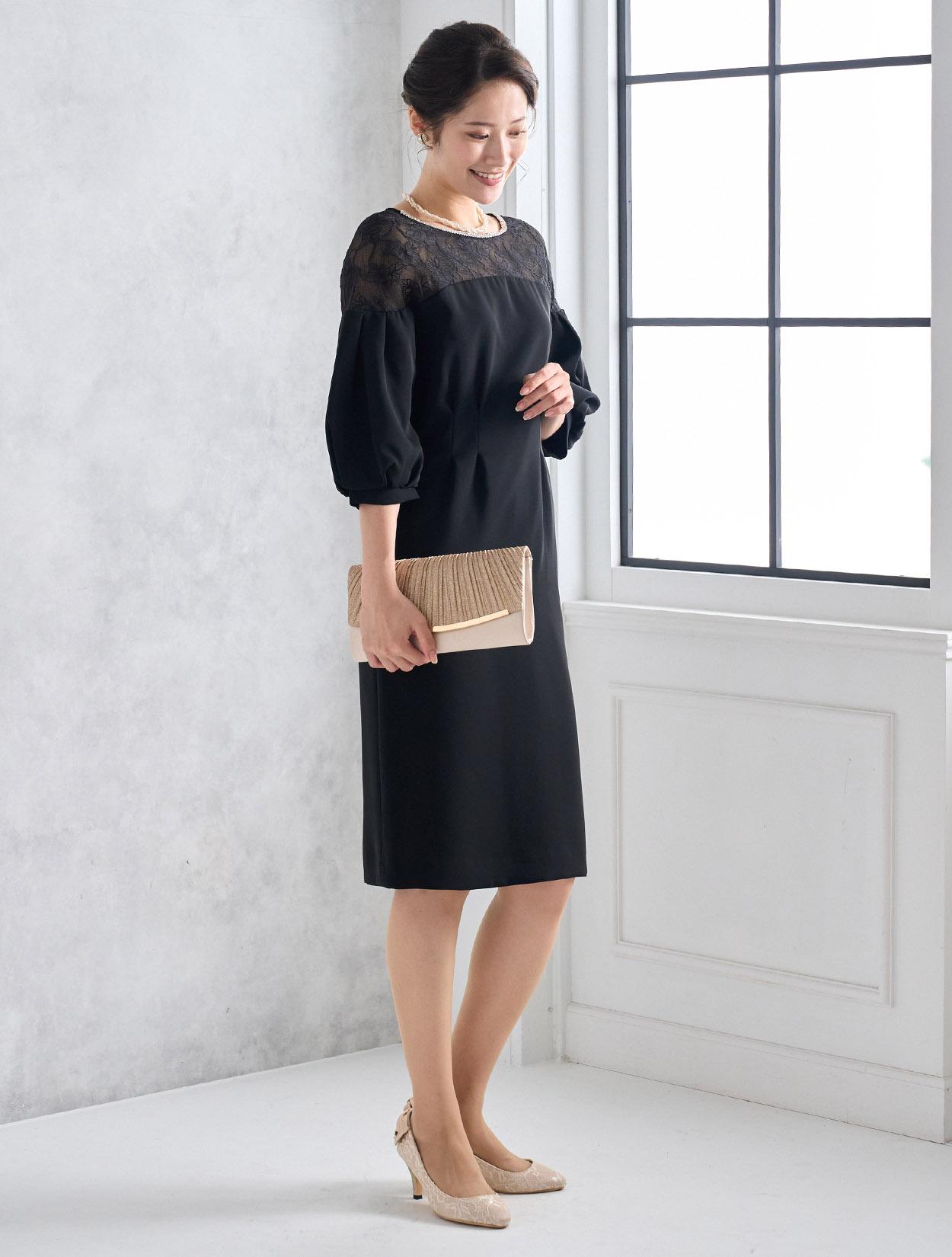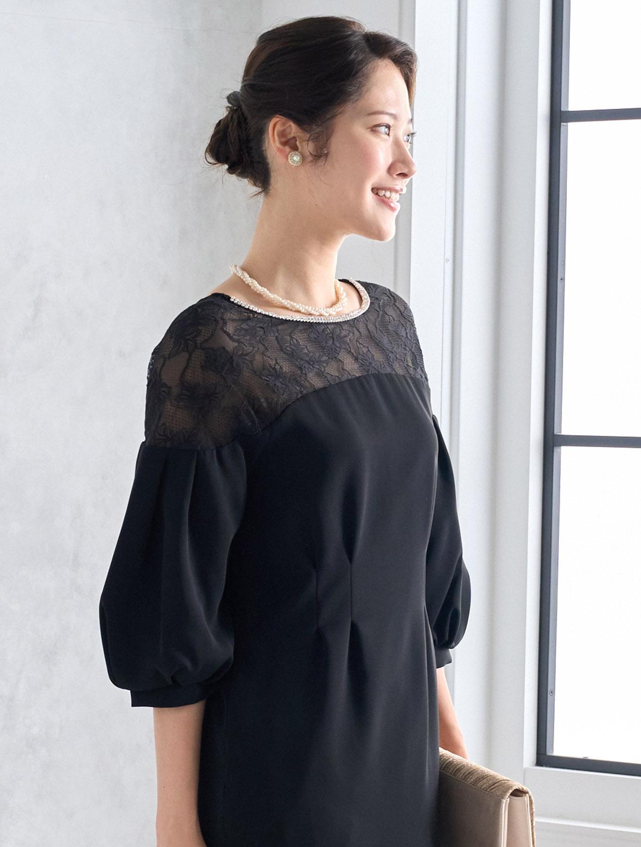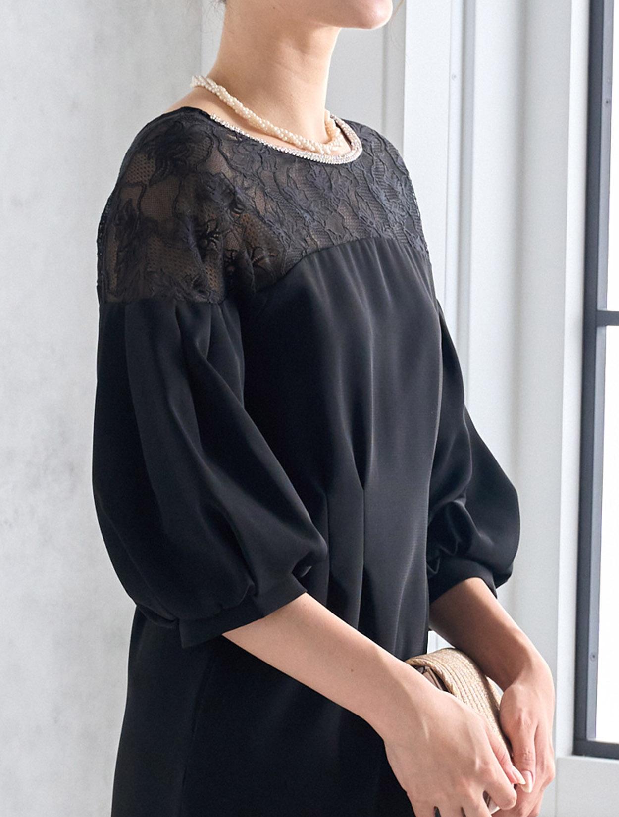 ハイウエストのラインにタックが入っていて脚長効果抜群。スカートは膝丈より少し長めの作りで、165㎝くらいの方までなら膝が隠れる程の丈になり、結婚式でも安心して着られます。しっかりと柄が見えるデコルテレースは、透け過ぎず上品です。ネックラインのビジューがブラックドレスにパーティー感をプラスしてくれます。全体的にタイトめのデザインですが、ふんわりとしたバルーンスリーブでメリハリあるシルエットを楽しめます。タイトなラインで伸縮はないので、全体的に3㎝程余裕があるサイズを選ぶと楽に着られます。背中はVラインのデザインで、後姿までおしゃれにきまります。