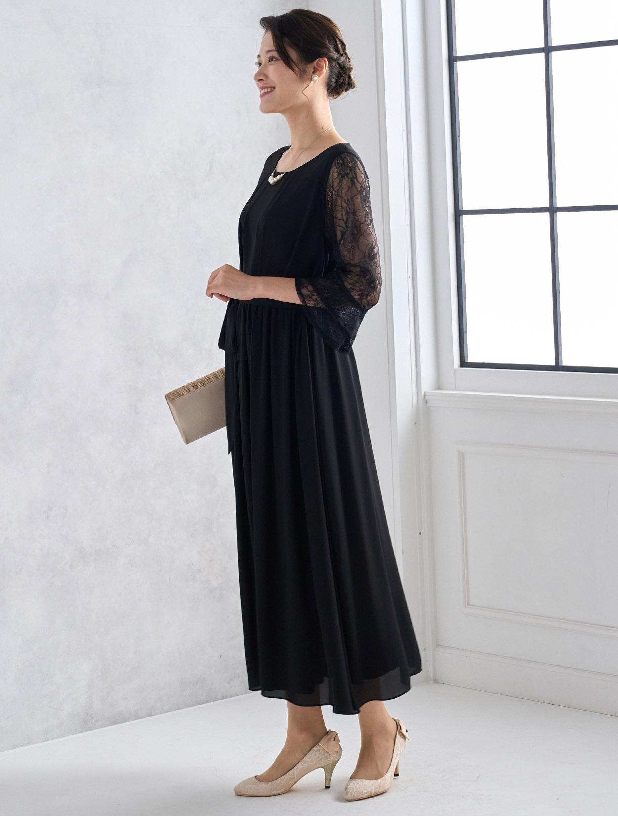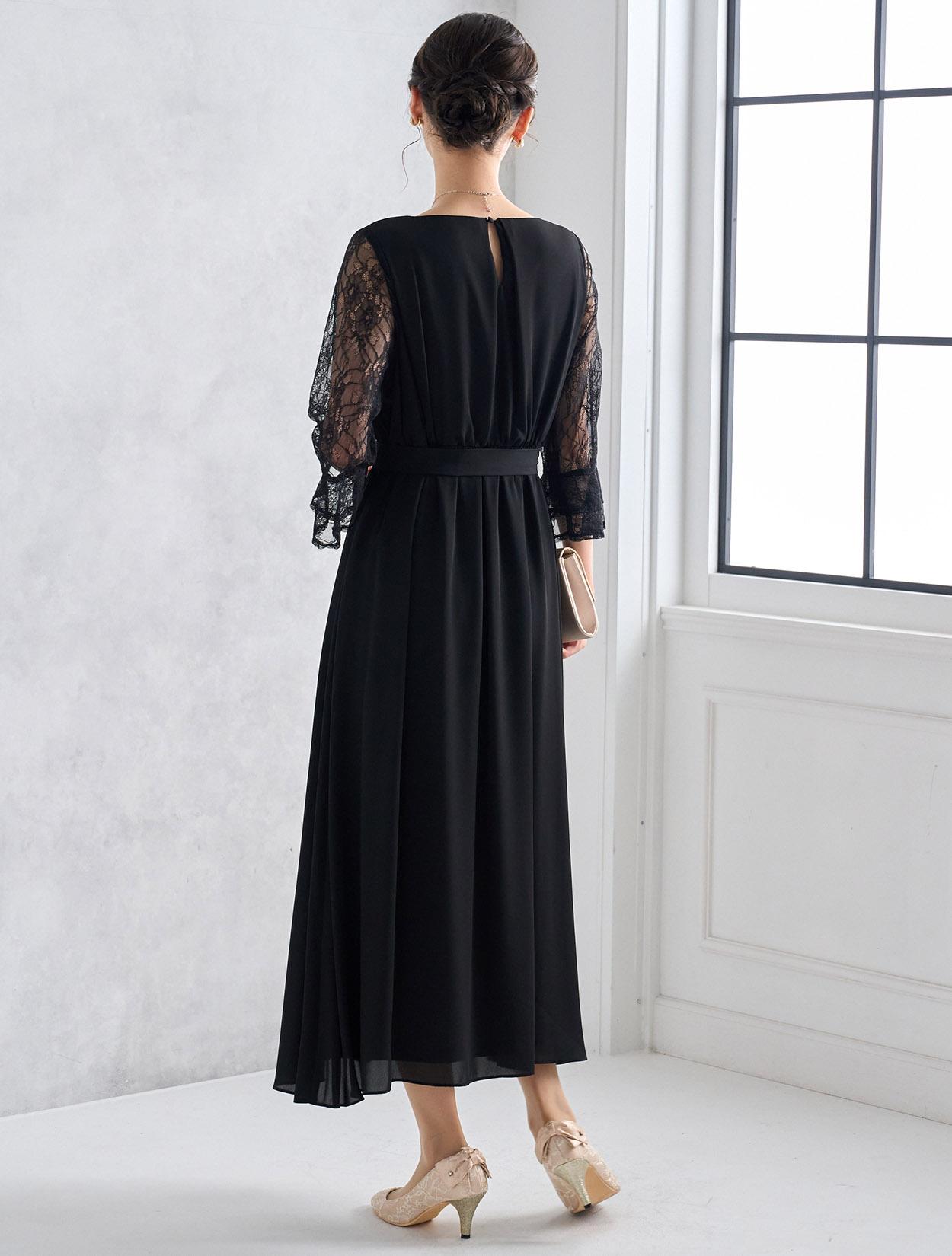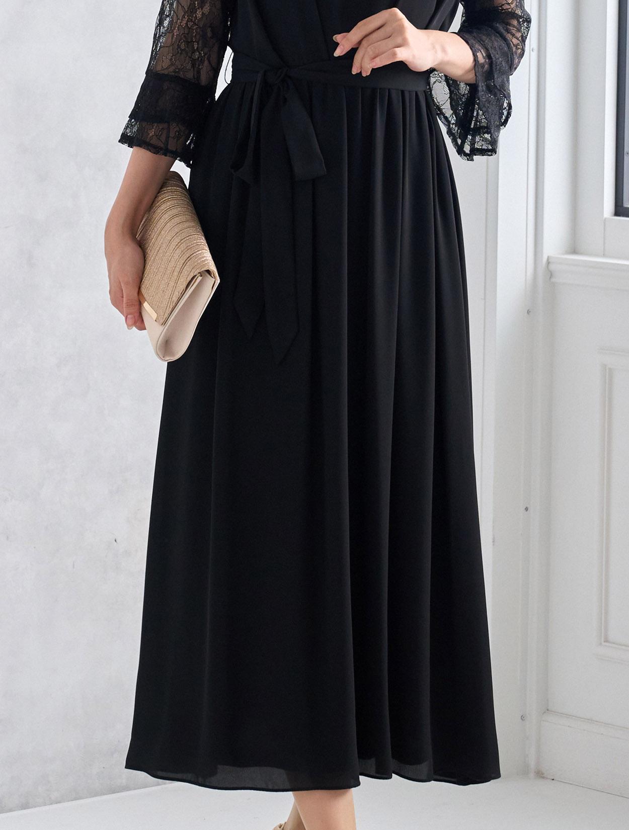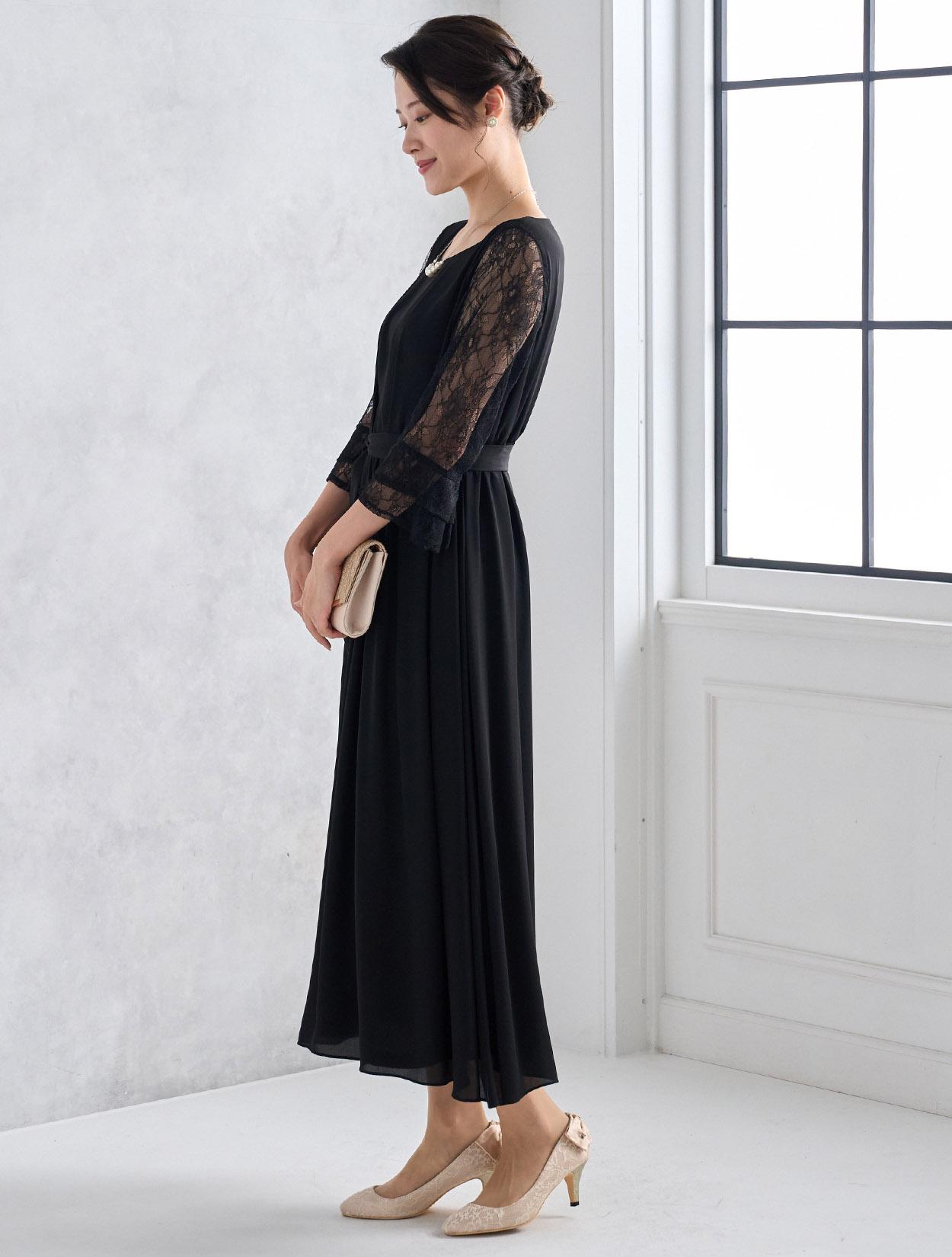 しっかりとスカート丈があるロングドレスなので、大人っぽくきちんと感がある印象がポイントです。ジョーゼット生地はブラックでも重た過ぎず、スカートのドレープが華やかさを出してくれるので、結婚式やパーティーでも地味になりすぎません。ウエストマークがあるので、ロングドレスでもメリハリがあるシルエットで着こなせます。ウエストのリボンは、左右どちらかのサイドに寄せて結ぶと大人っぽくスッキリ見えます。お袖は上品な柄のレースで、袖口のベルスリーブデザインが美しく、ドレス全体のアクセントになっています。ウエストは背中部分がゴム仕様なので、楽に着られますが正面からはスッキリしたラインに見えます。被りタイプで着るドレスなので、背中ファスナーが心配な方でも安心して着用できます。