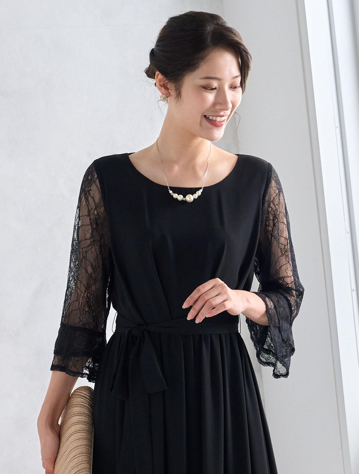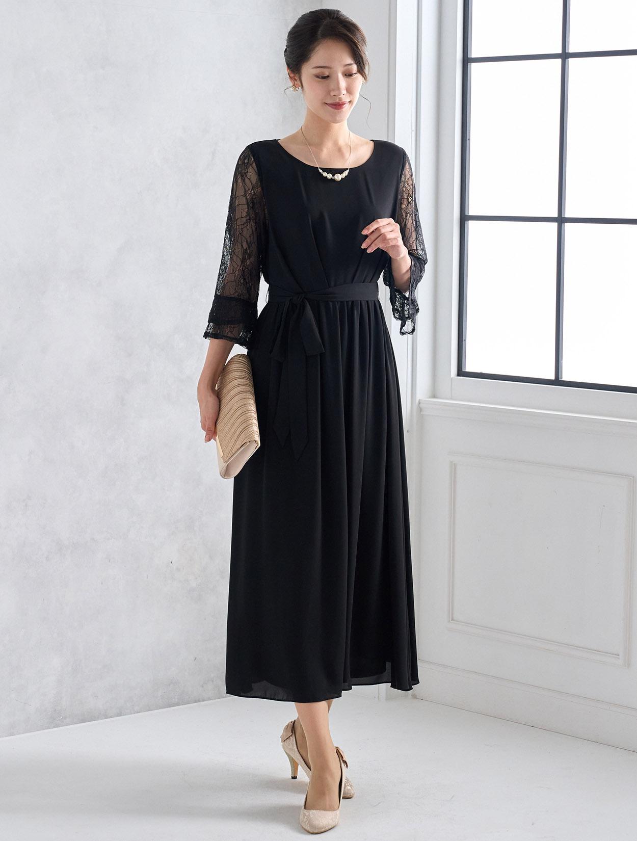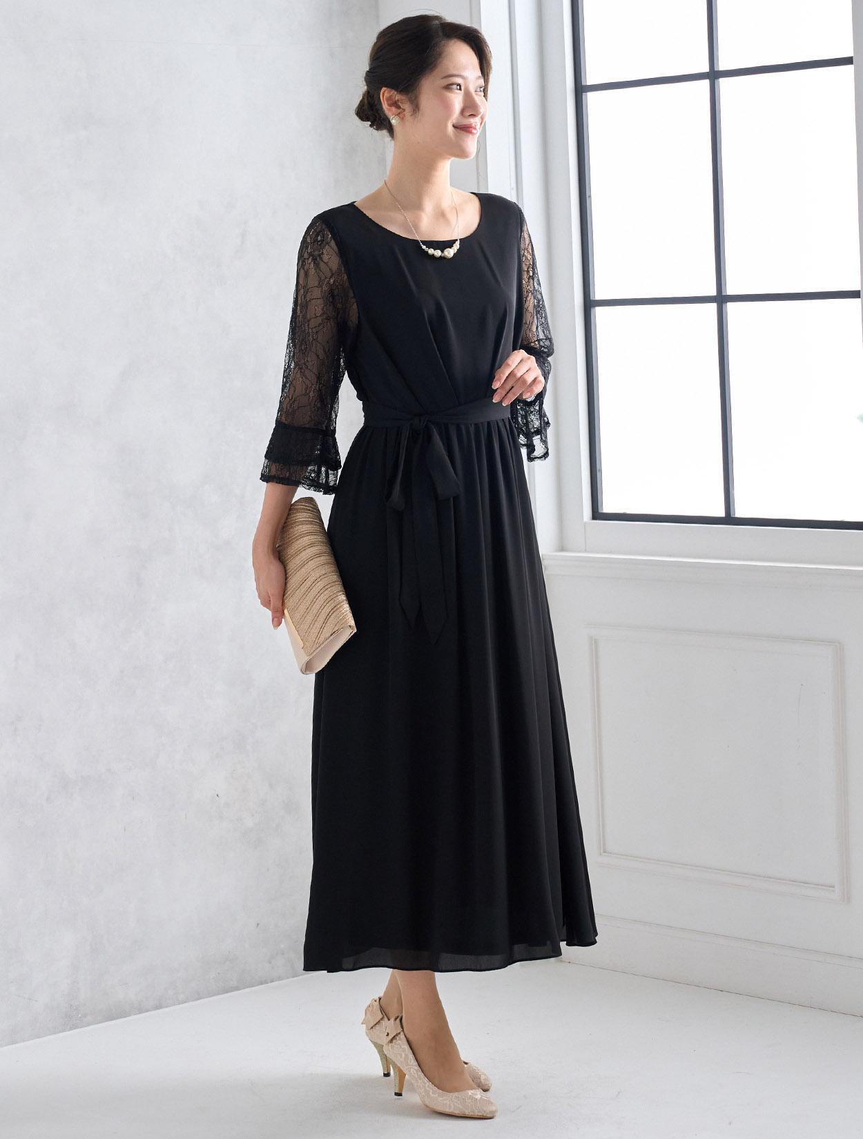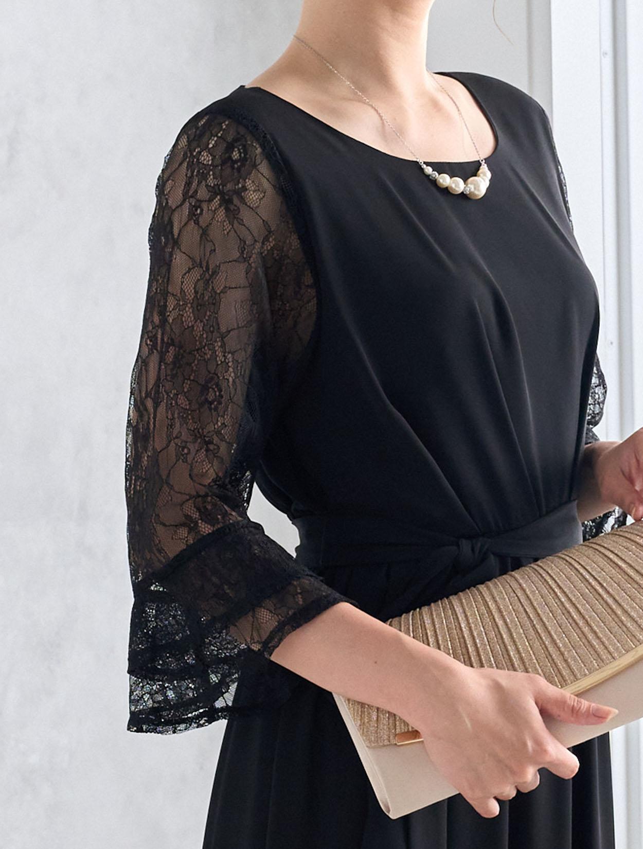 しっかりとスカート丈があるロングドレスなので、大人っぽくきちんと感がある印象がポイントです。ジョーゼット生地はブラックでも重た過ぎず、スカートのドレープが華やかさを出してくれるので、結婚式やパーティーでも地味になりすぎません。ウエストマークがあるので、ロングドレスでもメリハリがあるシルエットで着こなせます。ウエストのリボンは、左右どちらかのサイドに寄せて結ぶと大人っぽくスッキリ見えます。お袖は上品な柄のレースで、袖口のベルスリーブデザインが美しく、ドレス全体のアクセントになっています。ウエストは背中部分がゴム仕様なので、楽に着られますが正面からはスッキリしたラインに見えます。被りタイプで着るドレスなので、背中ファスナーが心配な方でも安心して着用できます。