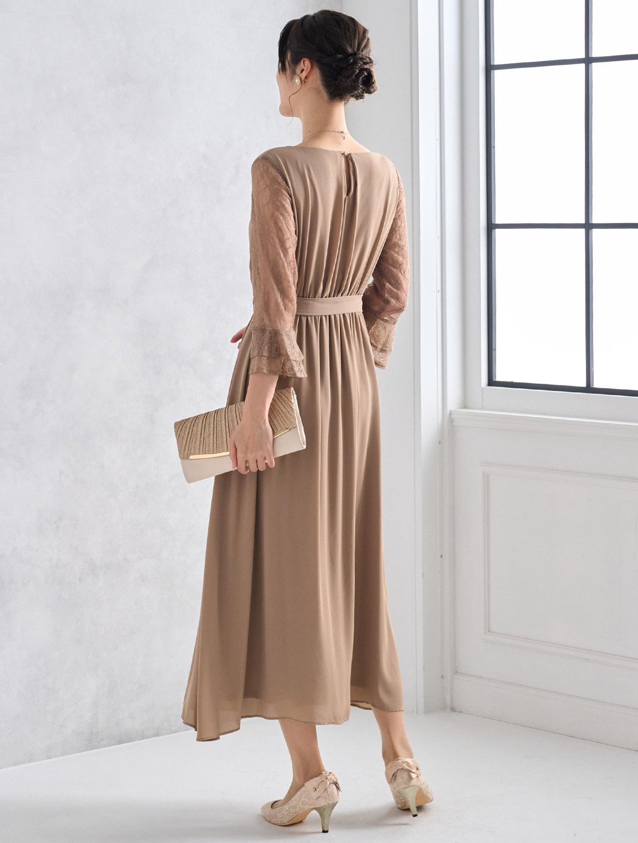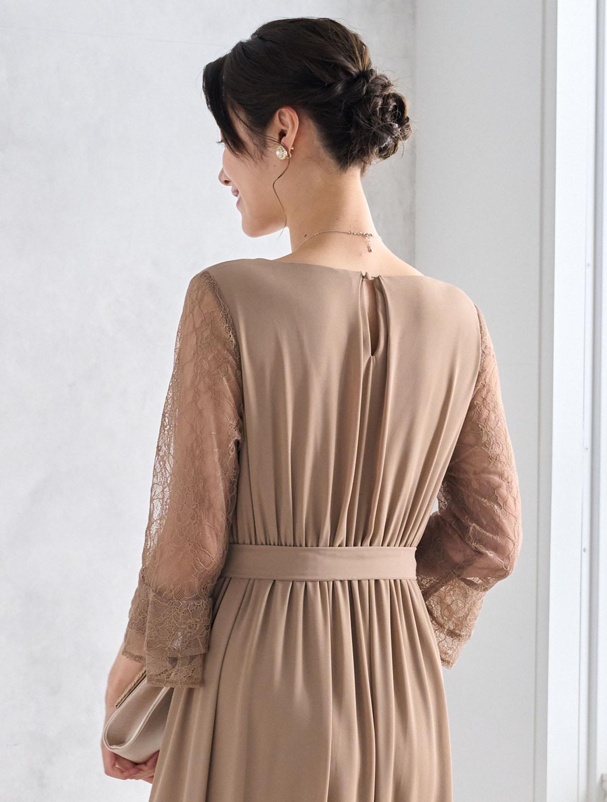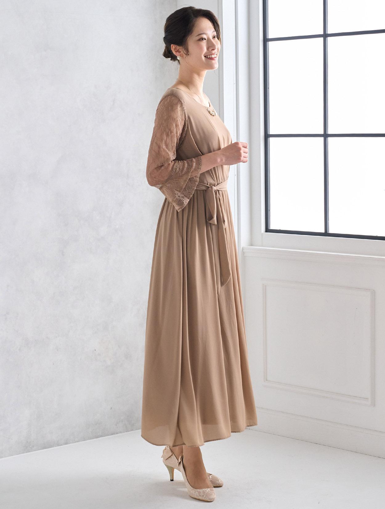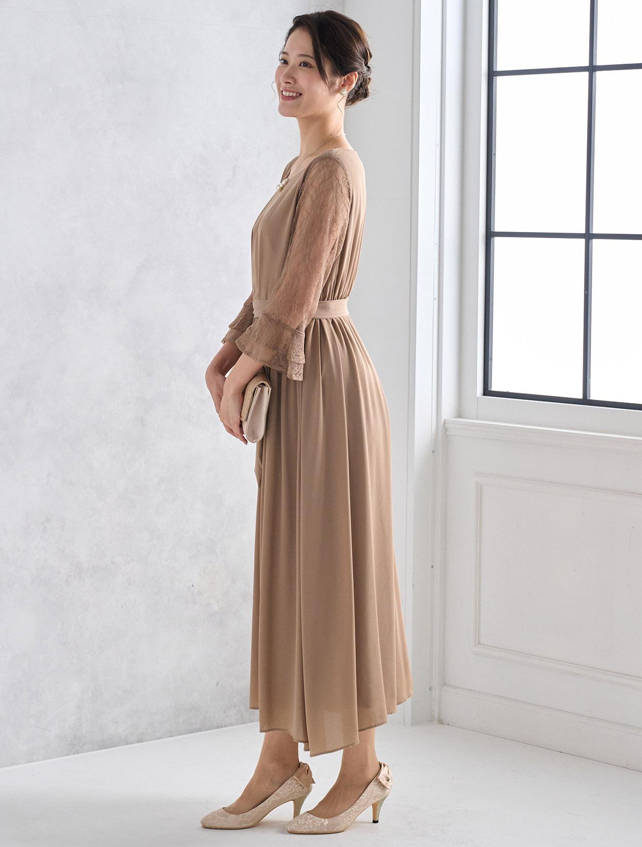 しっかりとスカート丈があるロングドレスなので、大人っぽくきちんと感がある印象がポイントです。ジョーゼット生地はロング丈でも重た過ぎず、スカートのドレープが華やかさを出してくれるので、結婚式やパーティーにぴったりです。ウエストマークがあるので、肌に馴染むベージュのロングドレスでもメリハリがあるシルエットで着こなせます。ウエストのリボンは、左右どちらかのサイドに寄せて結ぶと大人っぽくスッキリ見えます。お袖は上品な柄のレースで、袖口のベルスリーブデザインが美しく、ドレス全体のアクセントになっています。ウエストは背中部分がゴム仕様なので、楽に着られますが正面からはスッキリしたラインに見えます。被りタイプで着るドレスなので、背中ファスナーが心配な方でも安心して着用できます。