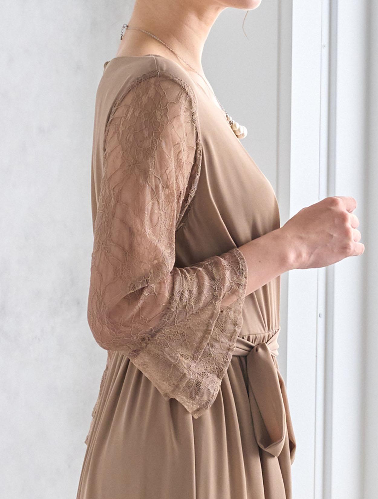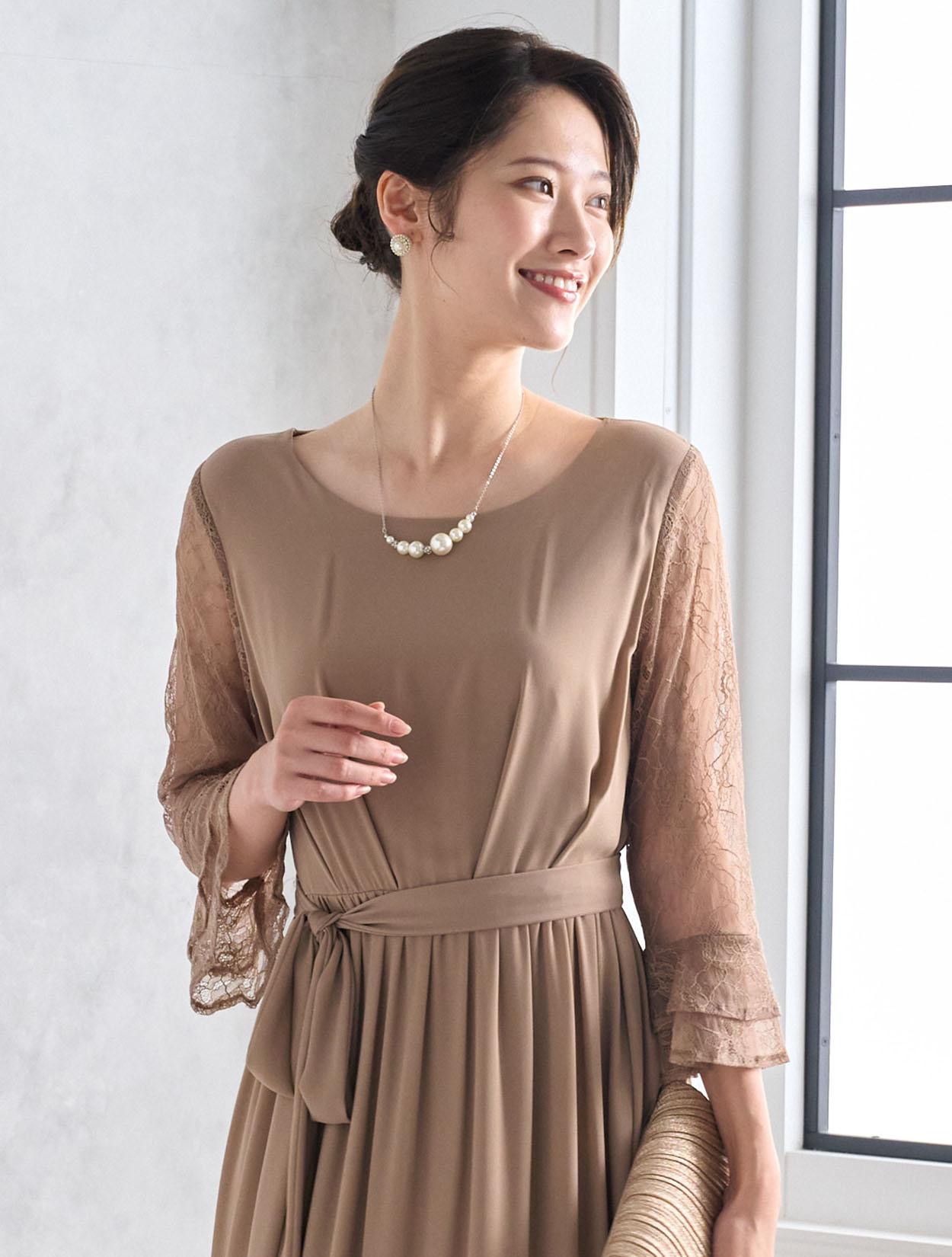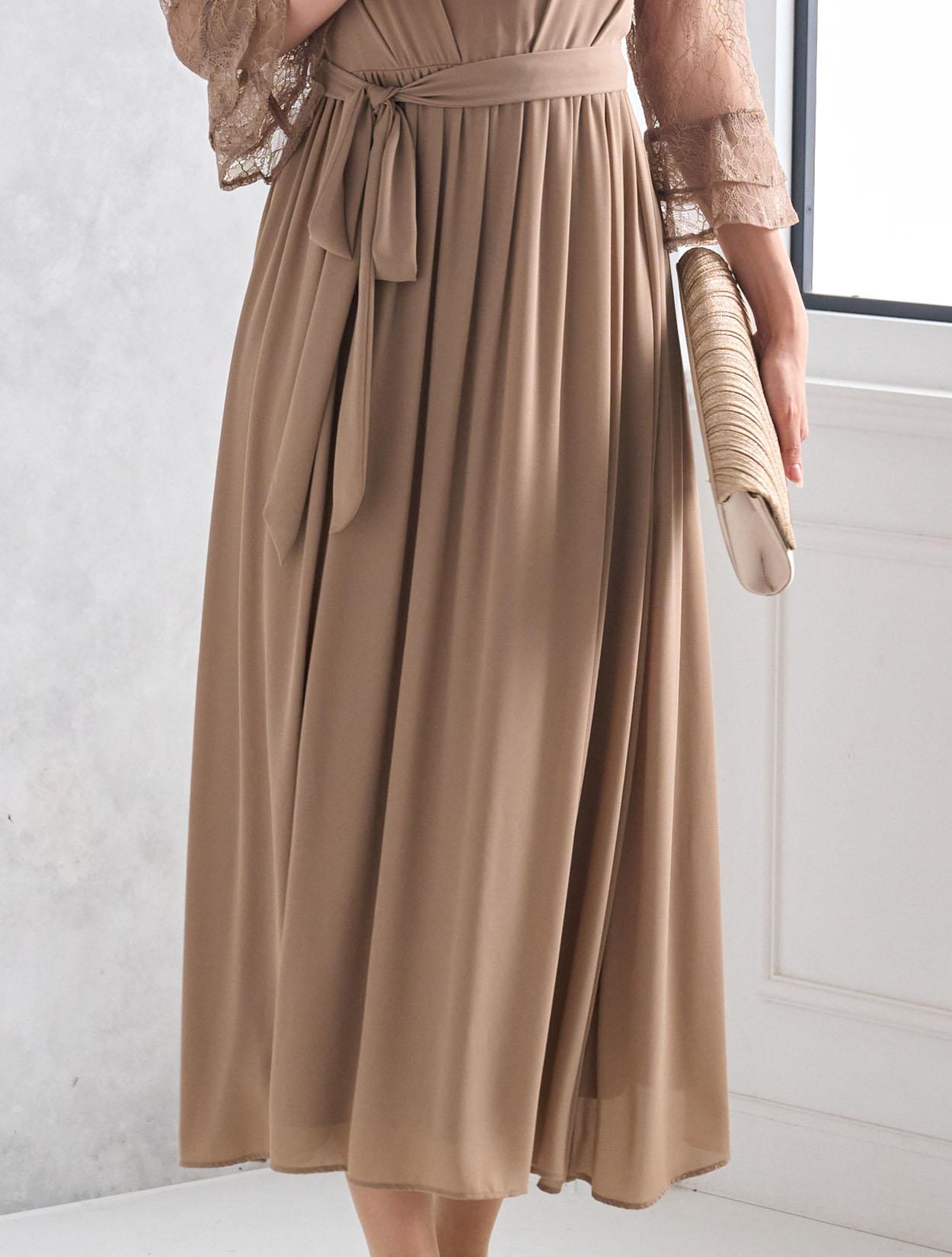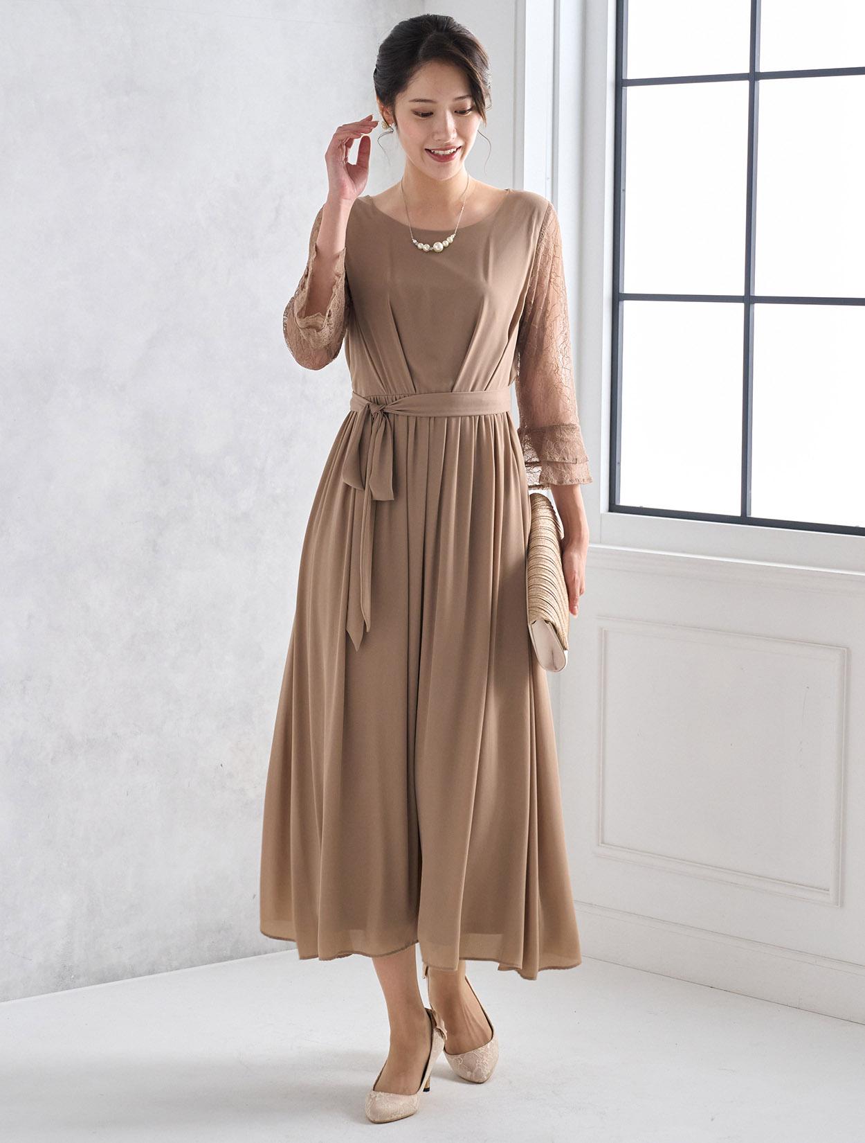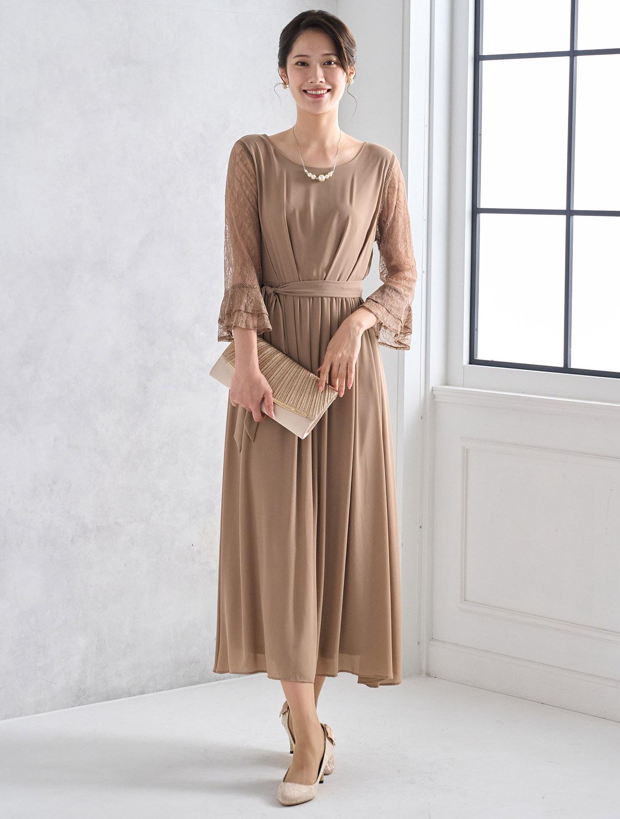 しっかりとスカート丈があるロングドレスなので、大人っぽくきちんと感がある印象がポイントです。ジョーゼット生地はロング丈でも重た過ぎず、スカートのドレープが華やかさを出してくれるので、結婚式やパーティーにぴったりです。ウエストマークがあるので、肌に馴染むベージュのロングドレスでもメリハリがあるシルエットで着こなせます。ウエストのリボンは、左右どちらかのサイドに寄せて結ぶと大人っぽくスッキリ見えます。お袖は上品な柄のレースで、袖口のベルスリーブデザインが美しく、ドレス全体のアクセントになっています。ウエストは背中部分がゴム仕様なので、楽に着られますが正面からはスッキリしたラインに見えます。被りタイプで着るドレスなので、背中ファスナーが心配な方でも安心して着用できます。