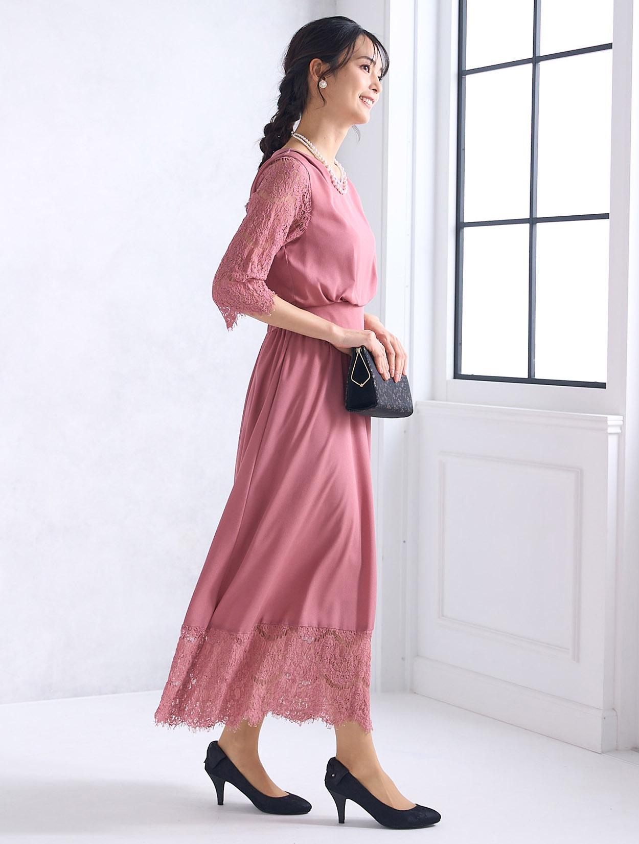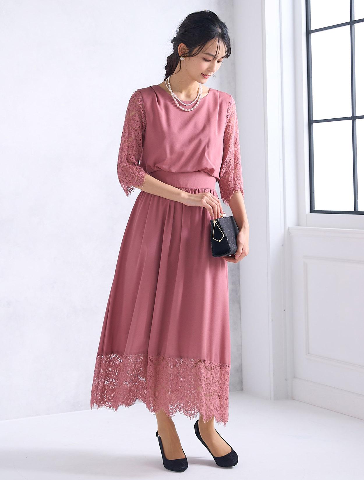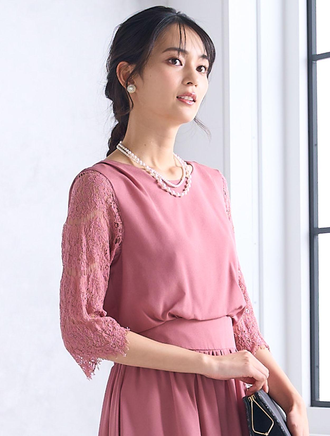 清楚で可憐なピンクカラーのドレス。幸せムードたっぷりなピンクは、結婚式や華やかなパーティーの席にぴったり。原色のピンクではなく、程よいくすみがあって着こなしやすい色味です。お顔の血色アップし美肌に見せる効果もあります。