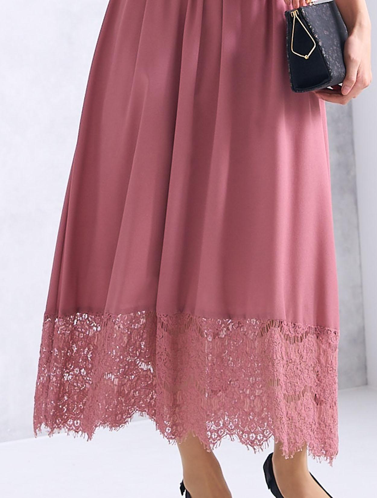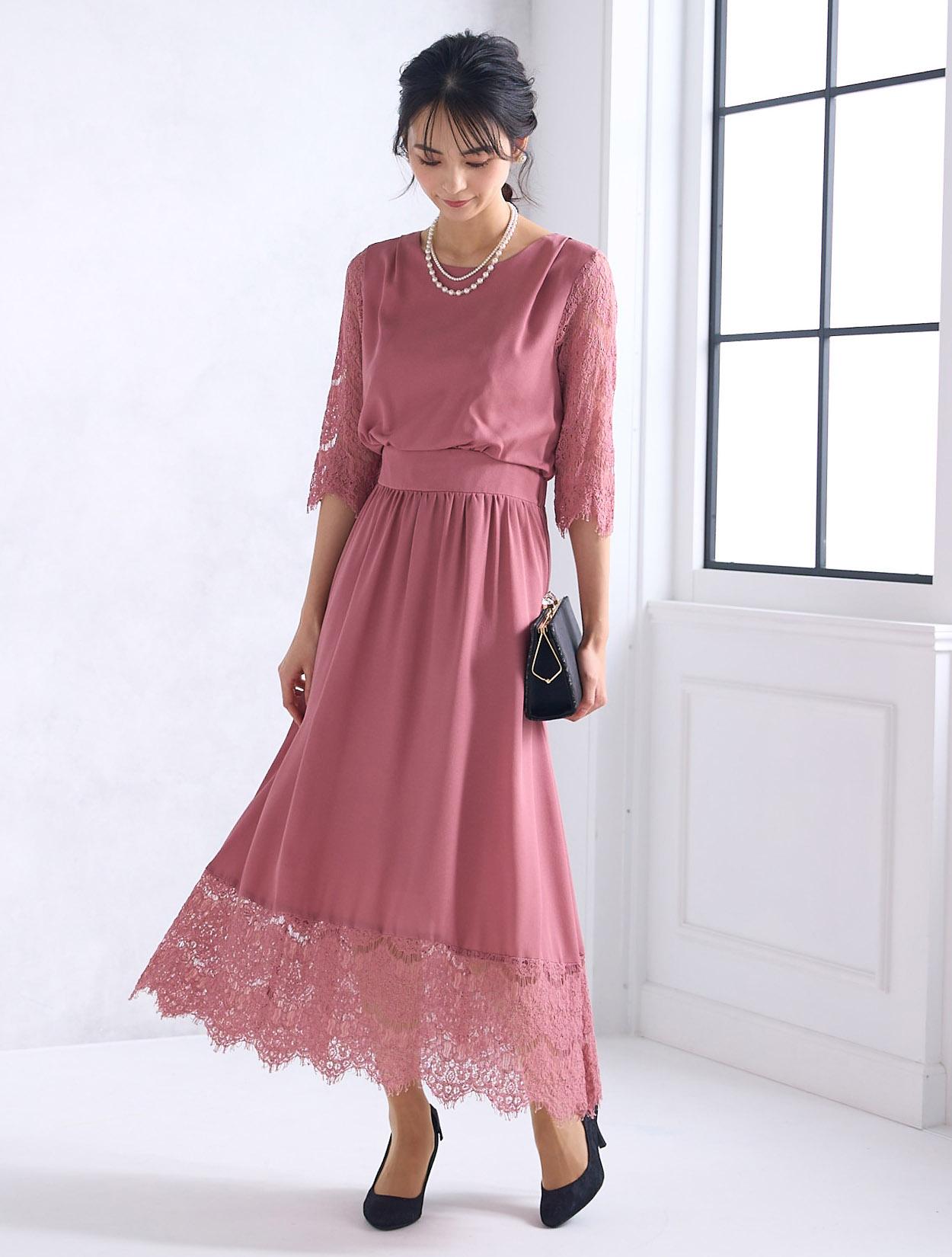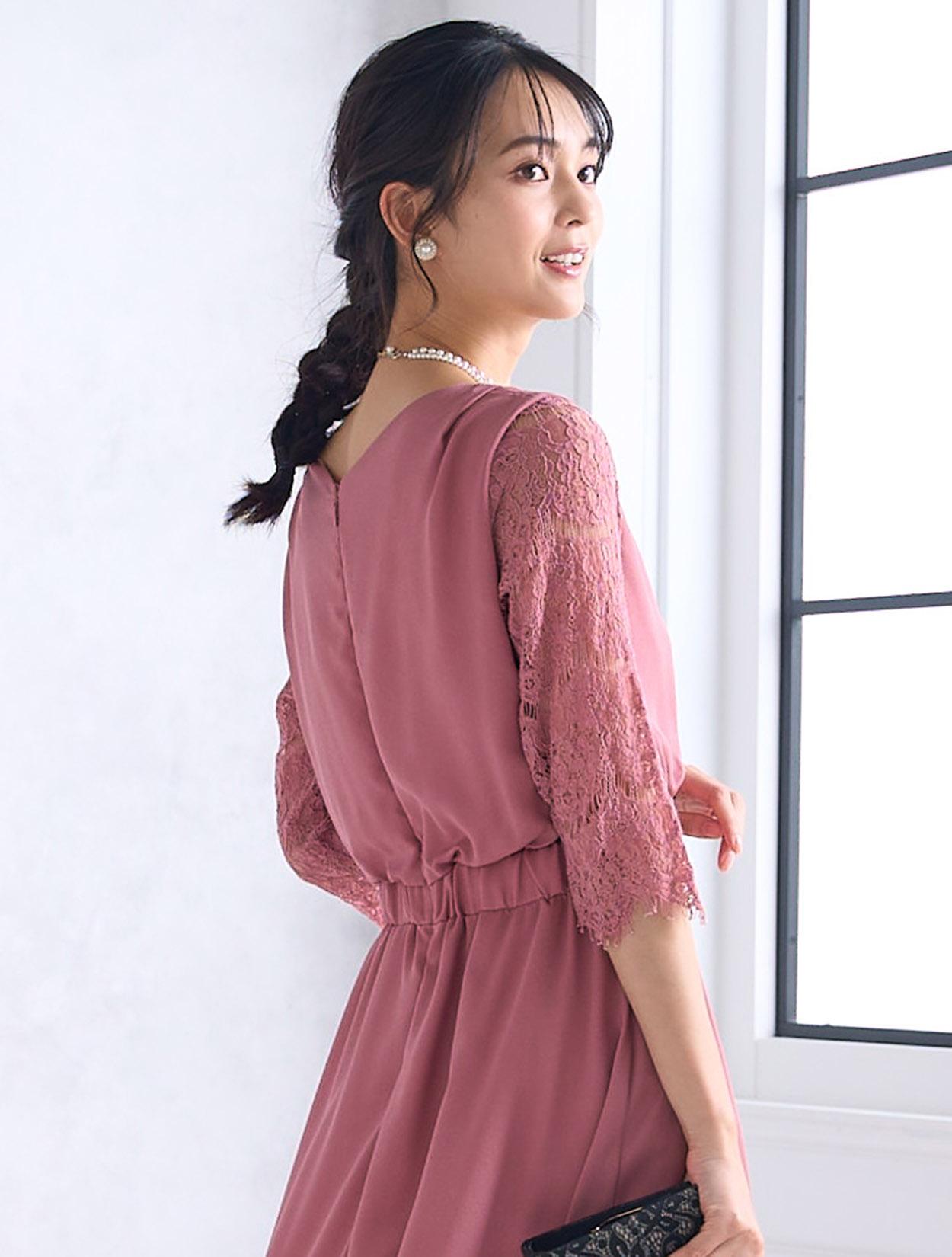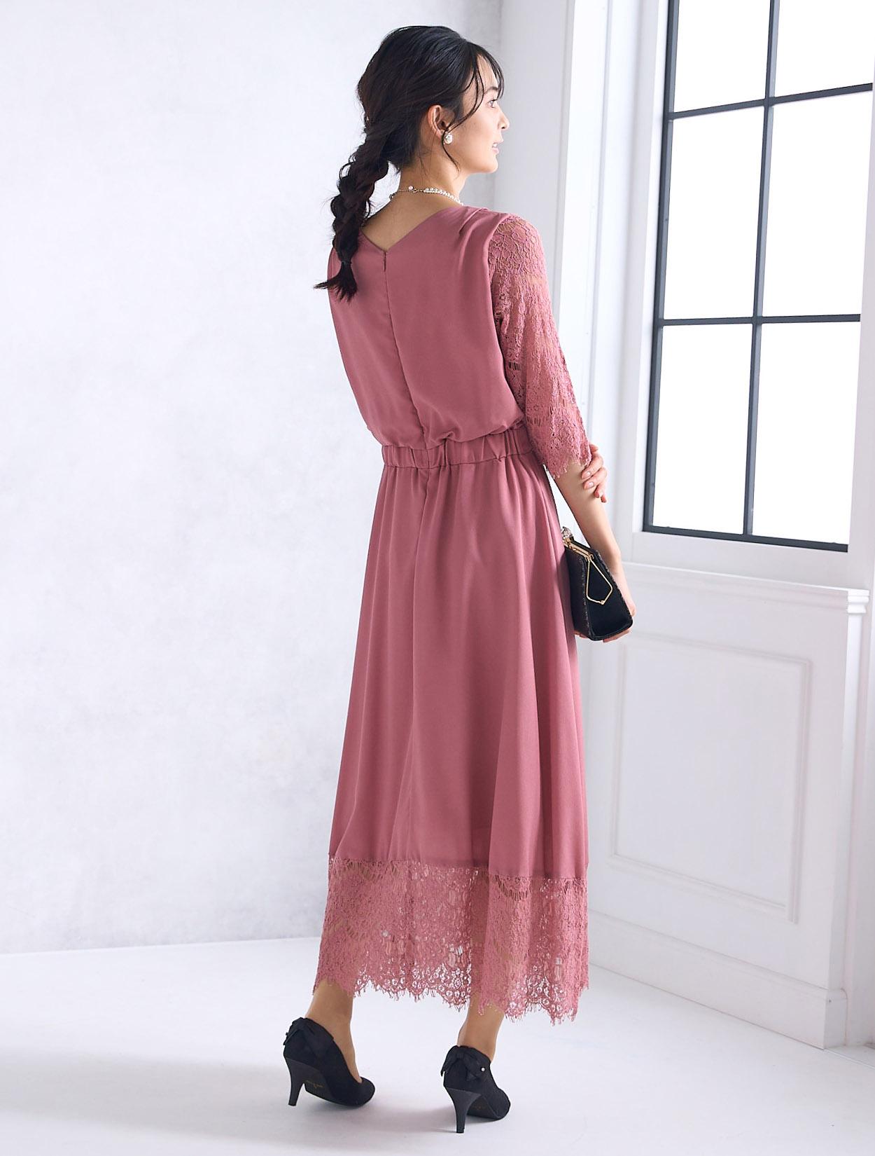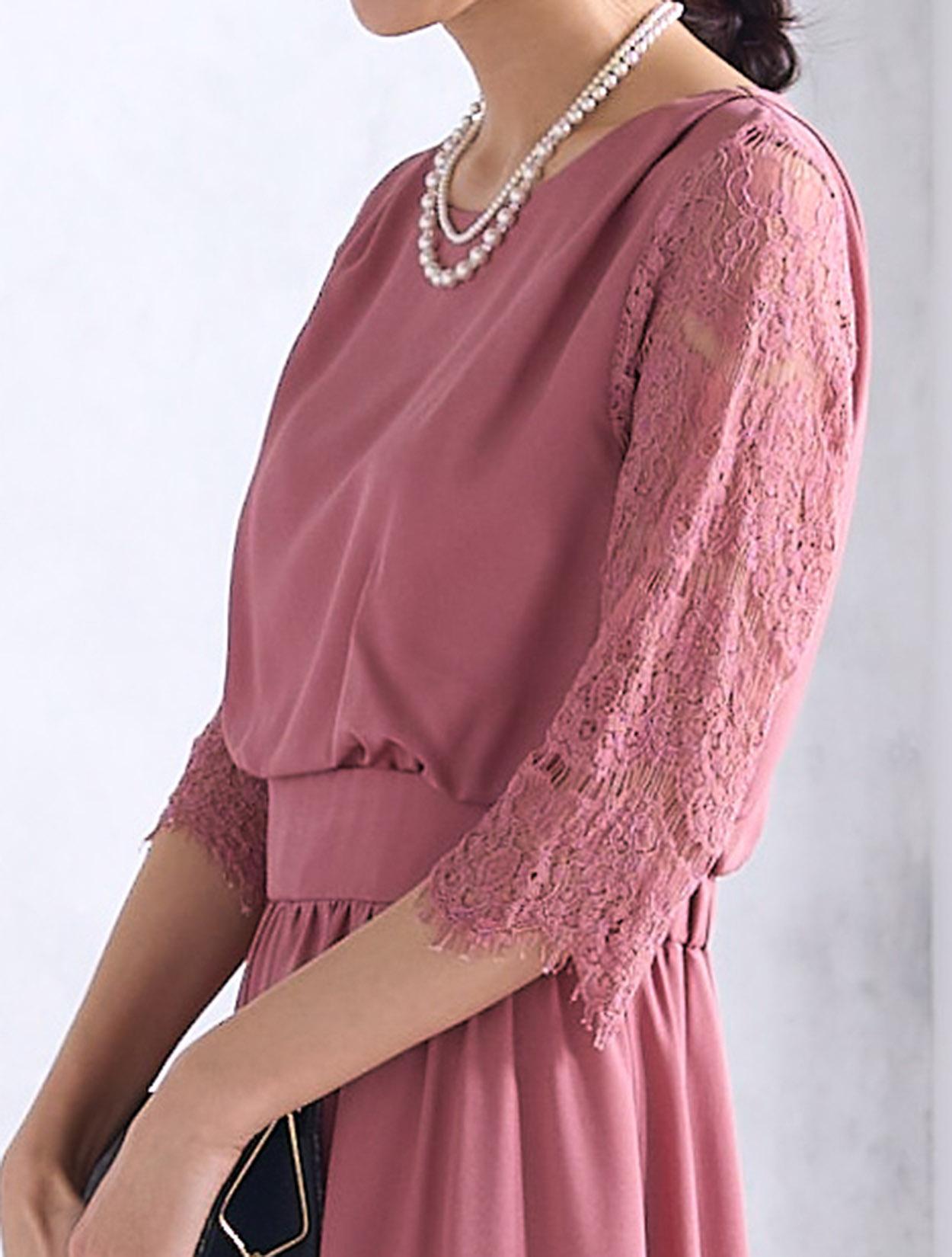 スカラップ調にカッティングされたスカート裾のレースが印象的で、ピンクカラーのドレスを更に可憐に見せてくれるデザインです。スカート裾のレースは透けているので、身長が高くなくてもバランスよく着こなせるロングドレスです。同じレースがお袖にも使用されています。レース糸は細すぎず、腕の透け感が気になる方でも安心です。人気の袖ありドレスは、結婚式でも一枚で安心して着られるのも嬉しいですね。デシン生地は、軽く適度な弾力がありスカートにきれいなドレープを作り出してくれるので、パッと目を引くとても華やかなシルエットです。ウエストマークがあるデザインで、全体にメリハリを出してスタイル良くスッキリ着こなせるのも人気のポイント。背中側のウエストゴム仕様の箇所は、生地が多く使われいてファスナーが上がりずらい場合があります。
