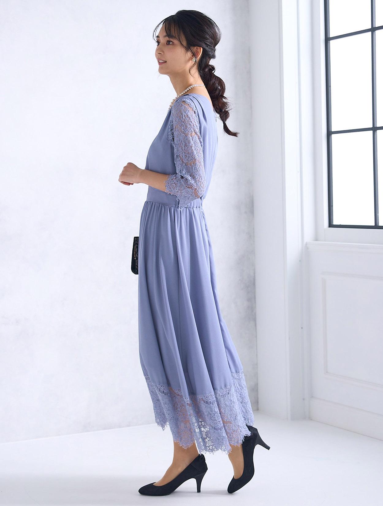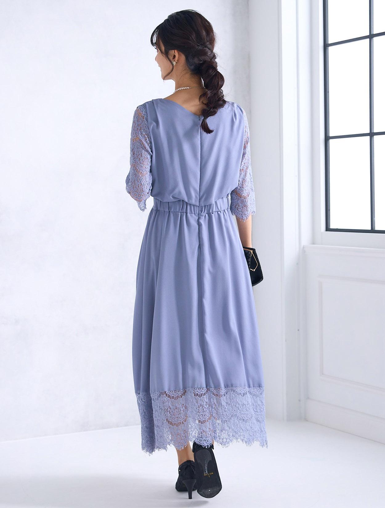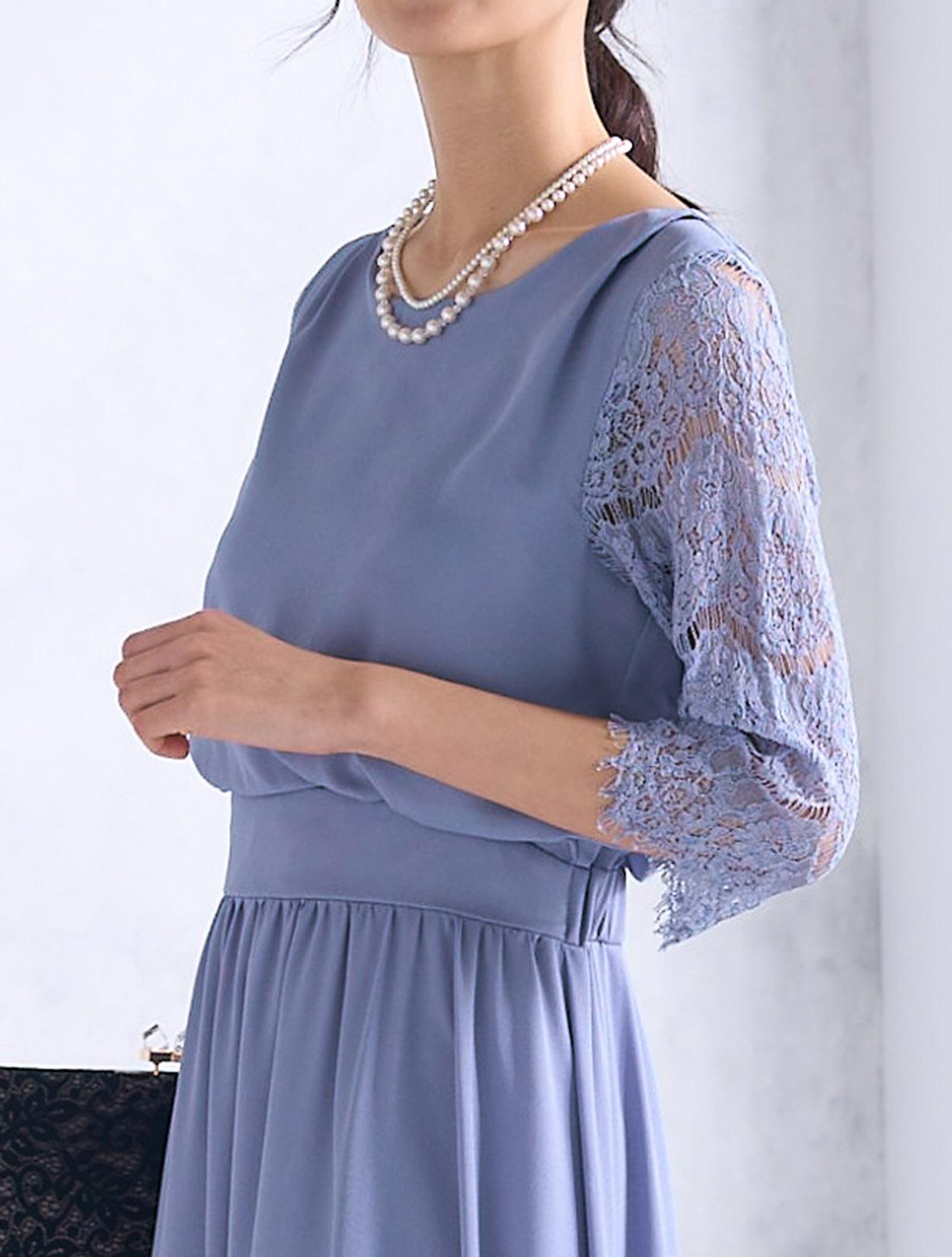 スカラップ調にカッティングされたスカート裾のレースが印象的で、上品なブルーのドレスに可憐さをプラスしてくれるデザインです。スカート裾のレースは透けているので、身長が高くなくてもバランスよく着こなせるロングドレスです。同じレースがお袖にも使用されています。レース糸は細すぎず、腕の透け感が気になる方でも安心です。人気の袖ありドレスは、結婚式でも一枚で安心して着られるのも嬉しいですね。デシン生地は、軽く適度な弾力がありスカートにきれいなドレープを作り出してくれるので、パッと目を引くとても華やかなシルエットです。ウエストマークがあるデザインで、全体にメリハリを出してスタイル良くスッキリ着こなせるのも人気のポイント。背中側のウエストゴム仕様の箇所は、生地が多く使われいてファスナーが上がりずらい場合があります。