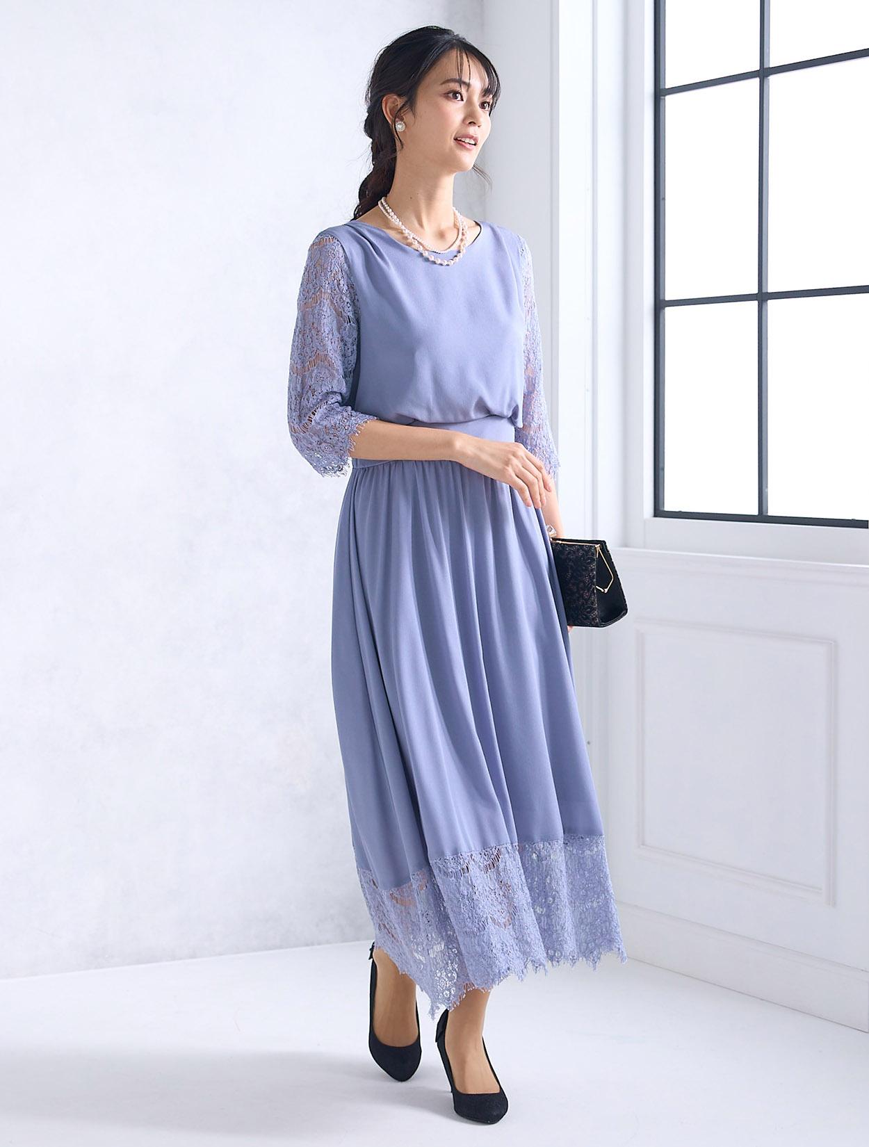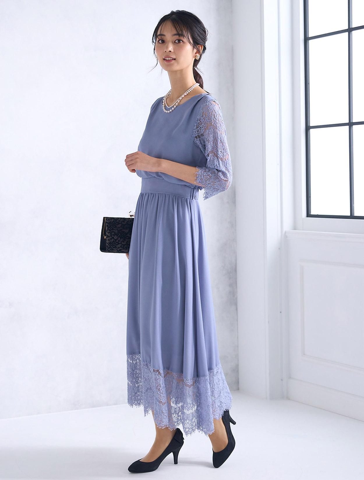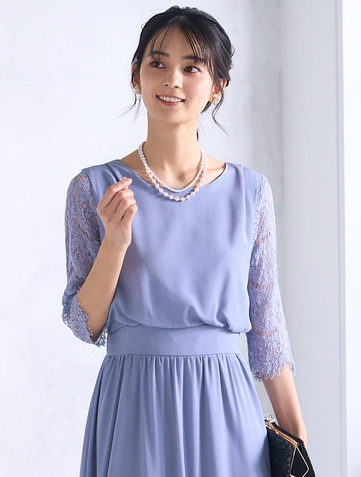スカラップ調にカッティングされたスカート裾のレースが印象的で、上品なブルーのドレスに可憐さをプラスしてくれるデザインです。スカート裾のレースは透けているので、身長が高くなくてもバランスよく着こなせるロングドレスです。同じレースがお袖にも使用されています。レース糸は細すぎず、腕の透け感が気になる方でも安心です。人気の袖ありドレスは、結婚式でも一枚で安心して着られるのも嬉しいですね。デシン生地は、軽く適度な弾力がありスカートにきれいなドレープを作り出してくれるので、パッと目を引くとても華やかなシルエットです。ウエストマークがあるデザインで、全体にメリハリを出してスタイル良くスッキリ着こなせるのも人気のポイント。背中側のウエストゴム仕様の箇所は、生地が多く使われいてファスナーが上がりずらい場合があります。