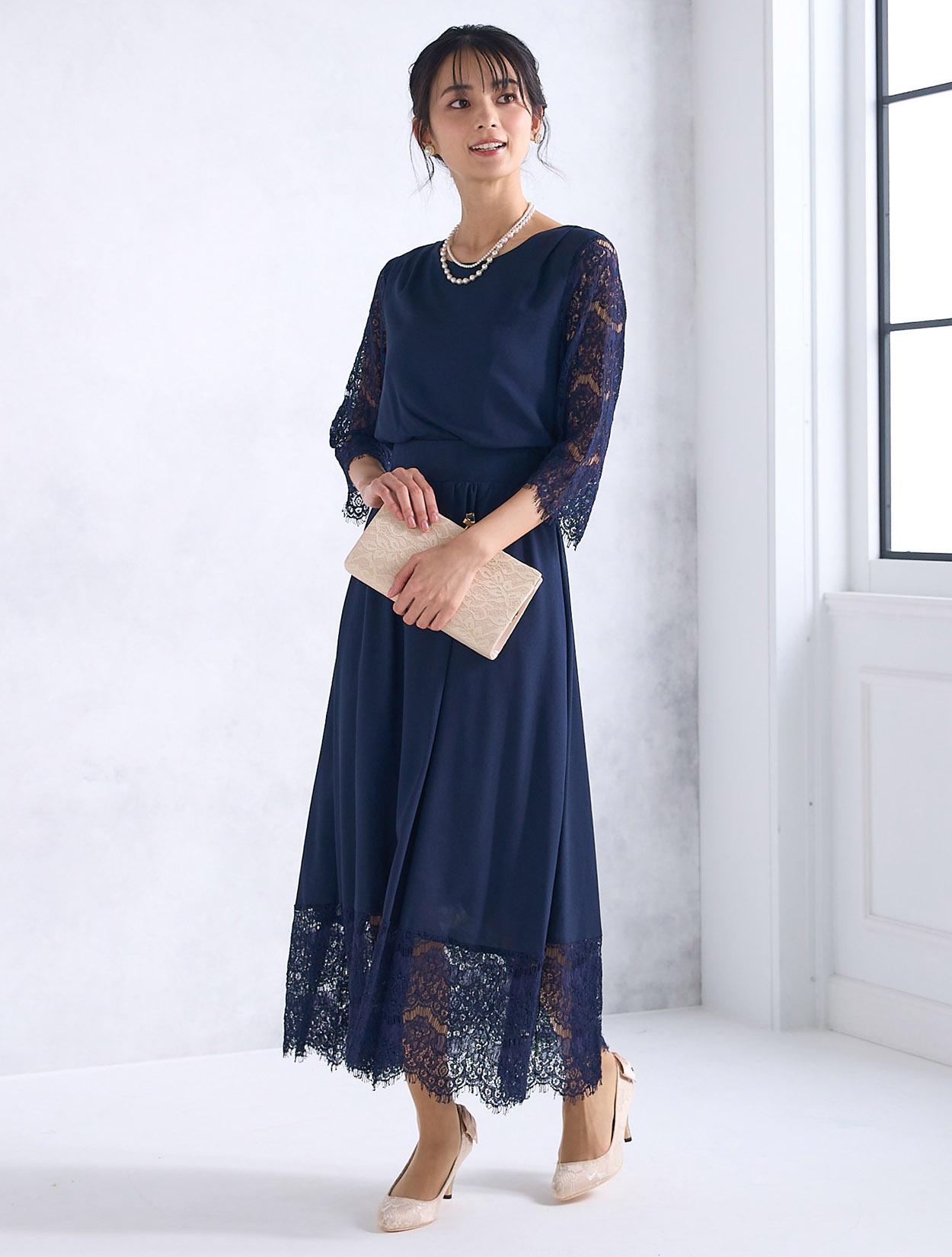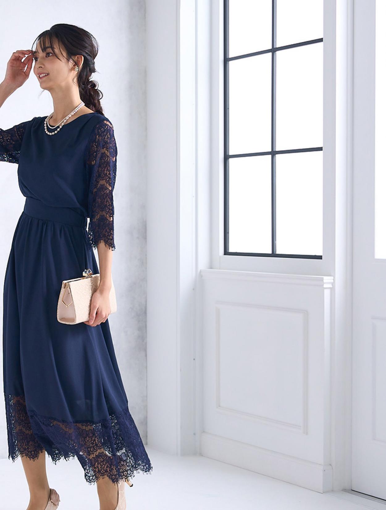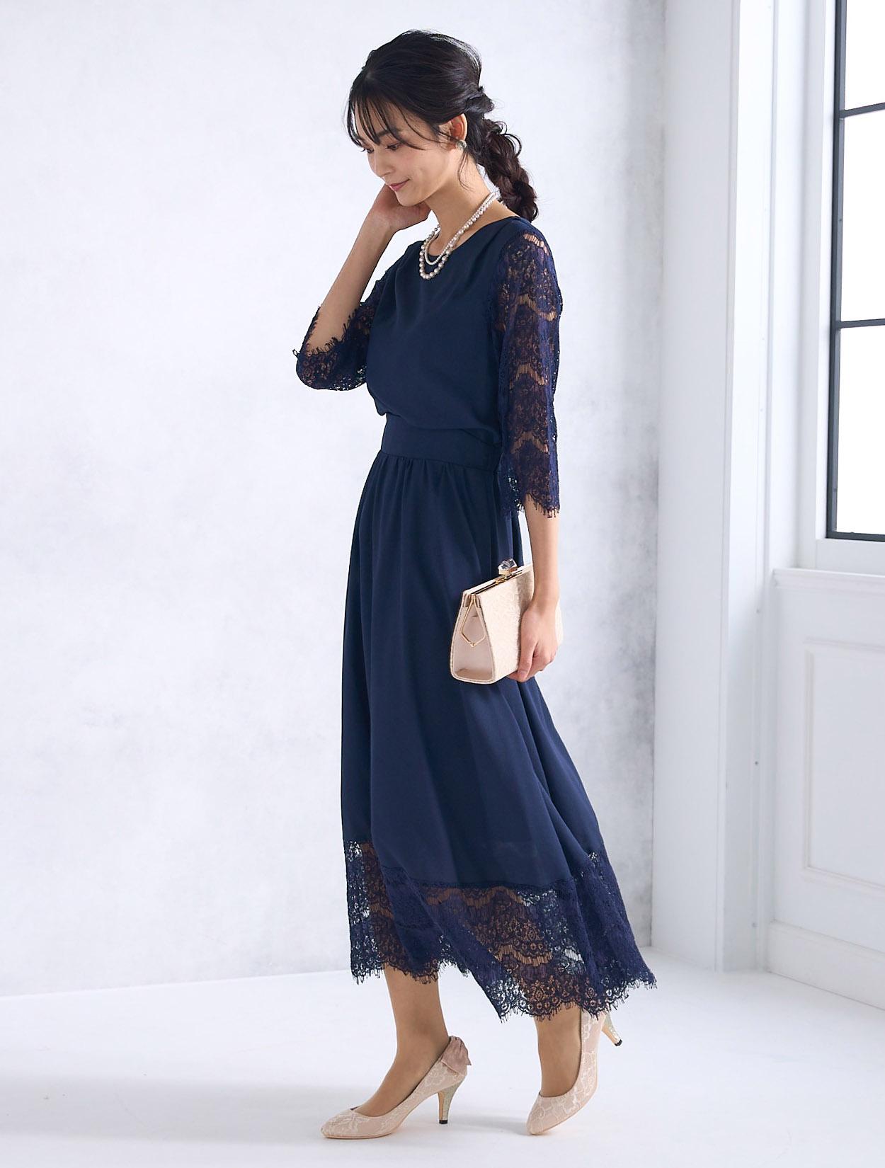 ベージュのレースバッグ合わせた柔らかい雰囲気の上品コーディネート。かちっと見えがちなネイビードレスもフェミニンな印象で着こなせます。ご親族にもおすすめのドレスコーデです。
