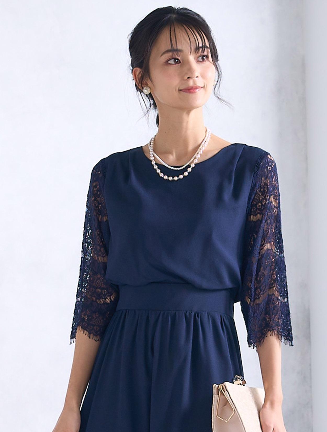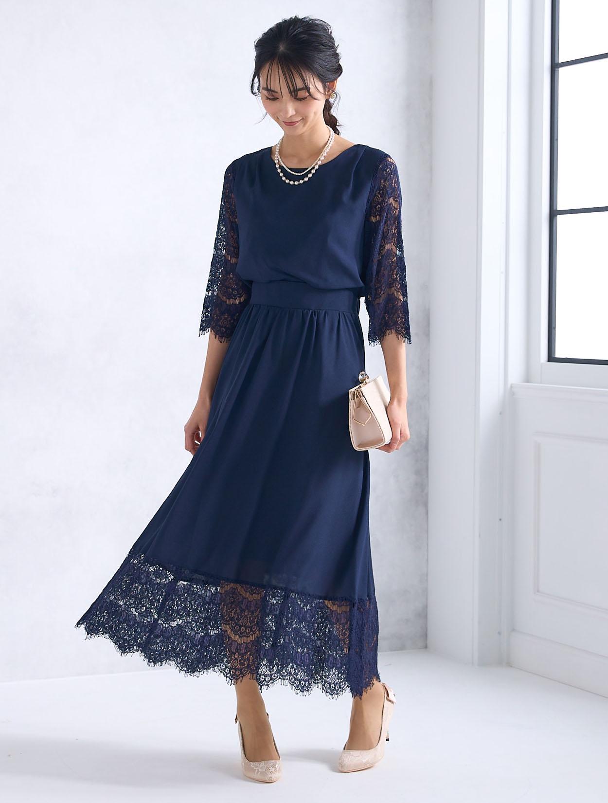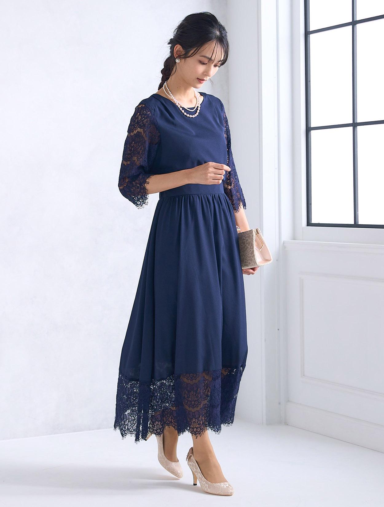 ベージュのレースバッグ合わせた柔らかい雰囲気の上品コーディネート。かちっと見えがちなネイビードレスもフェミニンな印象で着こなせます。ご親族にもおすすめのドレスコーデです。